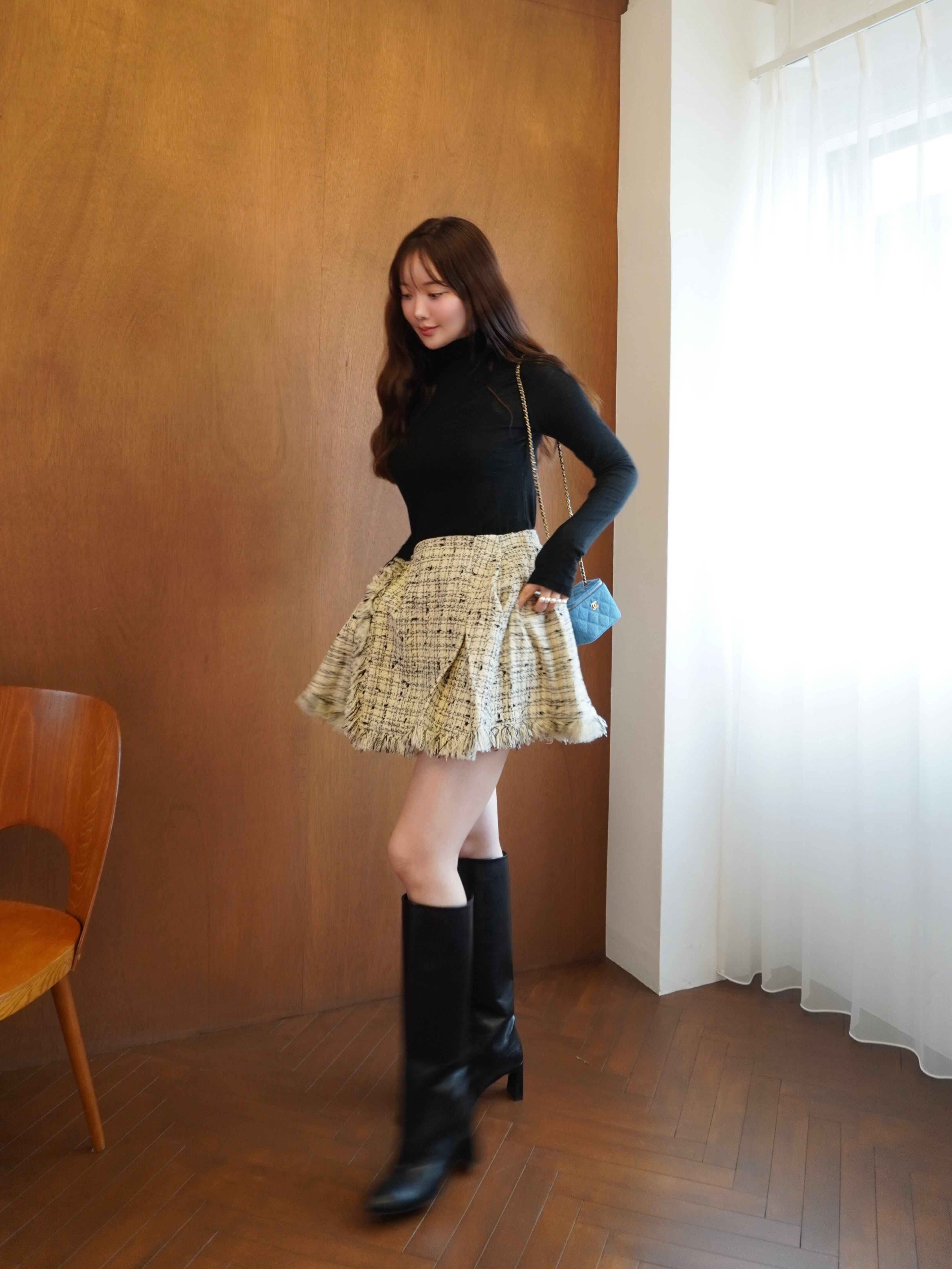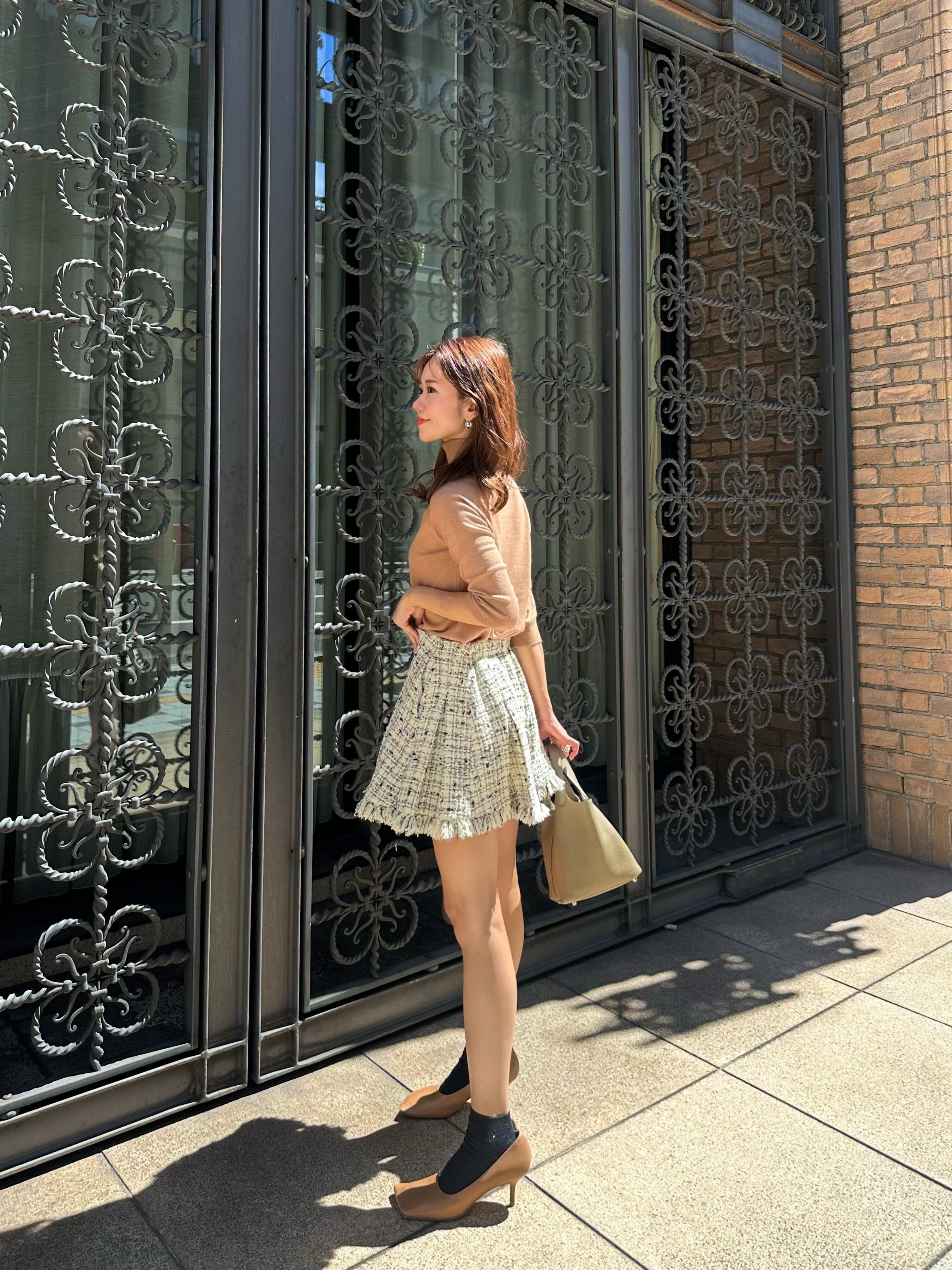 イタリアのインポート素材を用いたツイードラップキュロット。前から見るとAラインのラップミニスカート。構造は動きやすいショートパンツという“装いつつアクティブ”を叶える一着。前端と裾にはフリンジ加工を施し、揺れるたびに軽やかなアクセントをプラス。プリーツを入れることで美しい立体感が生まれ、脚長効果も。スラリと見えるシルエットは、モードと遊び心をバランスよく融合し、可愛らしさを添えつつ洗練された印象を与えます。ウエスト後ろはゴム仕様で楽な履き心地ながら、前開きコンシールファスナー付きで着脱もスマートに仕上げました。単品使いはもちろん、同素材のジレとのセットアップもおすすめです。