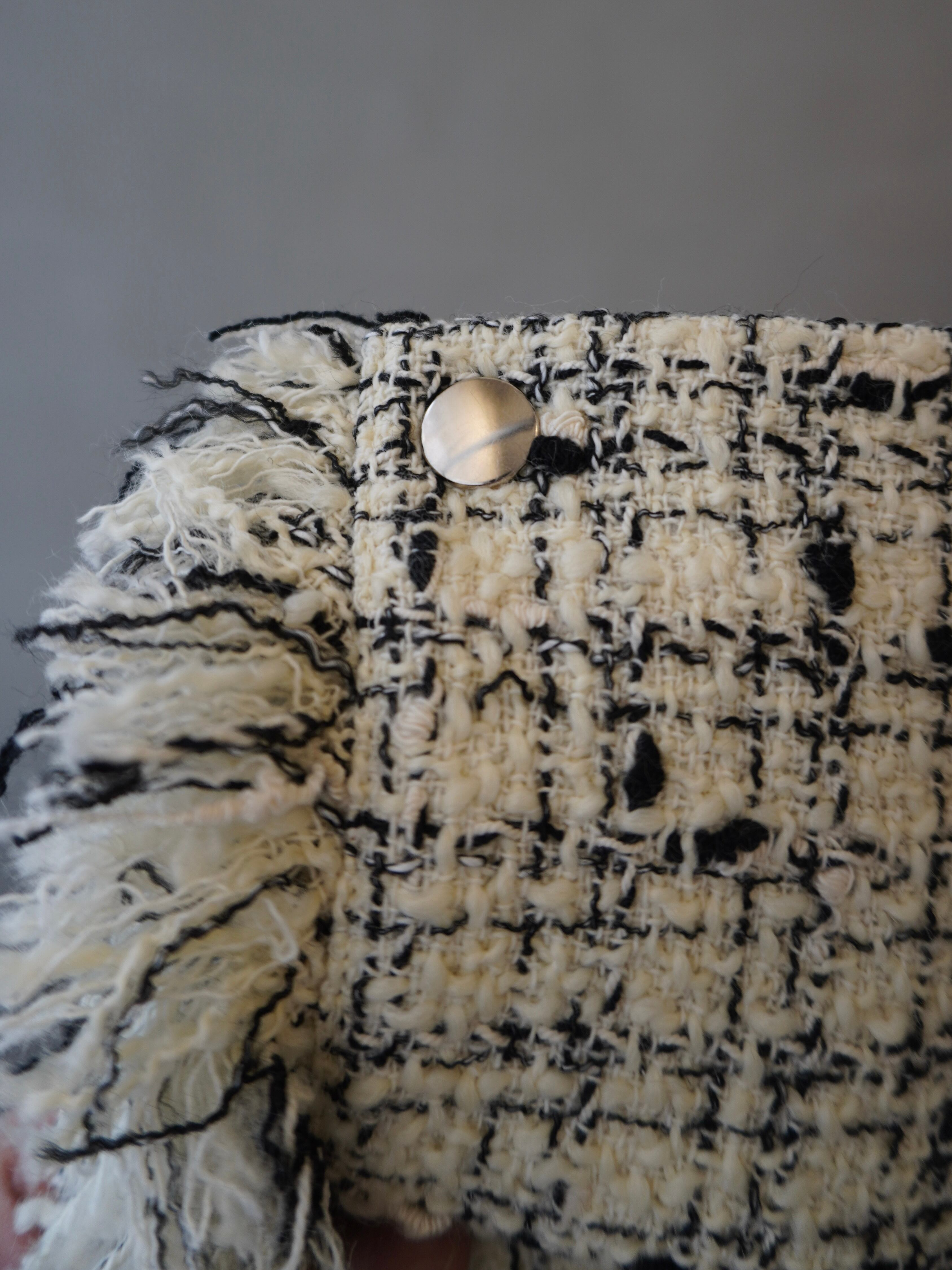 素材は、肉厚でしっかりした質感がありつつ、意匠糸の織りによる立体的な表情が特徴です。モノトーンカラーながら、ツイードならではのニュアンス豊かな“ファンシーなクラシカル感”を演出し、インポートならではの奥深い素材美を感じる素材となります。ご自宅でのお洗濯も可能です。(手洗い推奨)