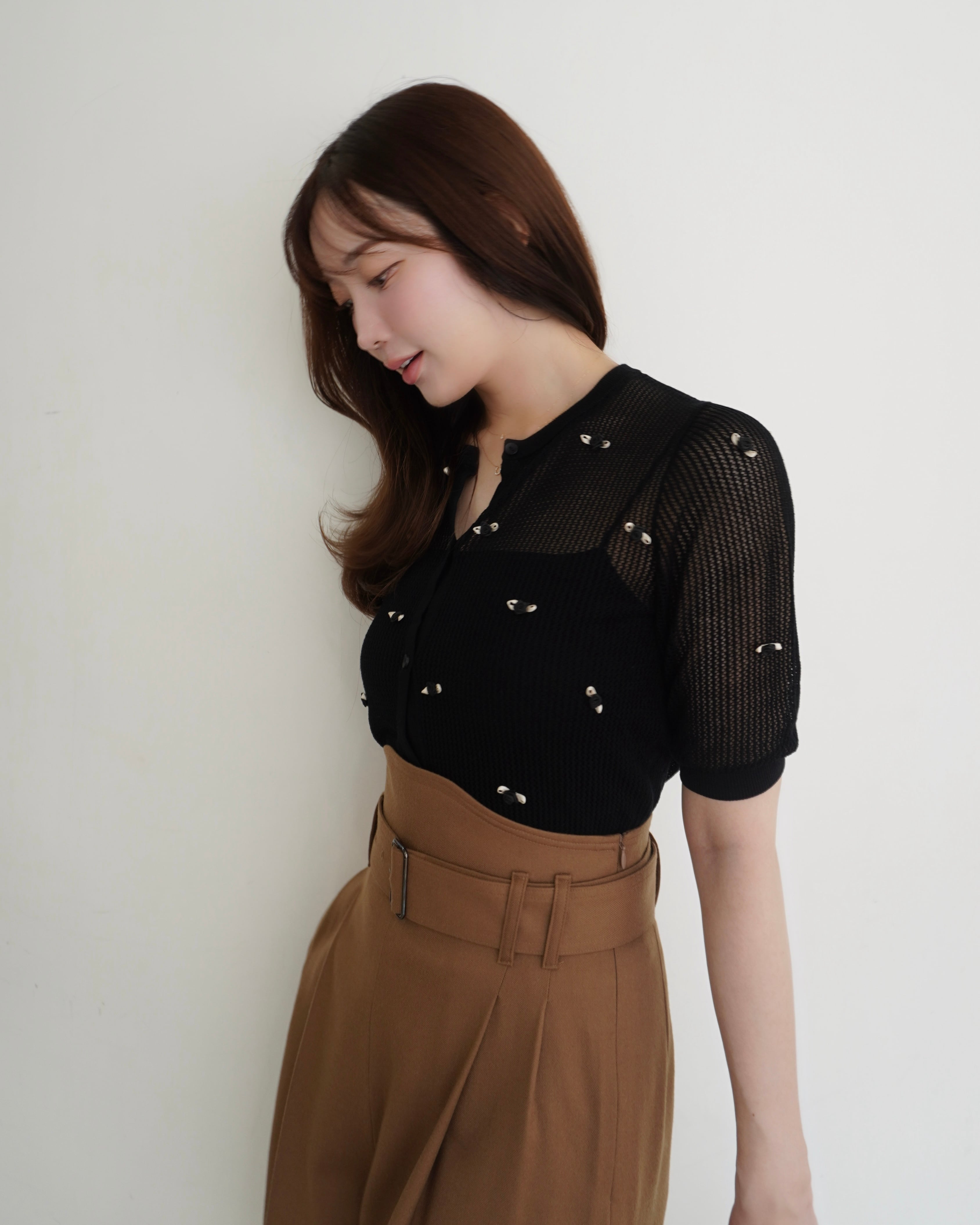 HYEONオリジナルの花柄が女性らしいメッシュ編みカーディガン。秋にかけて使いやすい5分袖カーディガンは、トップスとしてはもちろん、羽織りとしても幅広いスタイリングに活躍してくれます。花柄は、花びらや葉の色彩を丁寧に選び抜き、職人の手作業でひとつずつモチーフをあしらいました。女性らしい繊細さと、計算された洗練された輪郭が同居するデザインは、1枚で装いを完成させる存在感を放ちます。