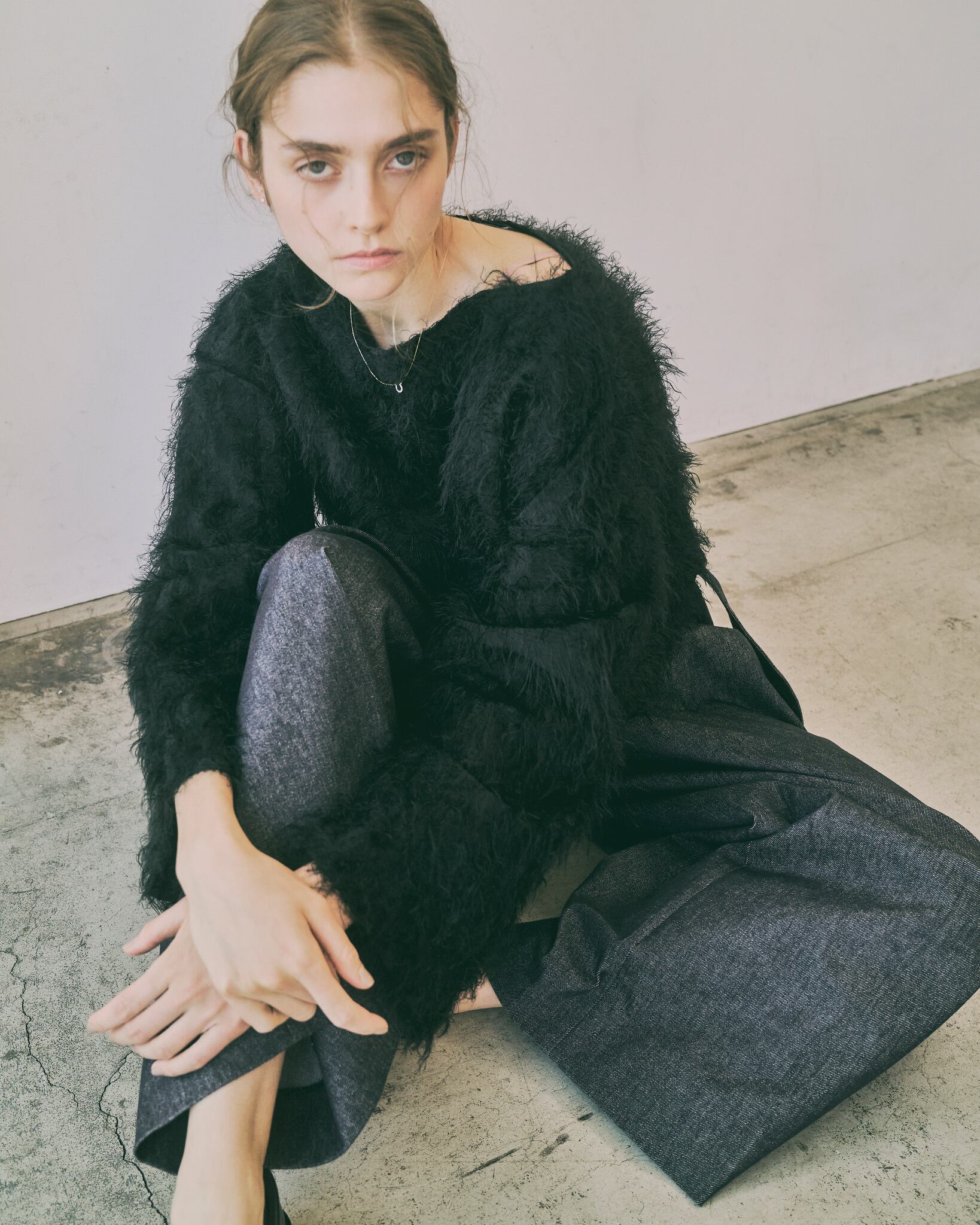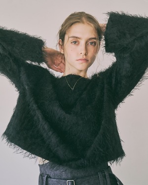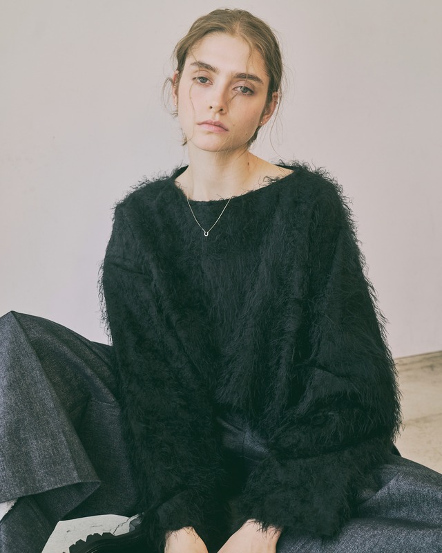 素材は、非常に柔らかいシャギーを使用しており、肌触りは抜群。軽やかでふんわりとした質感が、着心地の良さと上品さを両立します。シャギー素材ならではの立体感が、シンプルなデザインにも表情を与え、1枚で洗練された印象に。ご自宅でのお洗濯も可能です(手洗い推奨)こちらの商品はmade in japanのアイテムとなります。