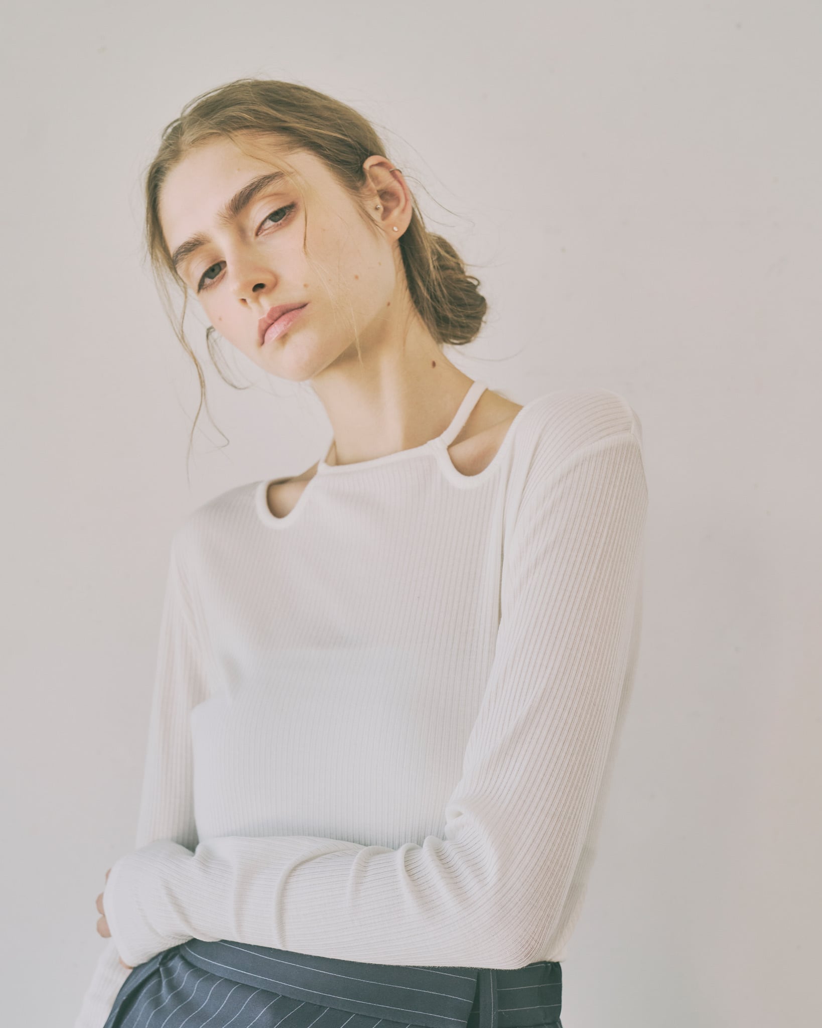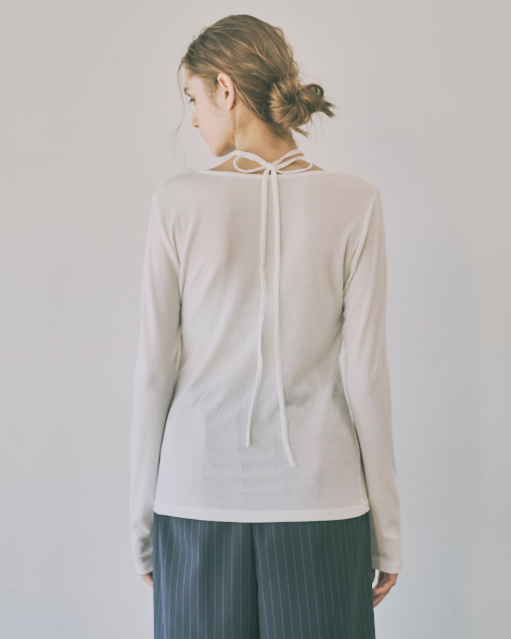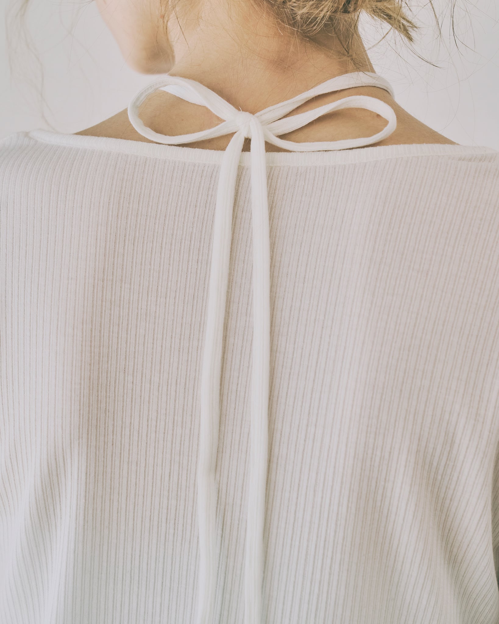 首元のチョーカー風のリボンディティールがポイントのプルオーバー。首元にデザインされたチョーカー風のデザインが、さりげなく顔周りを華やかに演出します。着丈や身幅はベーシックで使いやすく、デイリーコーデにもすっと馴染むシルエットに仕上げました。