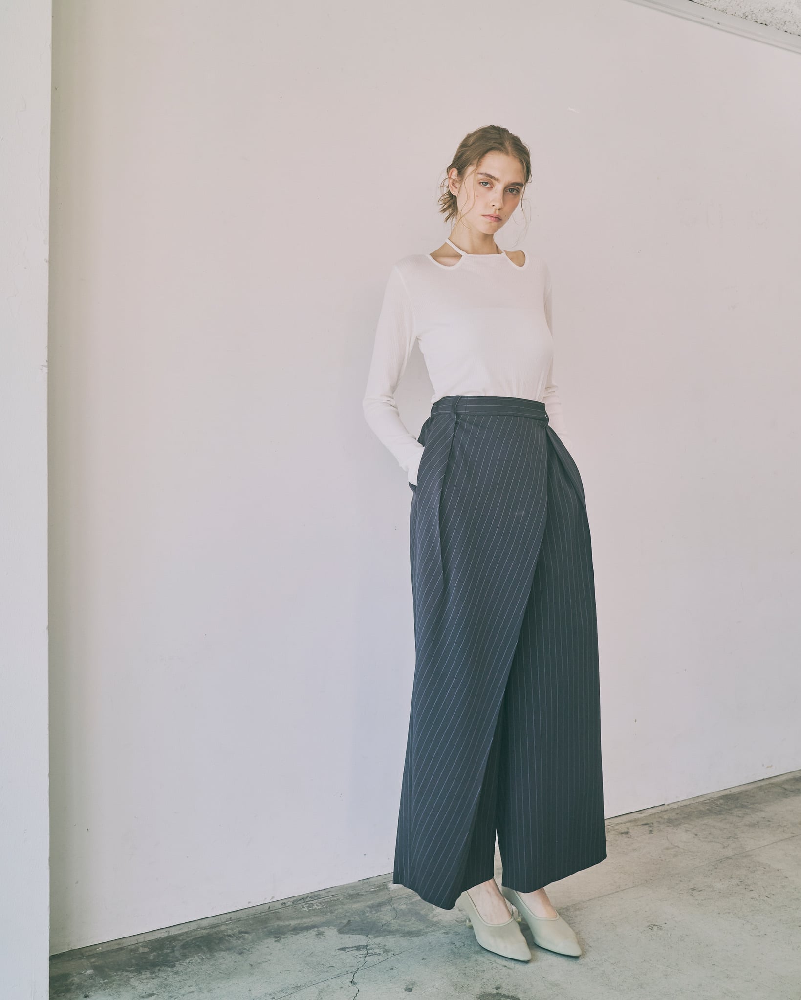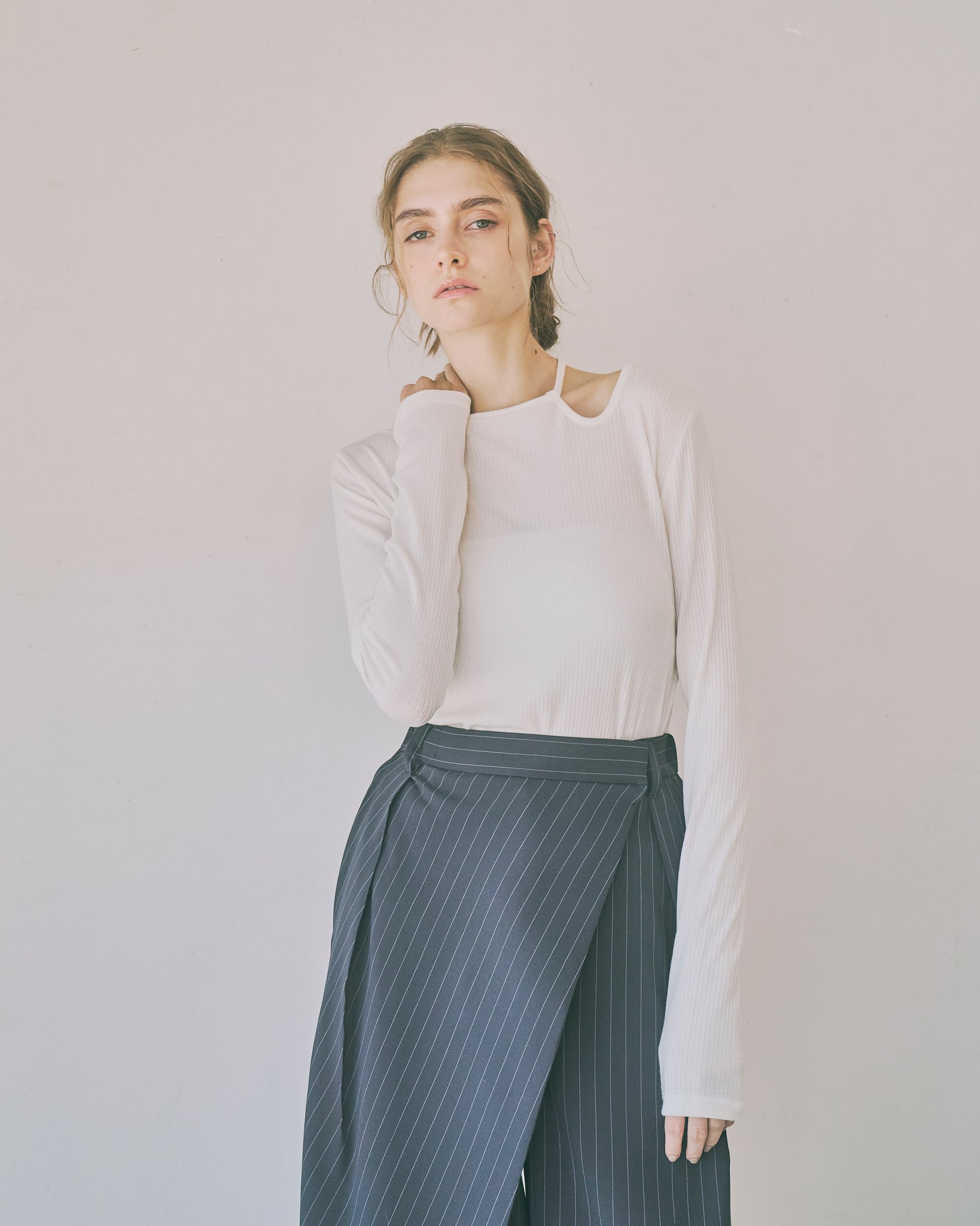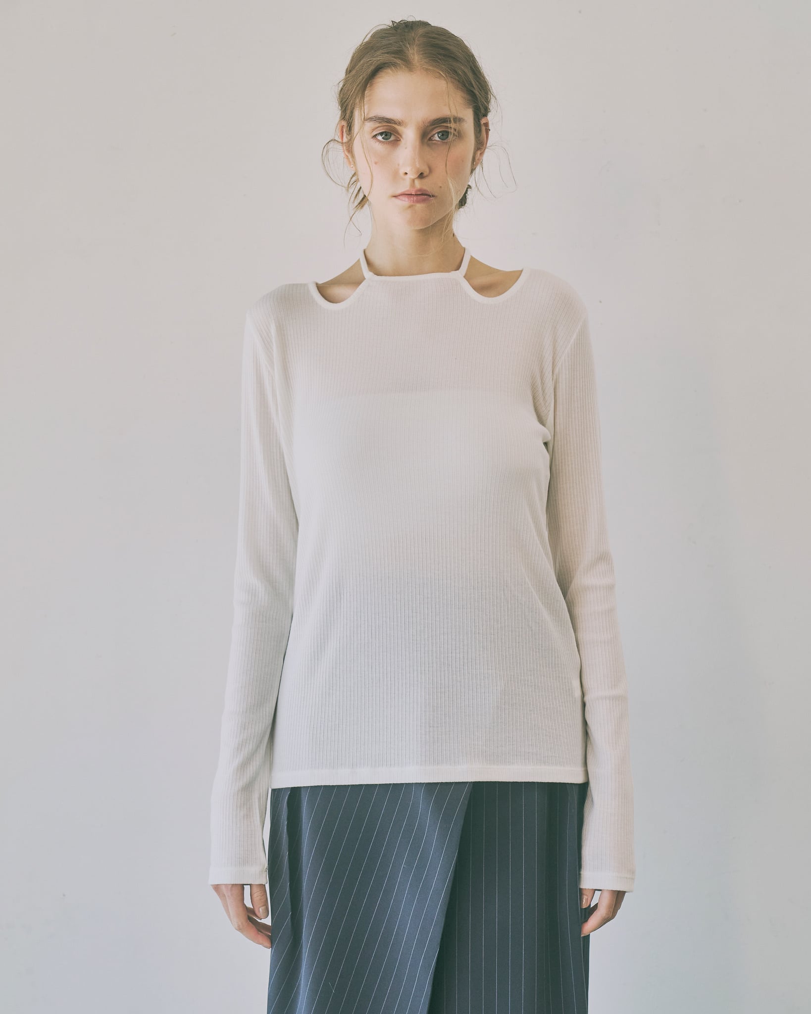 首元のチョーカー風のリボンディティールがポイントのプルオーバー。首元にデザインされたチョーカー風のデザインが、さりげなく顔周りを華やかに演出します。着丈や身幅はベーシックで使いやすく、デイリーコーデにもすっと馴染むシルエットに仕上げました。