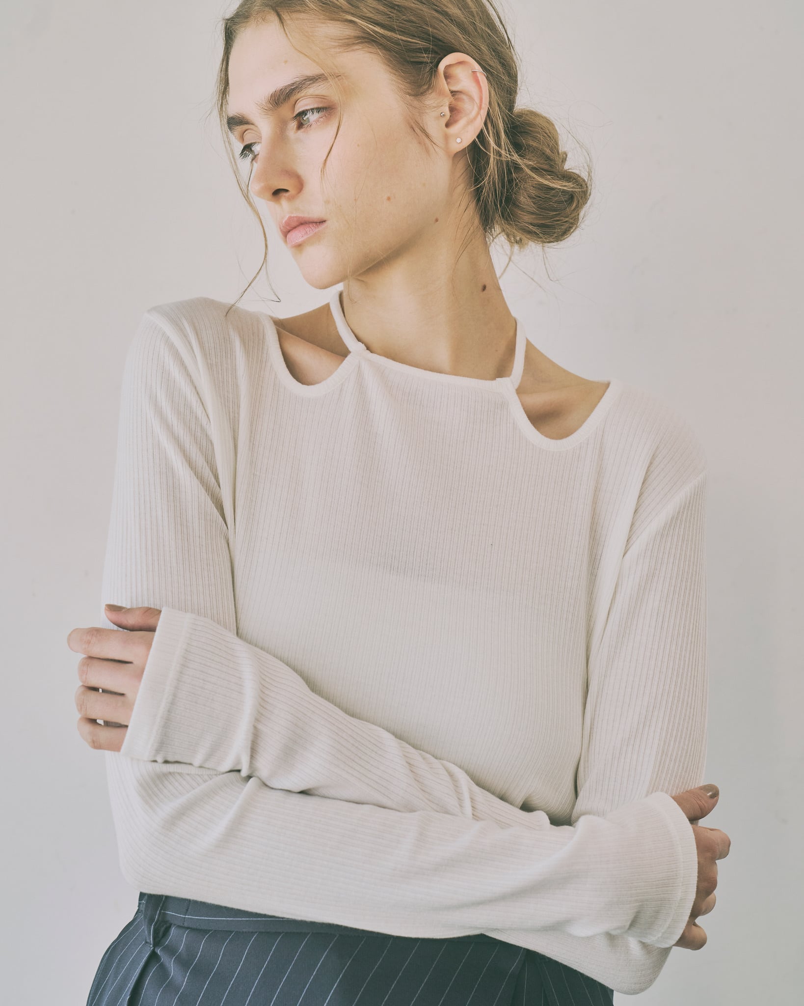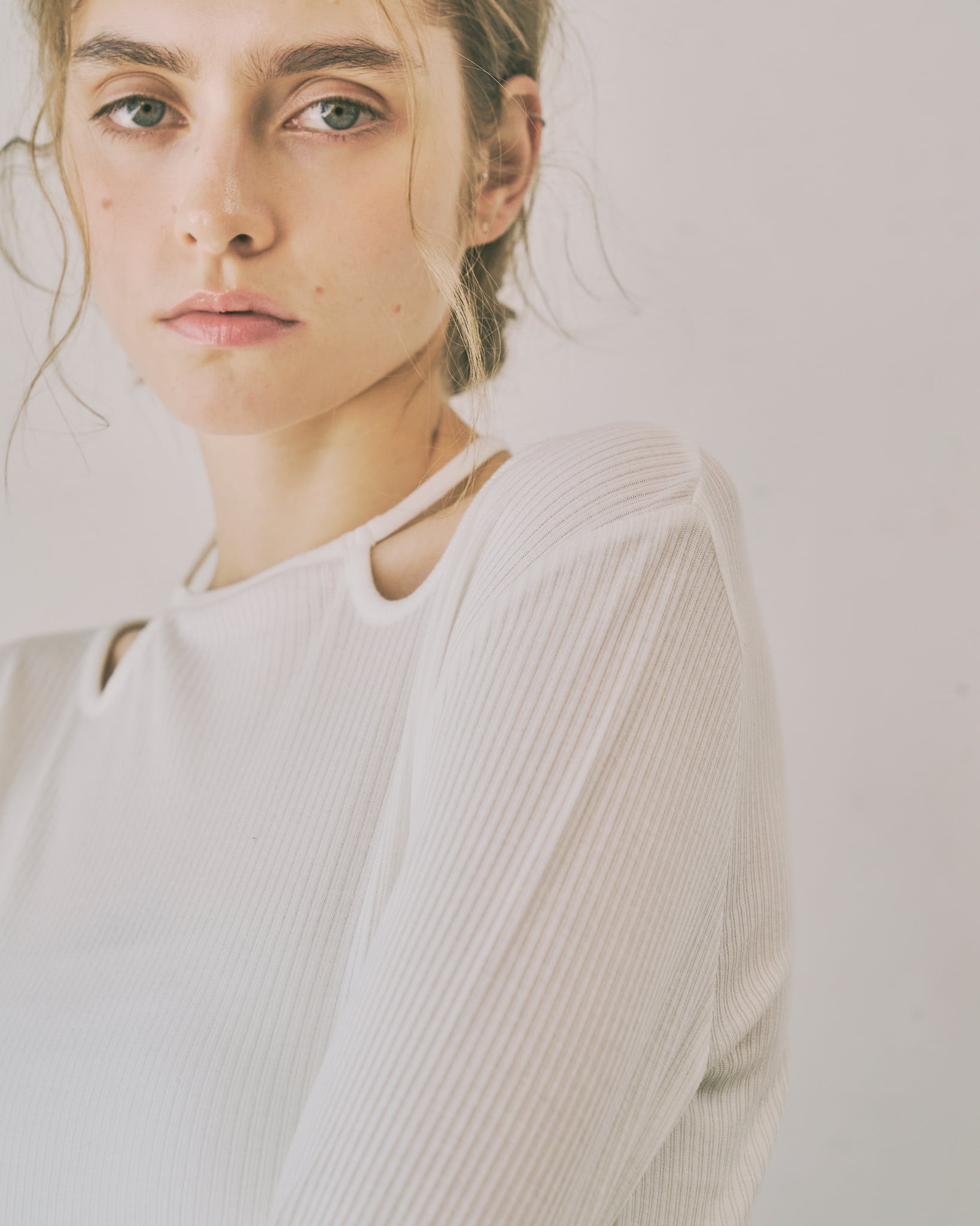 素材にはカシミヤとシルクを配合した極上のテレコ素材を使用。柔らかな肌触りと程よい伸縮性で、着心地の良さが特徴です。シンプルながらも素材感とディテールで洗練された印象を与える1枚です。ご自宅でのお洗濯も可能です(手洗い推奨)こちらの商品はmade in japanのアイテムとなります。