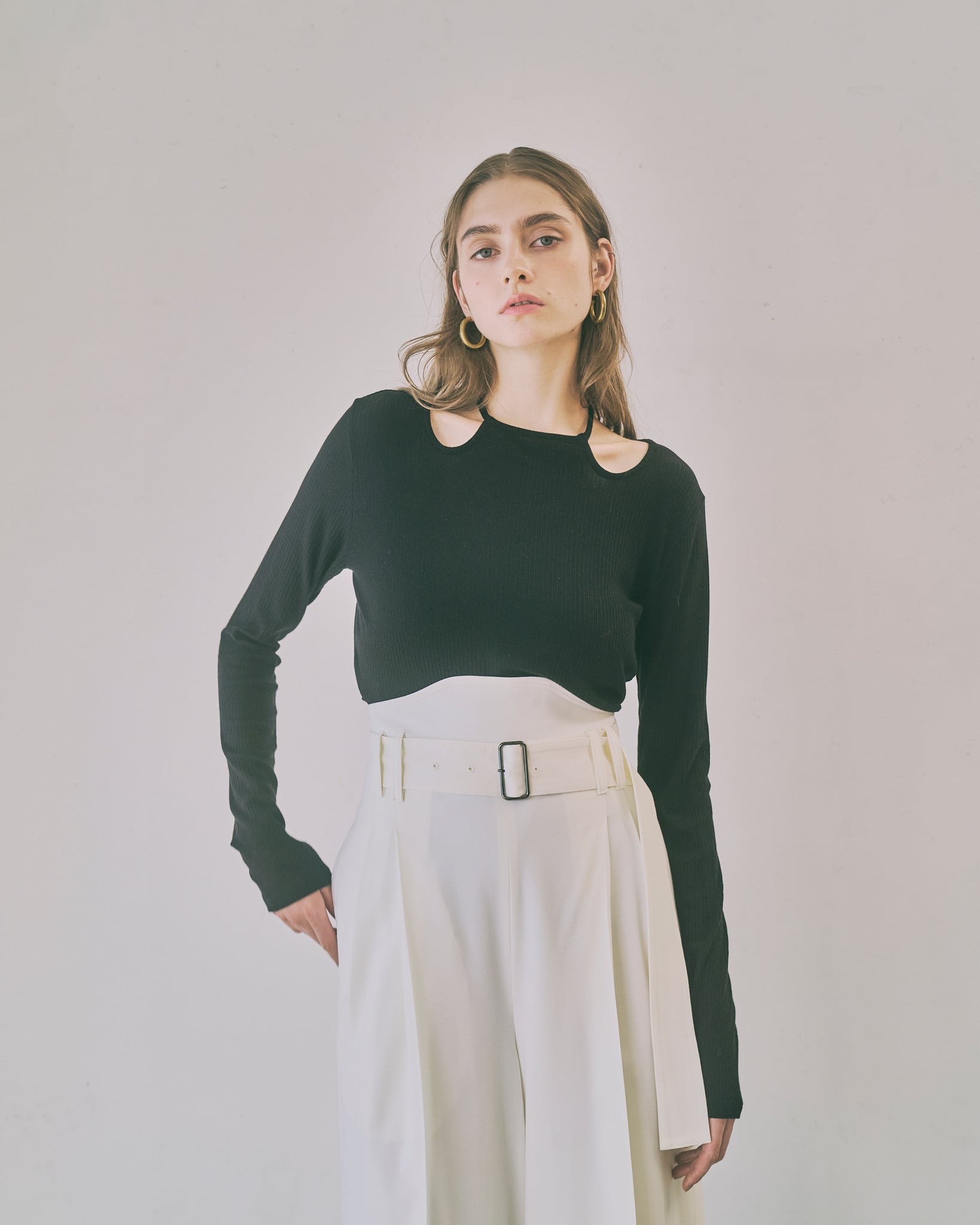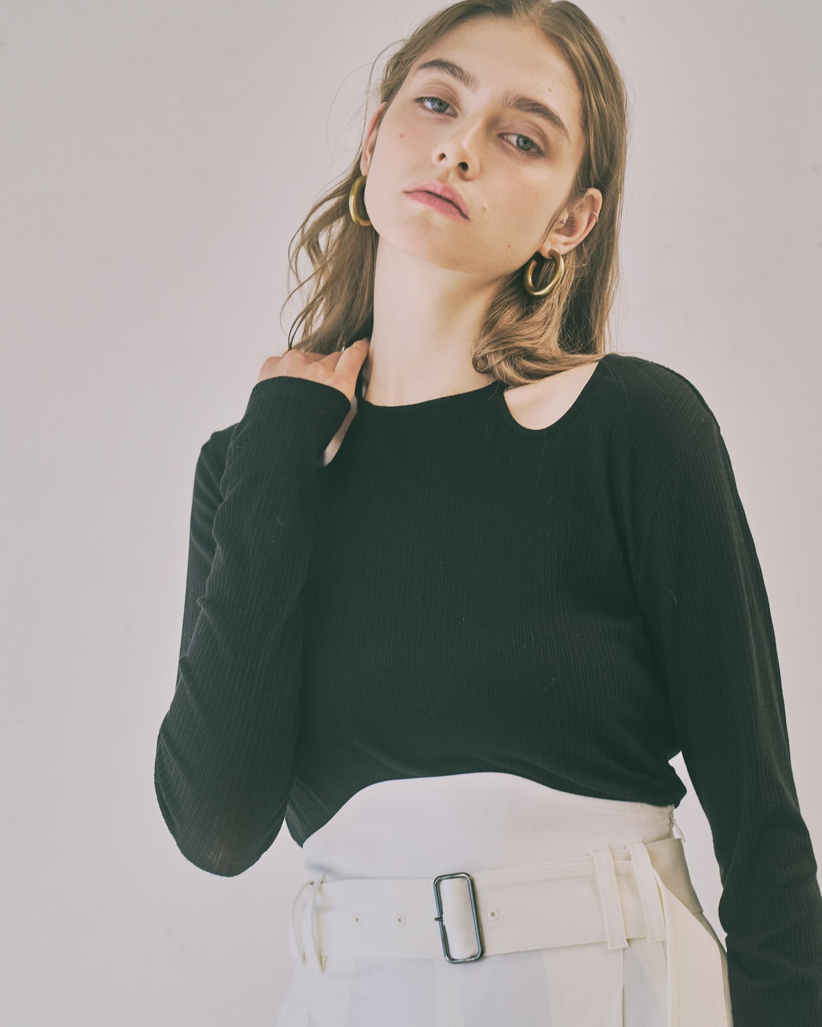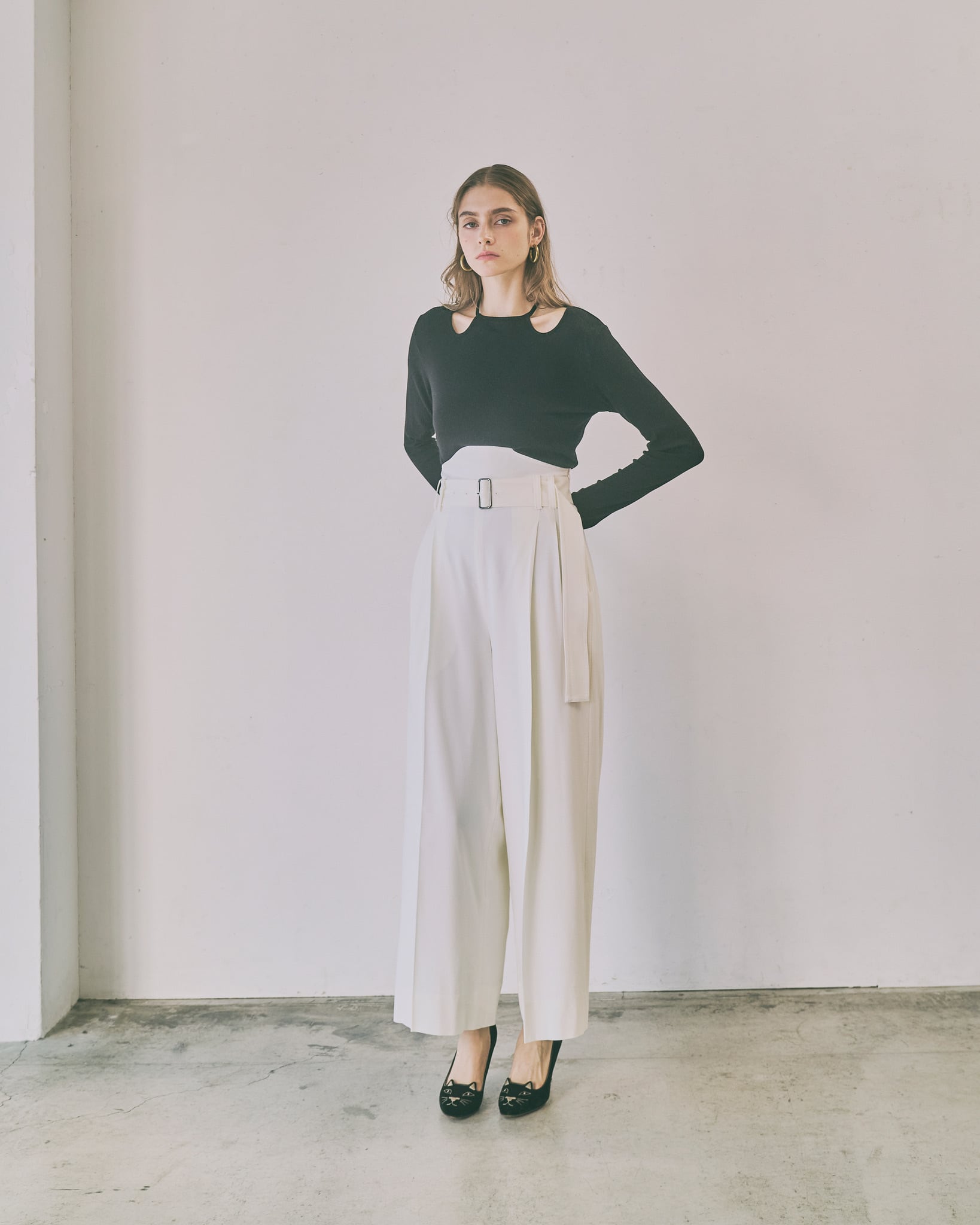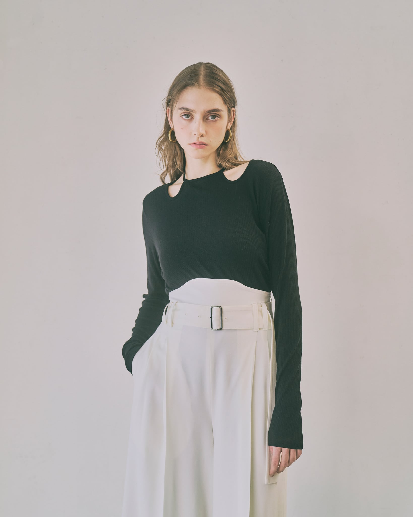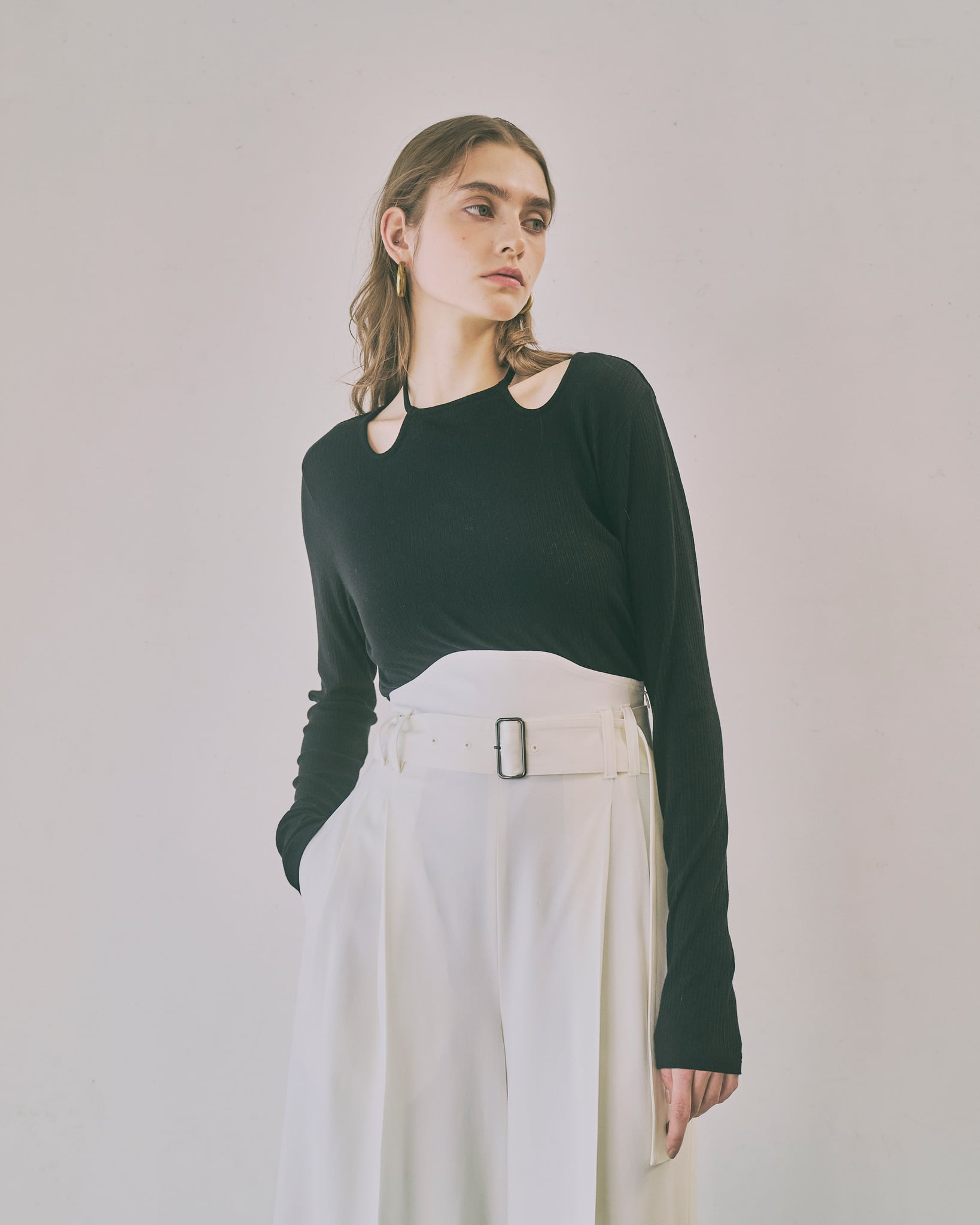 首元のチョーカー風のリボンディティールがポイントのプルオーバー。首元にデザインされたチョーカー風のデザインが、さりげなく顔周りを華やかに演出します。着丈や身幅はベーシックで使いやすく、デイリーコーデにもすっと馴染むシルエットに仕上げました。