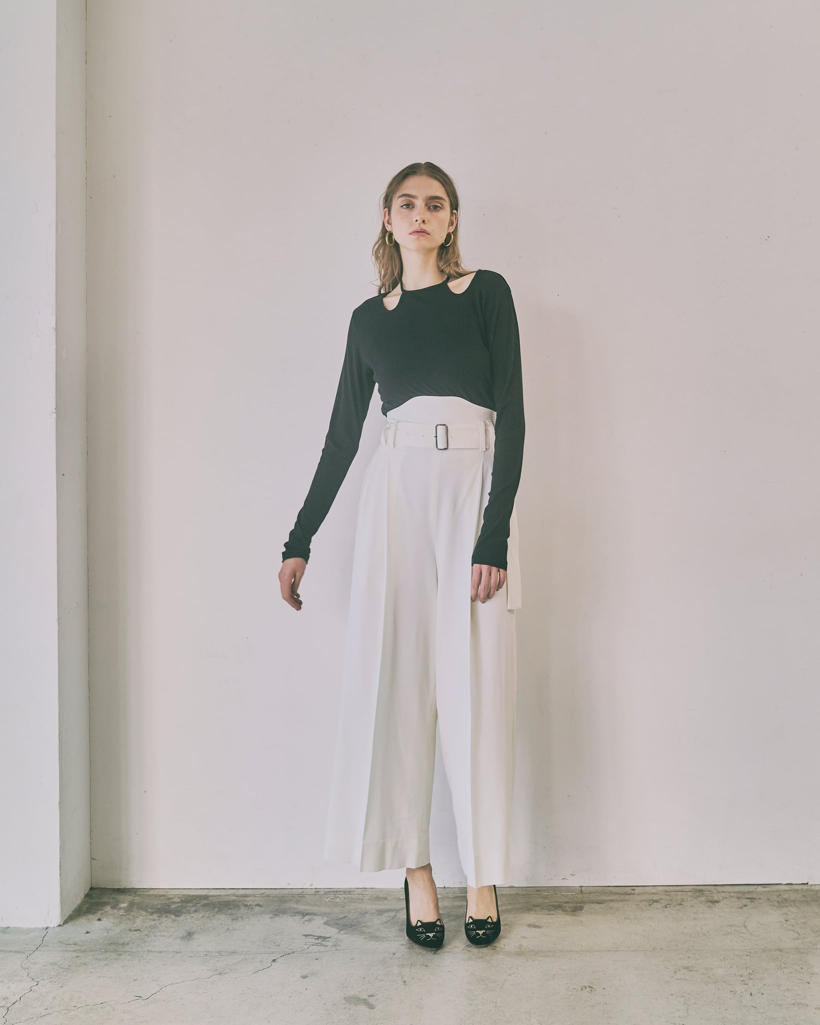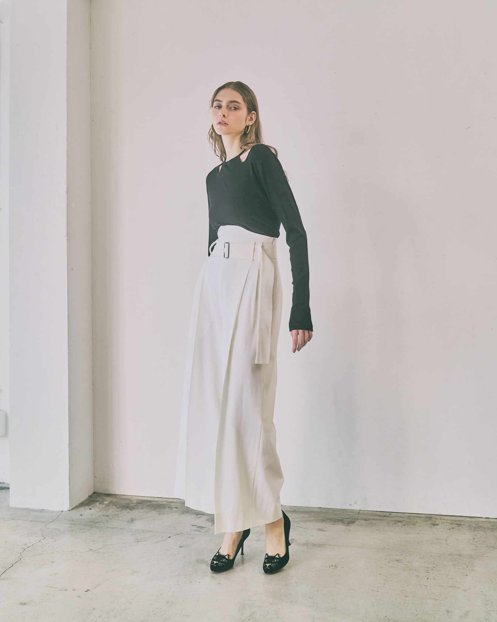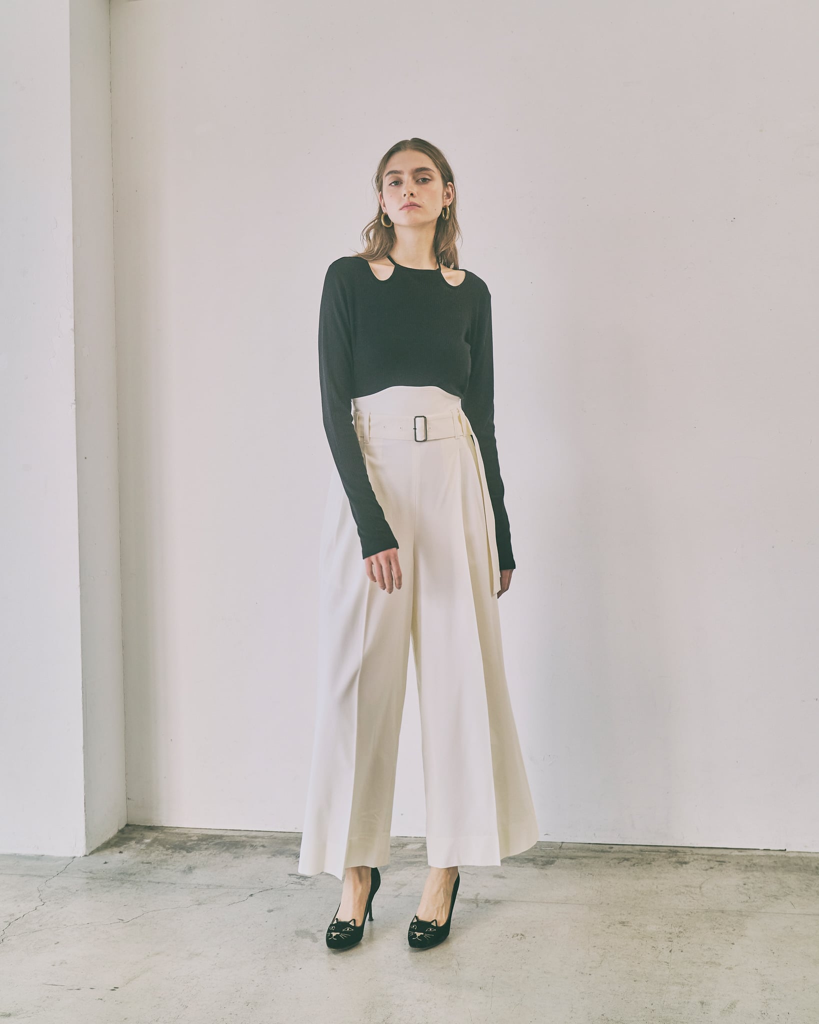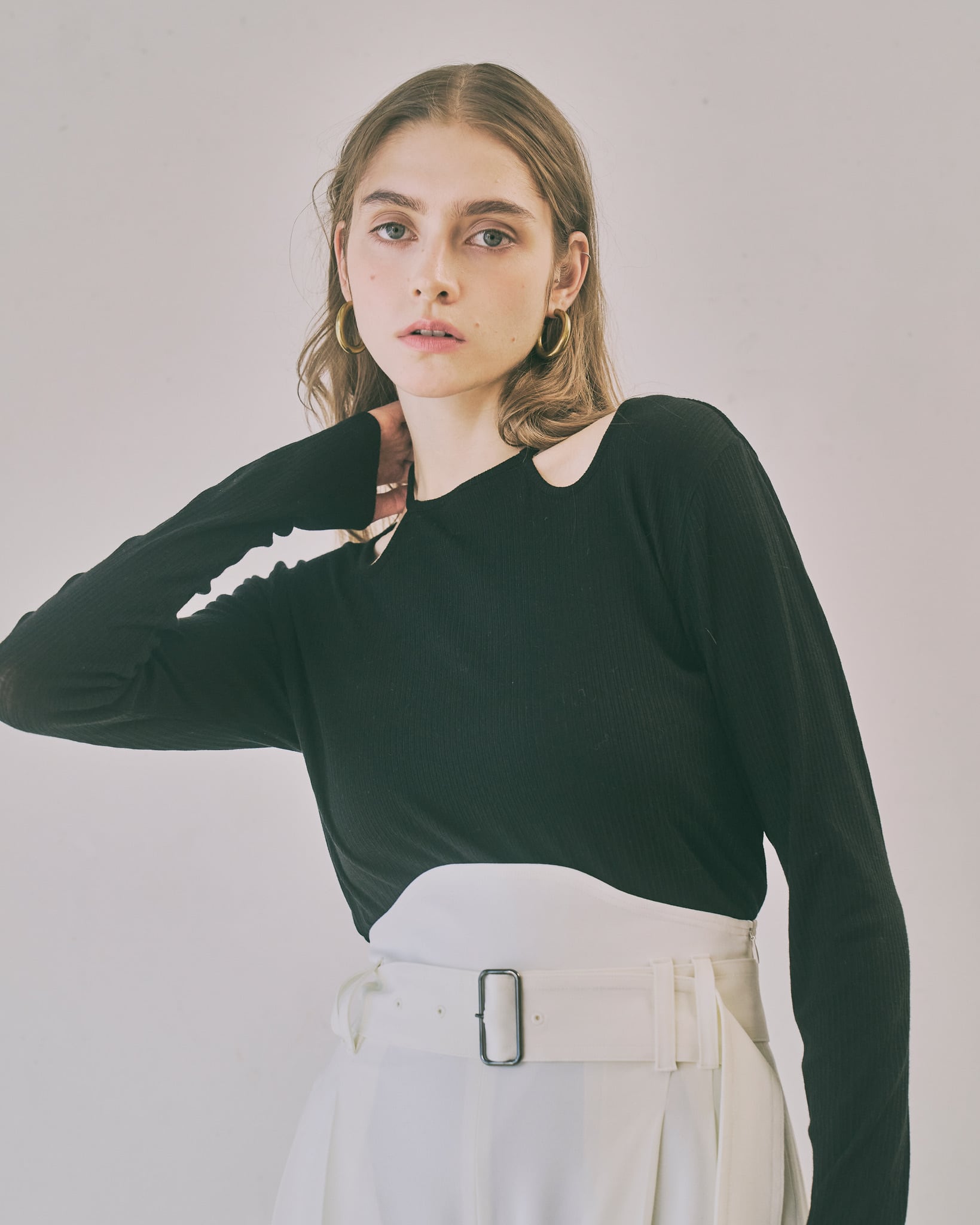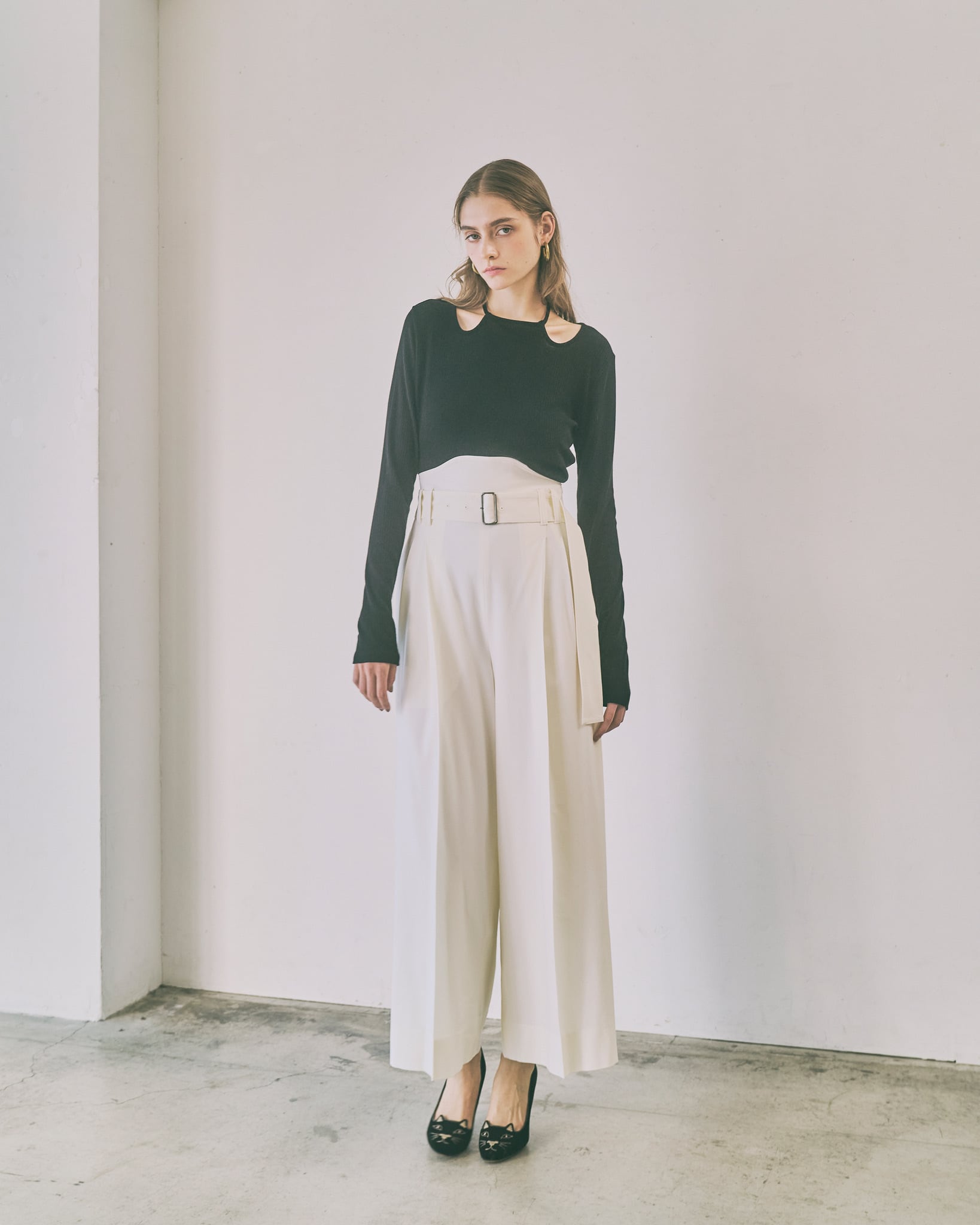 首元のチョーカー風のリボンディティールがポイントのプルオーバー。首元にデザインされたチョーカー風のデザインが、さりげなく顔周りを華やかに演出します。着丈や身幅はベーシックで使いやすく、デイリーコーデにもすっと馴染むシルエットに仕上げました。