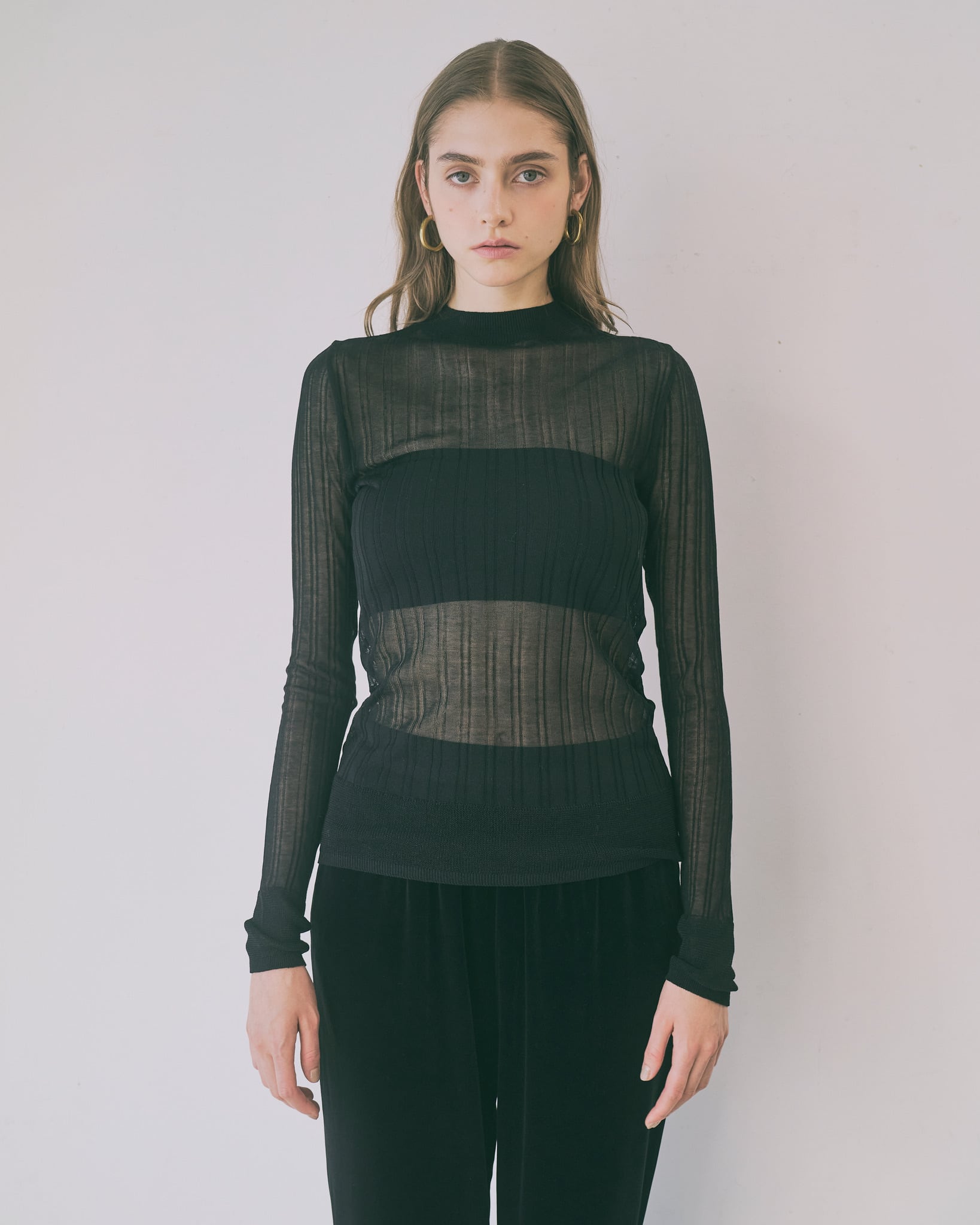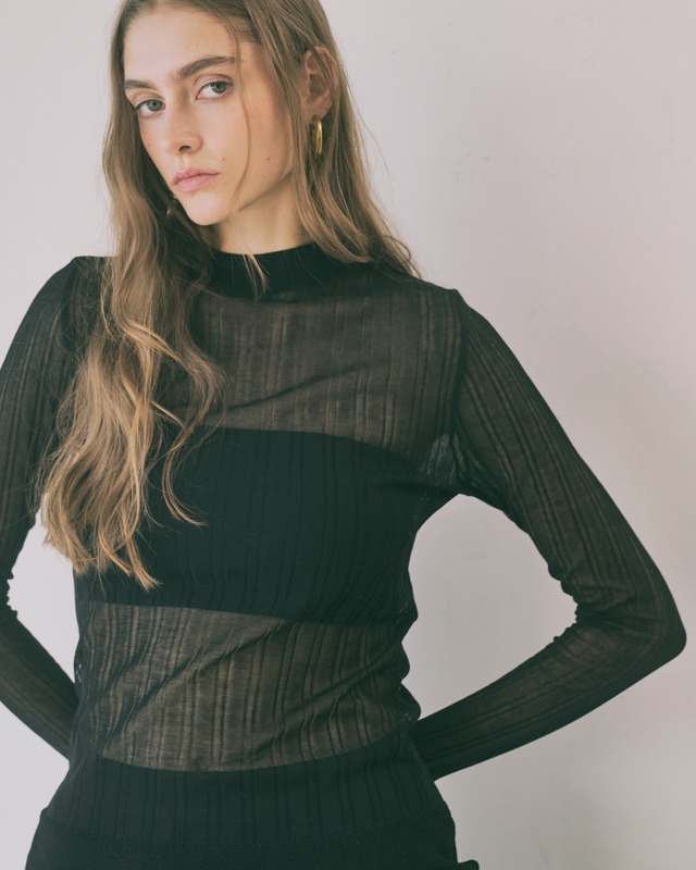 程よい透け感が女性らしいクルーネックデザインのシアーリブニット。着丈や身幅はベーシックに仕上げており、どんなコーディネートにもすっと馴染みます。インナーとしてもトップスとしても幅広く活躍する1枚です。シンプルながらも上品な透け感が、洗練された印象を演出します。