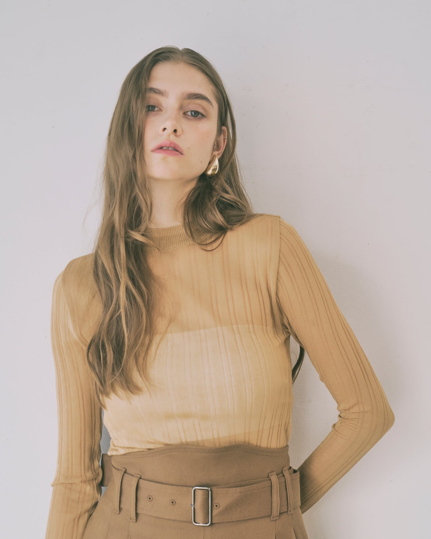 程よい透け感が女性らしいクルーネックデザインのシアーリブニット。着丈や身幅はベーシックに仕上げており、どんなコーディネートにもすっと馴染みます。インナーとしてもトップスとしても幅広く活躍する1枚です。シンプルながらも上品な透け感が、洗練された印象を演出します。