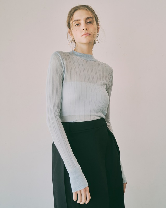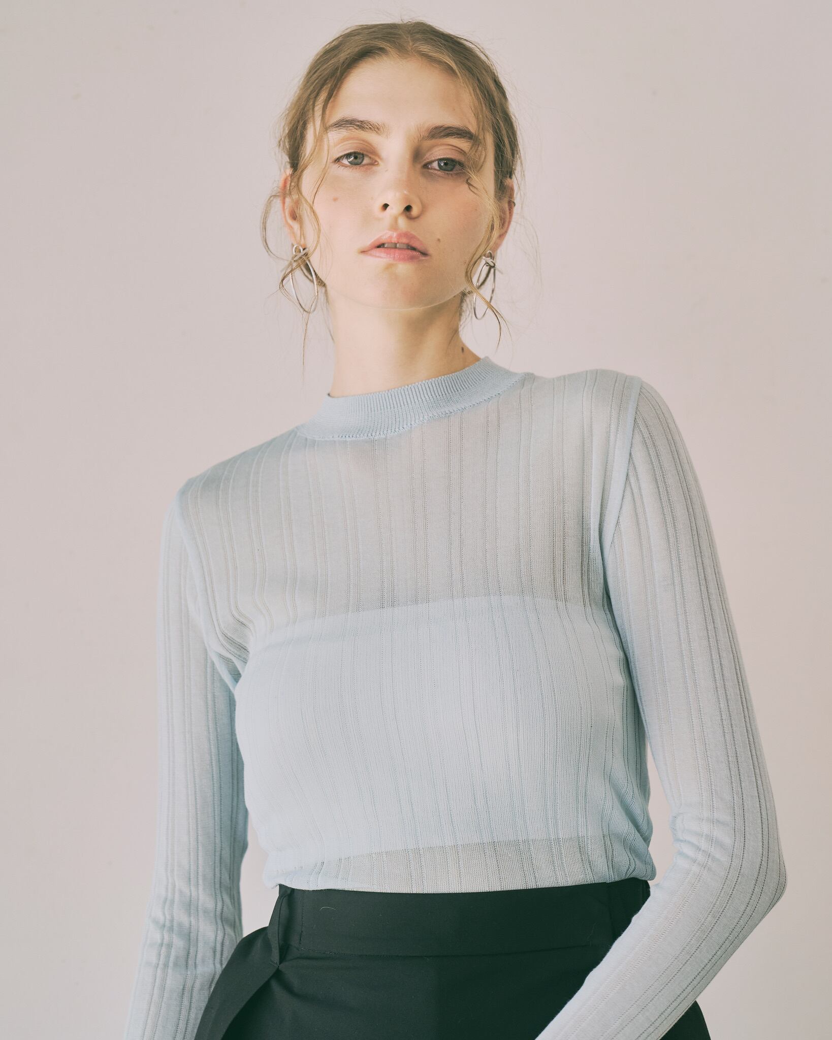 程よい透け感が女性らしいクルーネックデザインのシアーリブニット。着丈や身幅はベーシックに仕上げており、どんなコーディネートにもすっと馴染みます。インナーとしてもトップスとしても幅広く活躍する1枚です。シンプルながらも上品な透け感が、洗練された印象を演出します。