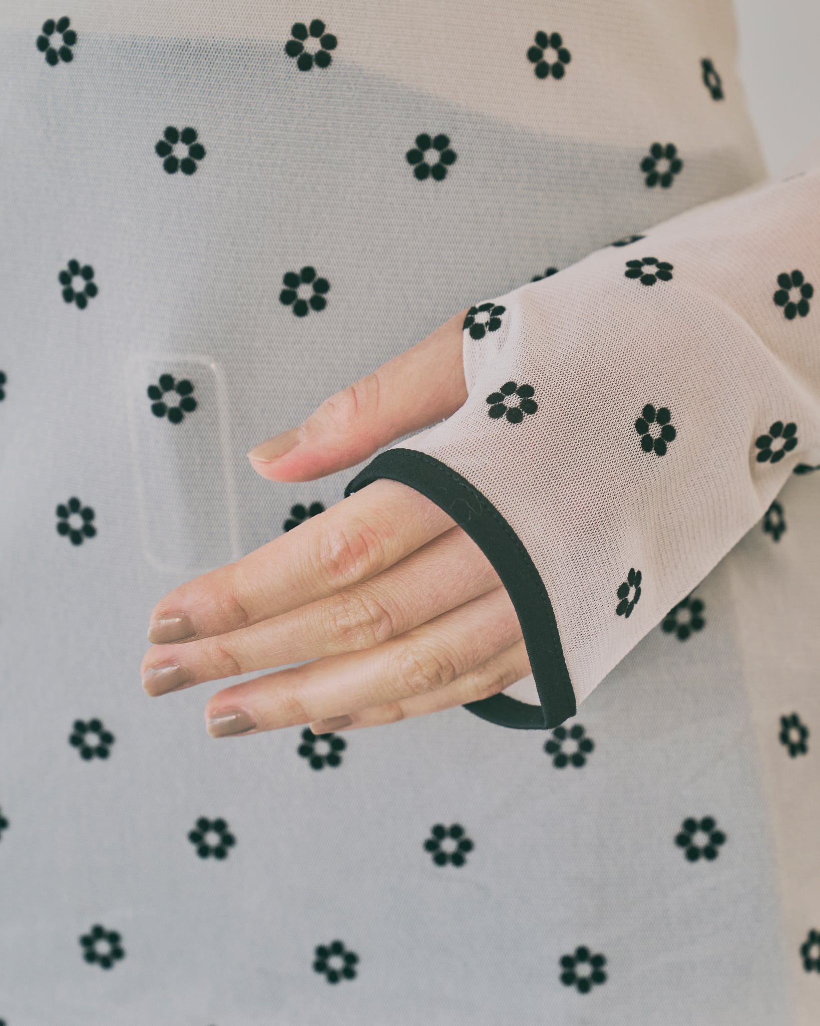 少し長めに袖丈を設定することでニュアンスが出て、可愛さをプラス。また、袖口のフィンガーホールは、親指を通して着用いただけます。