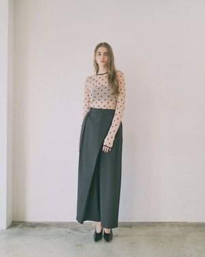 素材は、高収縮の糸を使用しているので通常のチュールよりもストレッチ性に優れています。その為、動きやすく快適な着用感がポイントです。プリントの手法はフロッキープリントにすることで、立体的な印象に。チュールの透け感にフロッキーの立体感が繊細な表情を生み出しています。ご自宅でのお洗濯も可能です。(手洗い推奨)