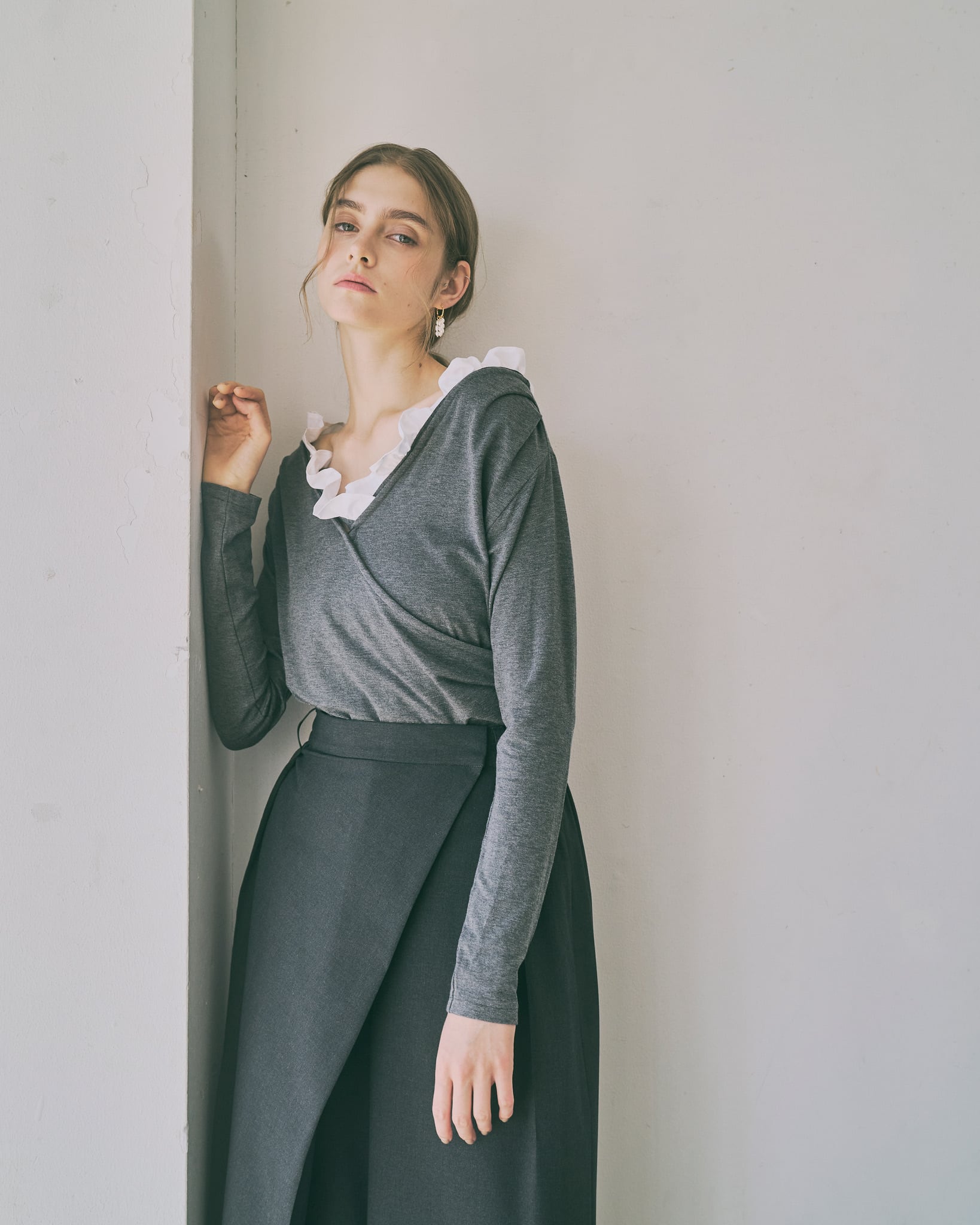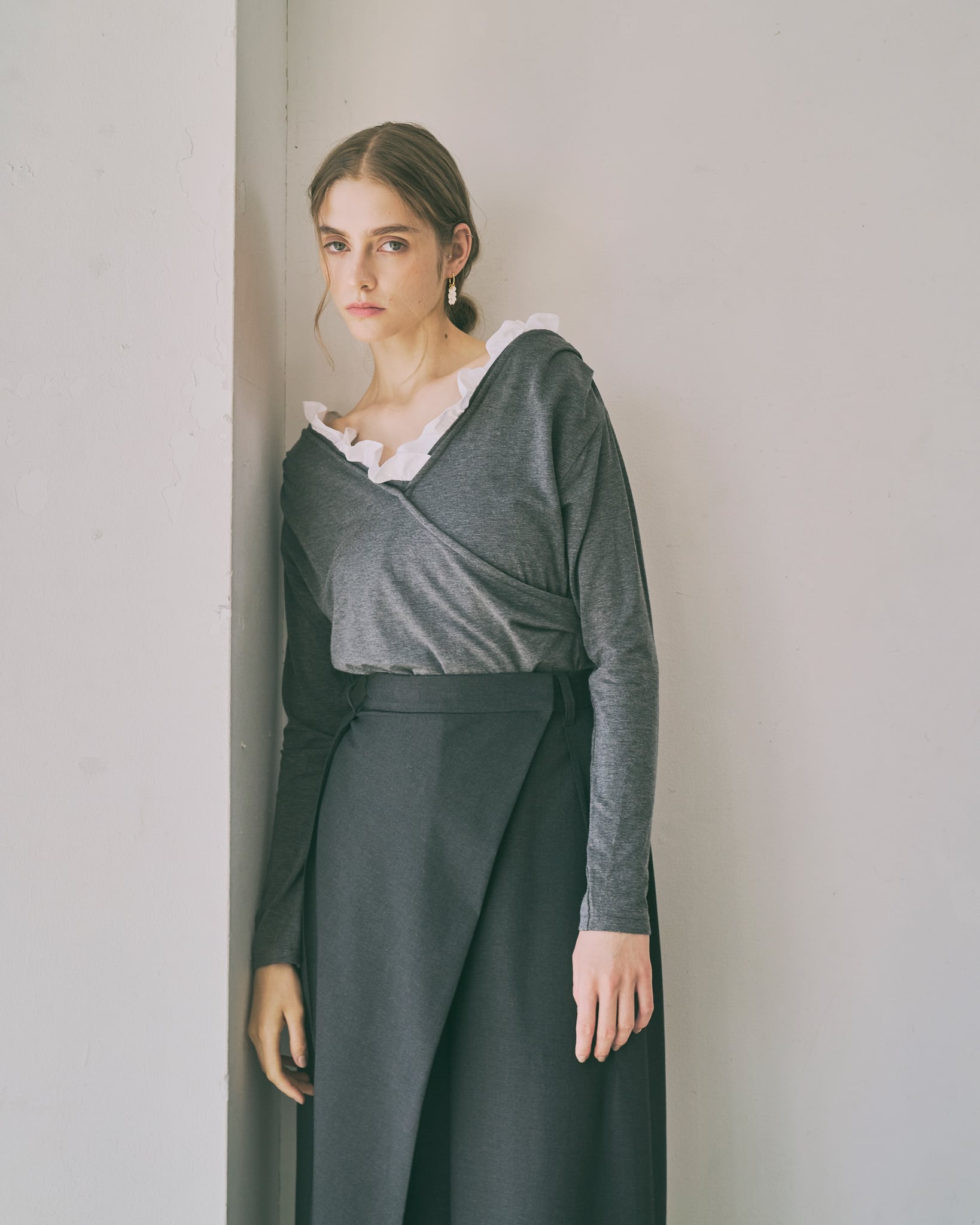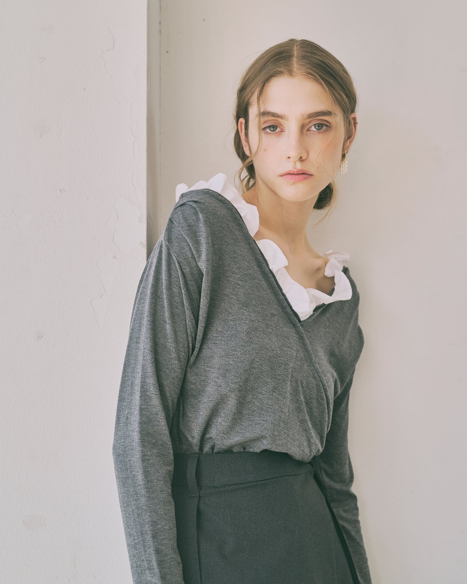 素材にはリヨセル混のカットソー⽣地を使⽤し、肌へのあたりがとても柔らかく、程よい光沢感が特徴です。布帛素材のフリル部分とのコントラストによって、軽やかさと上品さを両⽴。ポリウレタン混紡で伸縮性もあり、伸び戻しがよいため型崩れしにくいの素材となります。ご自宅でのお洗濯も可能です(手洗い推奨)