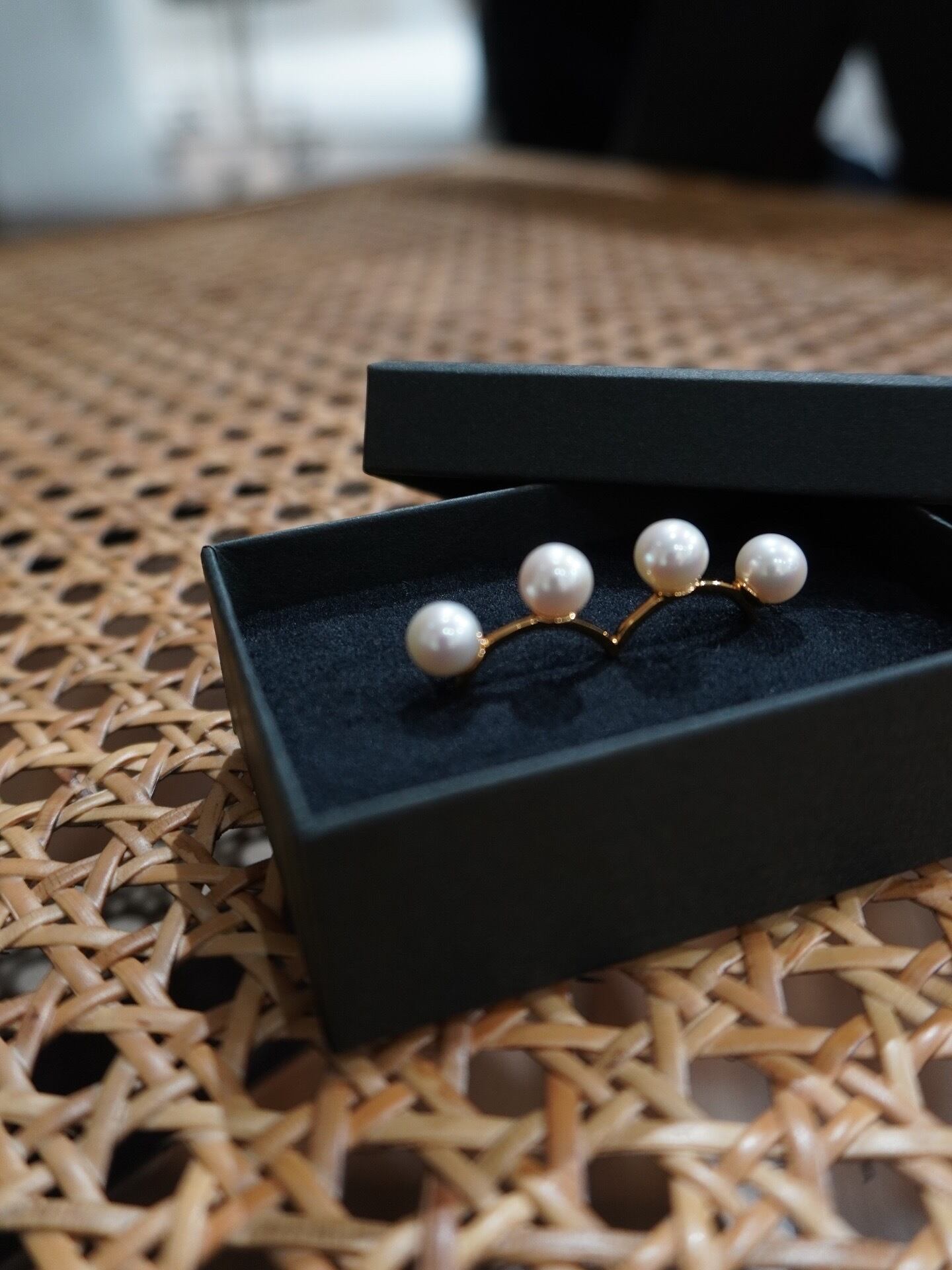 大人気のラブリングがデザイン、素材をリニューアルして登場です。ハート×パールのデザインが上品で女性らしいダブルフィンガーリング。つけるだけで存在感があり、こなれた印象に仕上がります。ハート型のフォルムに4粒の淡⽔パールを配し、愛らしさと存在感を兼ね備えています。ゴールドの輝きとパールの柔らかな光沢が、⼿元を華やかに演出します。記念⽇のギフトにもおすすめです。