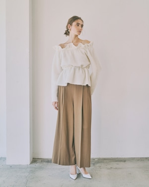 アルパカ混の表情感のある素材に、首元ギャザーが女性らしいオフショルダーニット。肩部分とウエストにゴムを通すことで、シルエットの変化を楽しめる⼀枚です。ウエストは中で絞れる仕様としています。オフショルダーとしてはもちろん、ワンショルダーや、肩を落とさず着用も可能です。着丈はやや短めに設定し、ボトムとのバランスがとりやすいデザインに仕上げました。