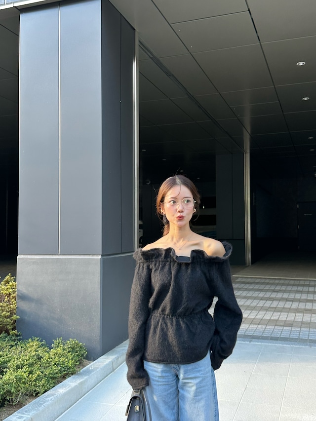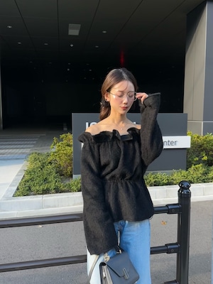 アルパカ混の表情感のある素材に、首元ギャザーが女性らしいオフショルダーニット。肩部分とウエストにゴムを通すことで、シルエットの変化を楽しめる⼀枚です。ウエストは中で絞れる仕様としています。オフショルダーとしてはもちろん、ワンショルダーや、肩を落とさず着用も可能です。着丈はやや短めに設定し、ボトムとのバランスがとりやすいデザインに仕上げました。