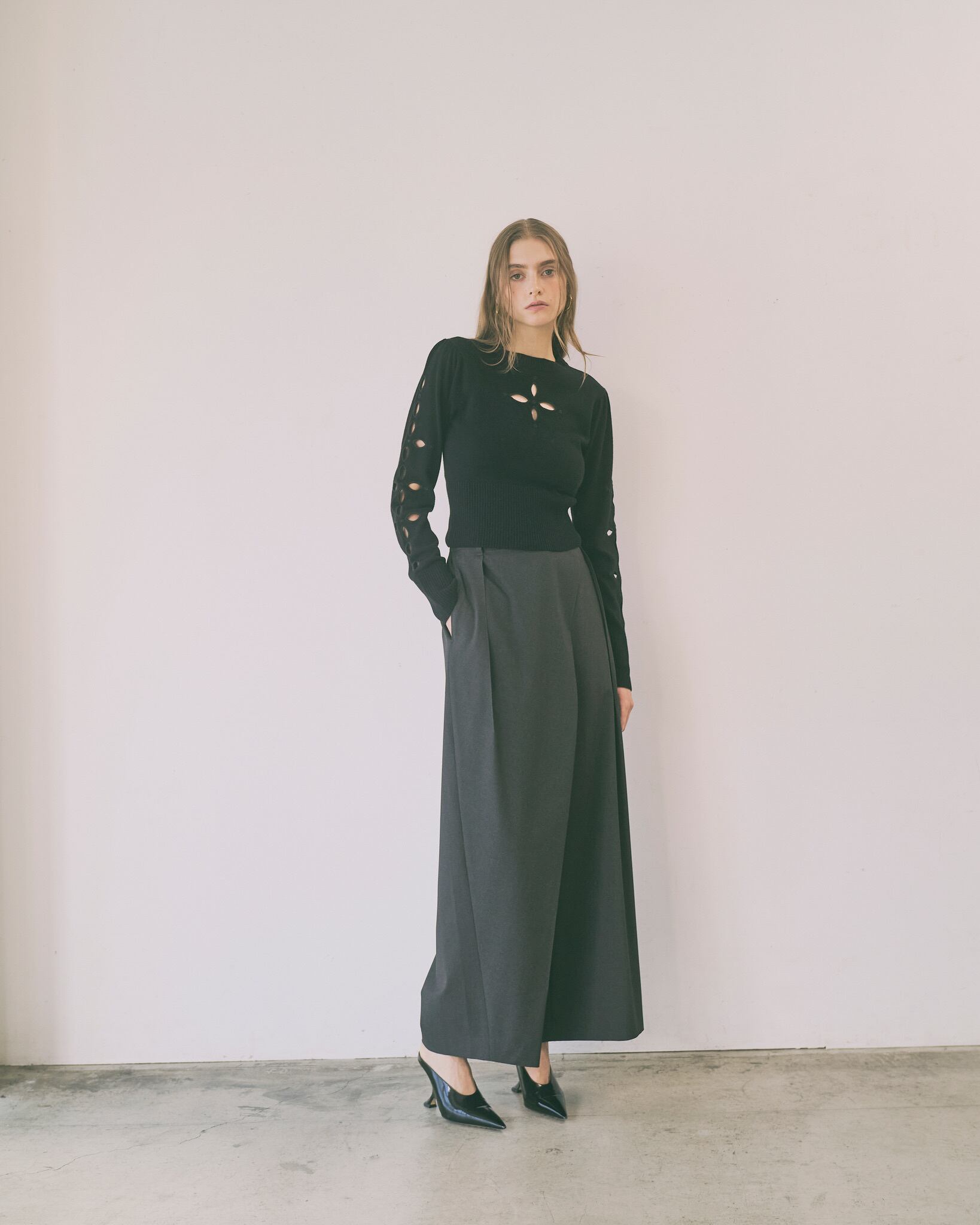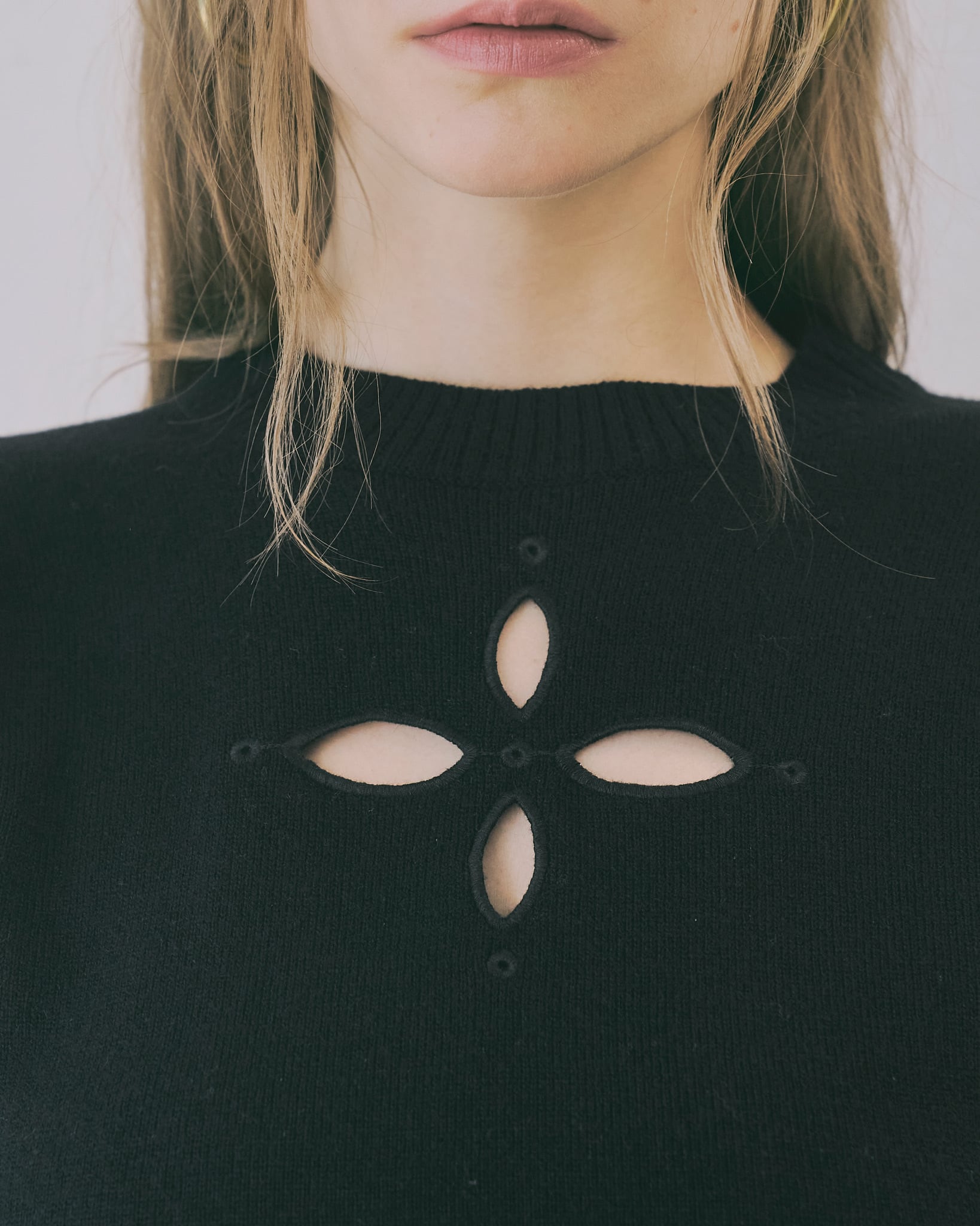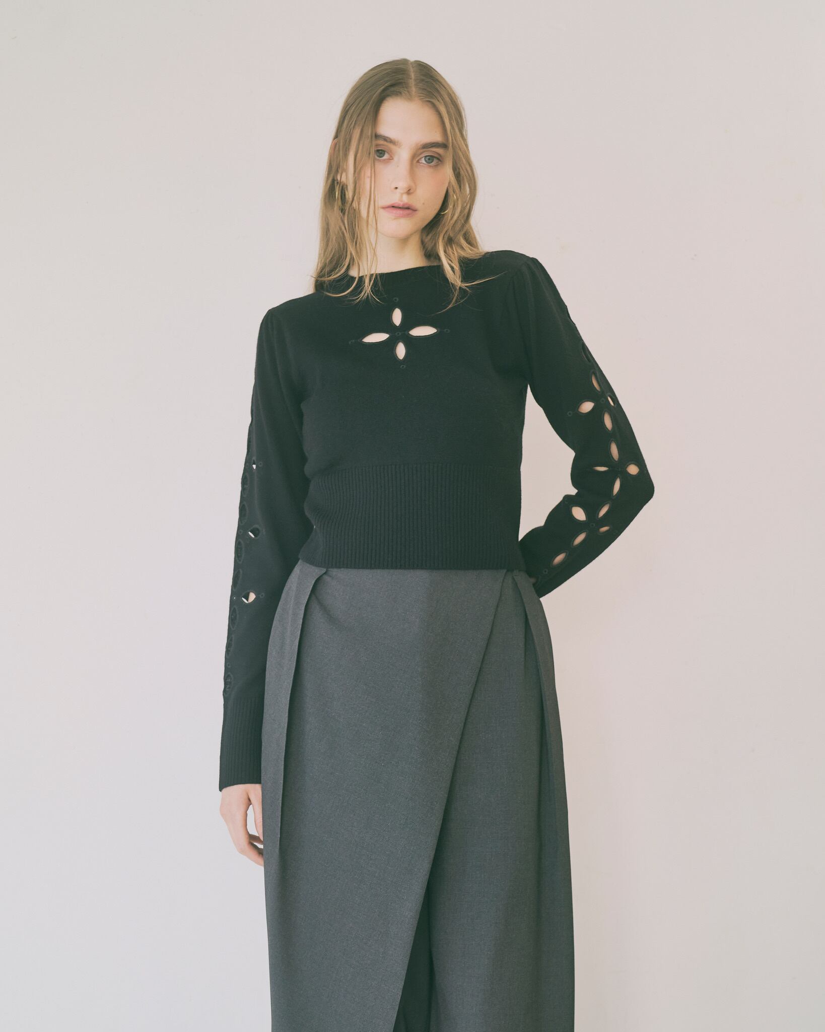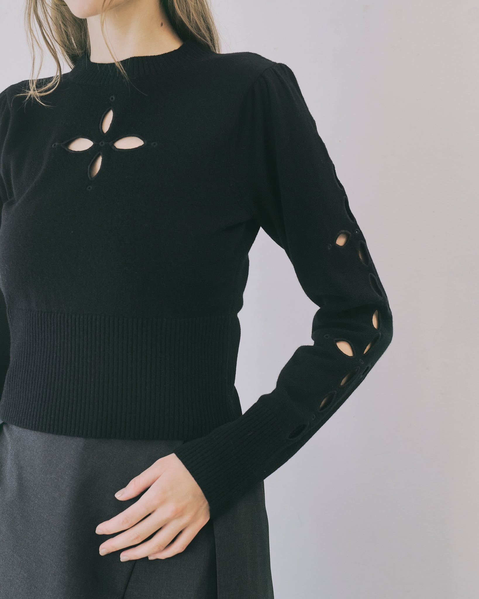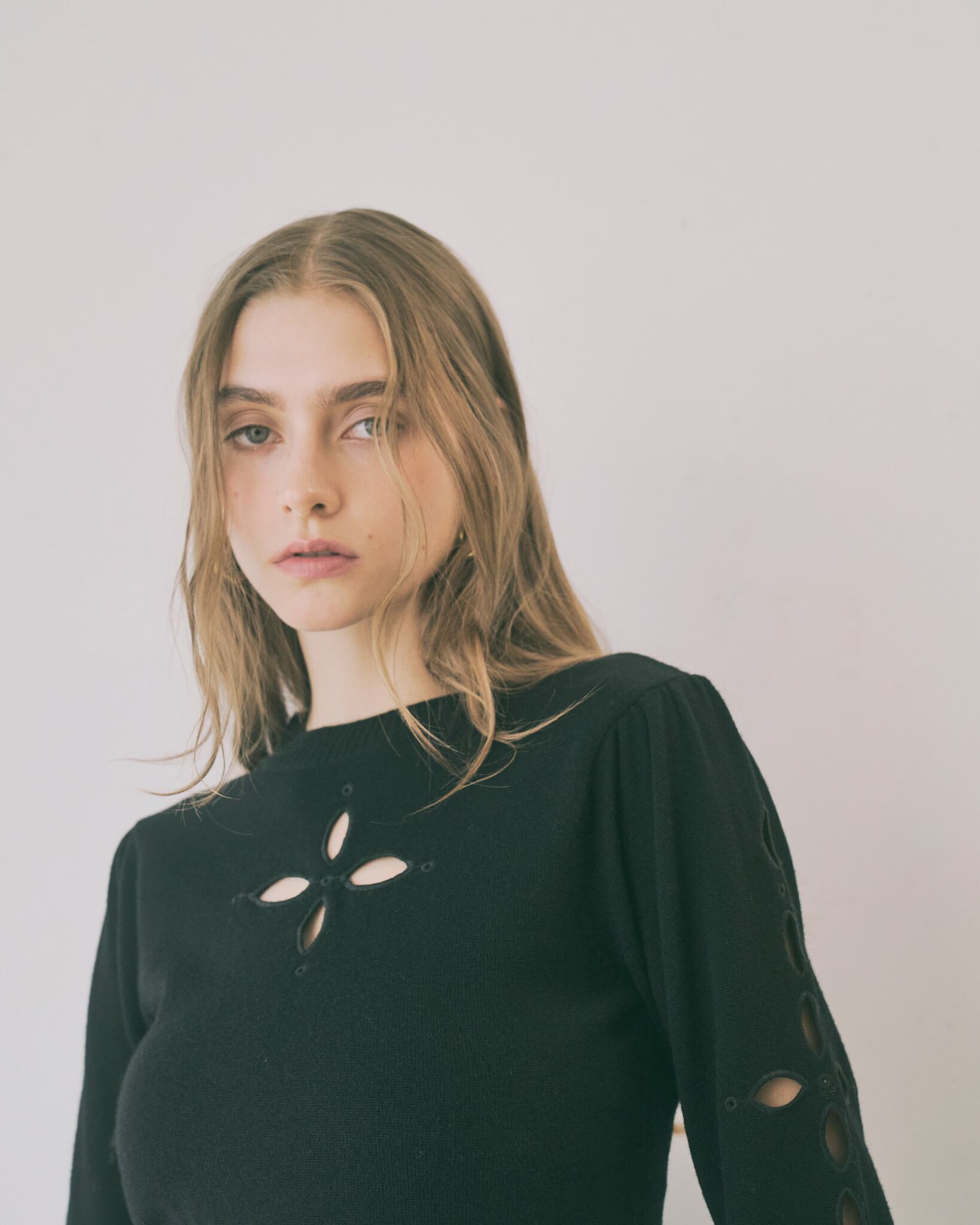 ⾝頃と袖に贅沢に施された刺繍が印象的なニット。ニットの柔らかな表情の中に、立体的な刺繍柄を美しく表現するため、糸の太さやステッチの間隔にまで拘りました。袖口と裾はリブ仕様で全体のシルエットを引き締めつつ。袖山に寄せたギャザーが自然な袖の膨らみを作ります。シンプルながらも刺繍の存在感と、繊細なディティールに拘りました。短めの着丈がボトムとのバランスもとりやすい1枚です。