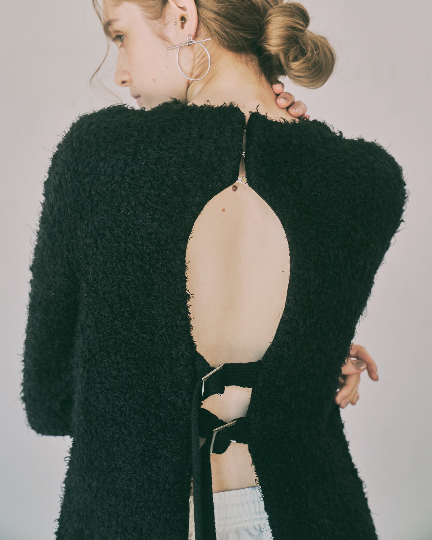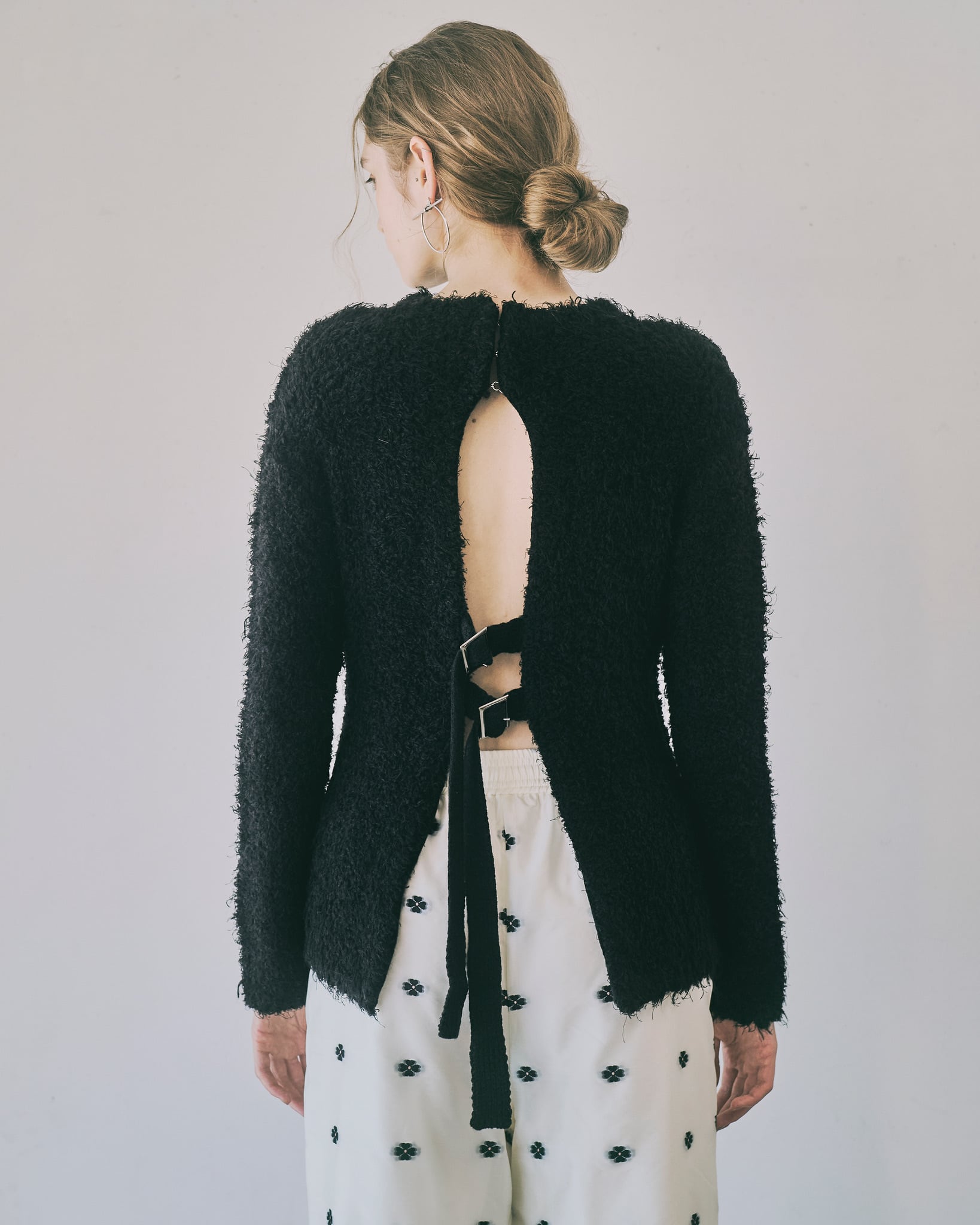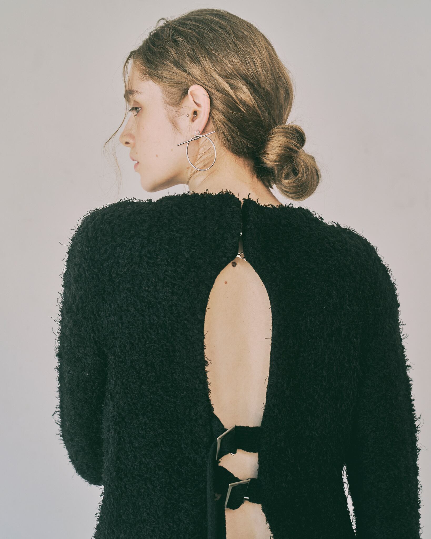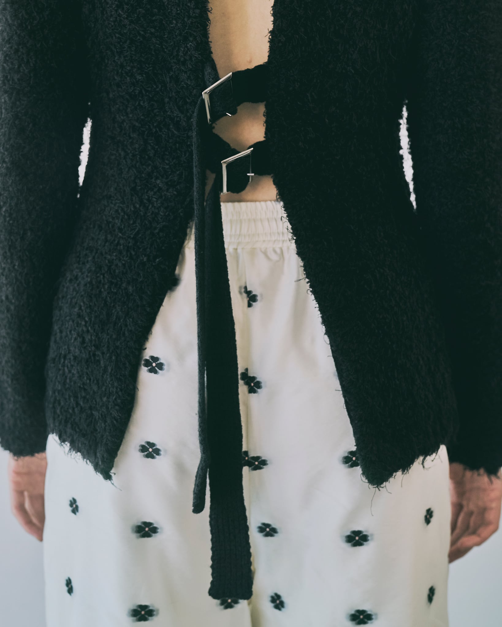 ⾝頃に配したベルトが印象的なニットカーディガン。使用する付属や絶妙なバランスに拘ることでシンプルな中にも構築的な印象を与える一着に。前後どちらを前にしても着用できる2way仕様で、羽織りとしてもトップスとしてもスタイリングや気分に合わせてアレンジが可能。襟部分は3か所ホックで留めていただけます。