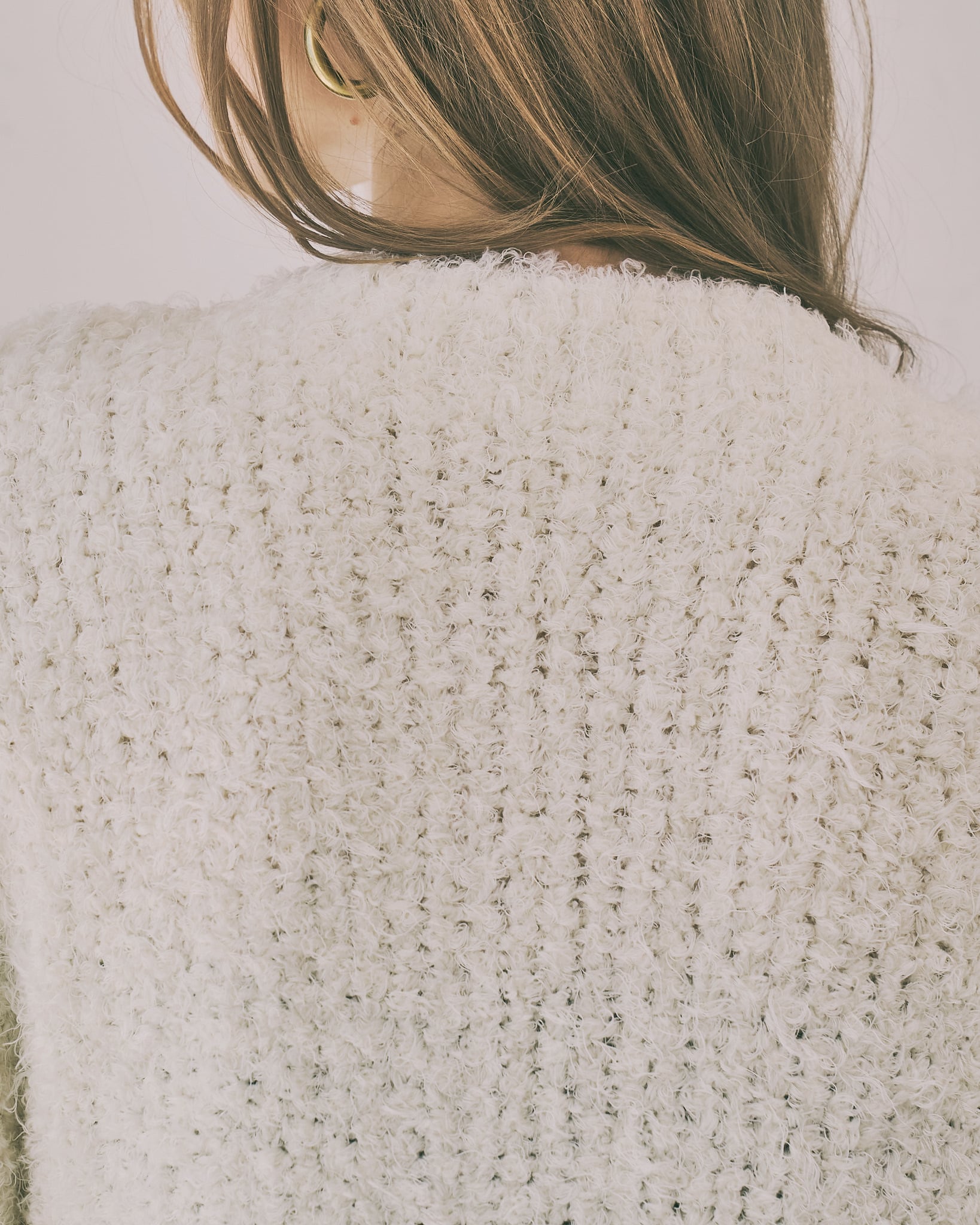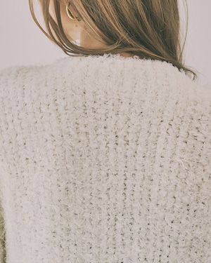 素材には、複数の⽷をミックスした特別なブレンド⽷を使⽤。異なる太さや質感の⽷を組み合わせることで、奥⾏きのある表⾯感と豊かな陰影を⽣み出しました。チクチク感のない柔らかな肌触りも魅⼒です。