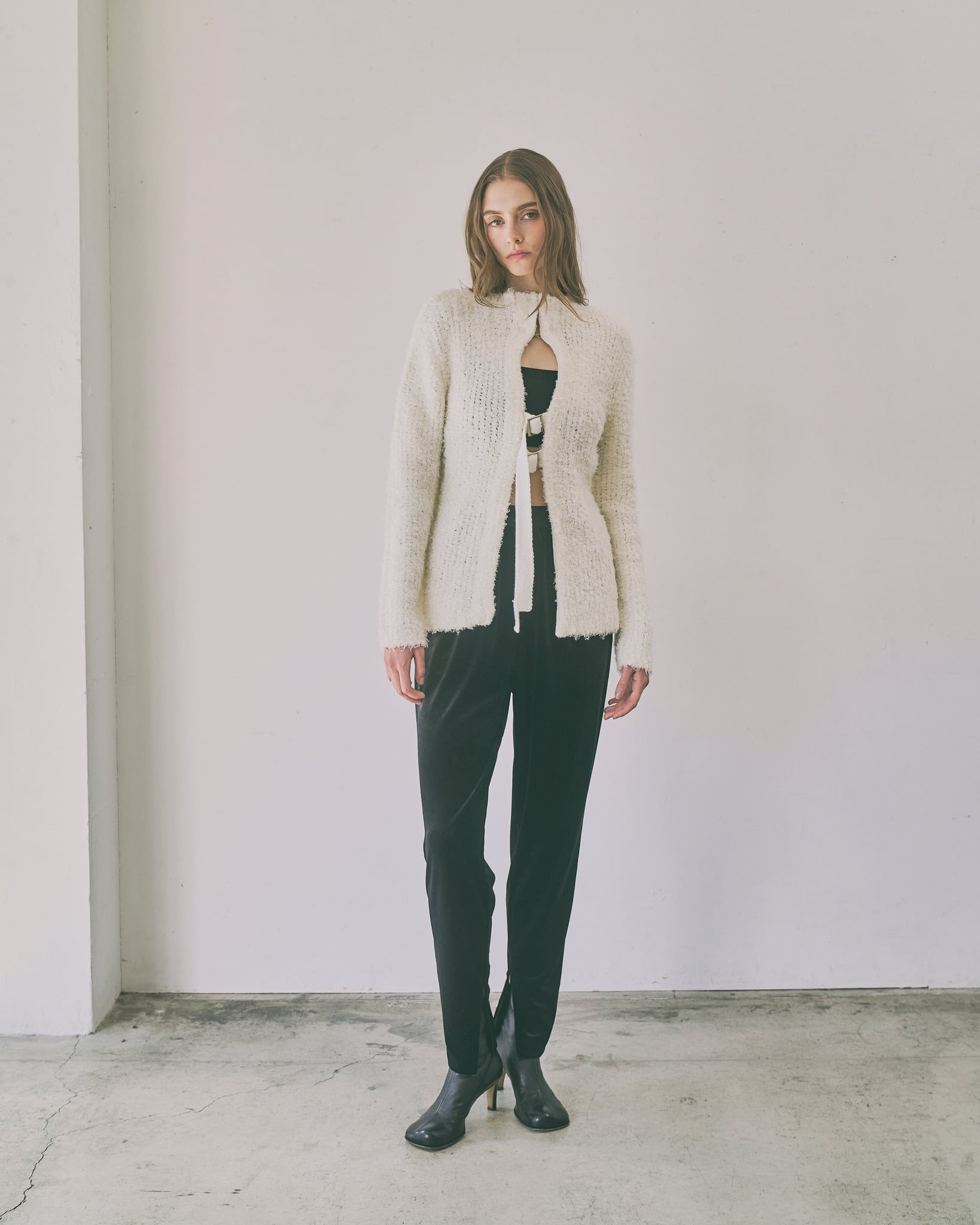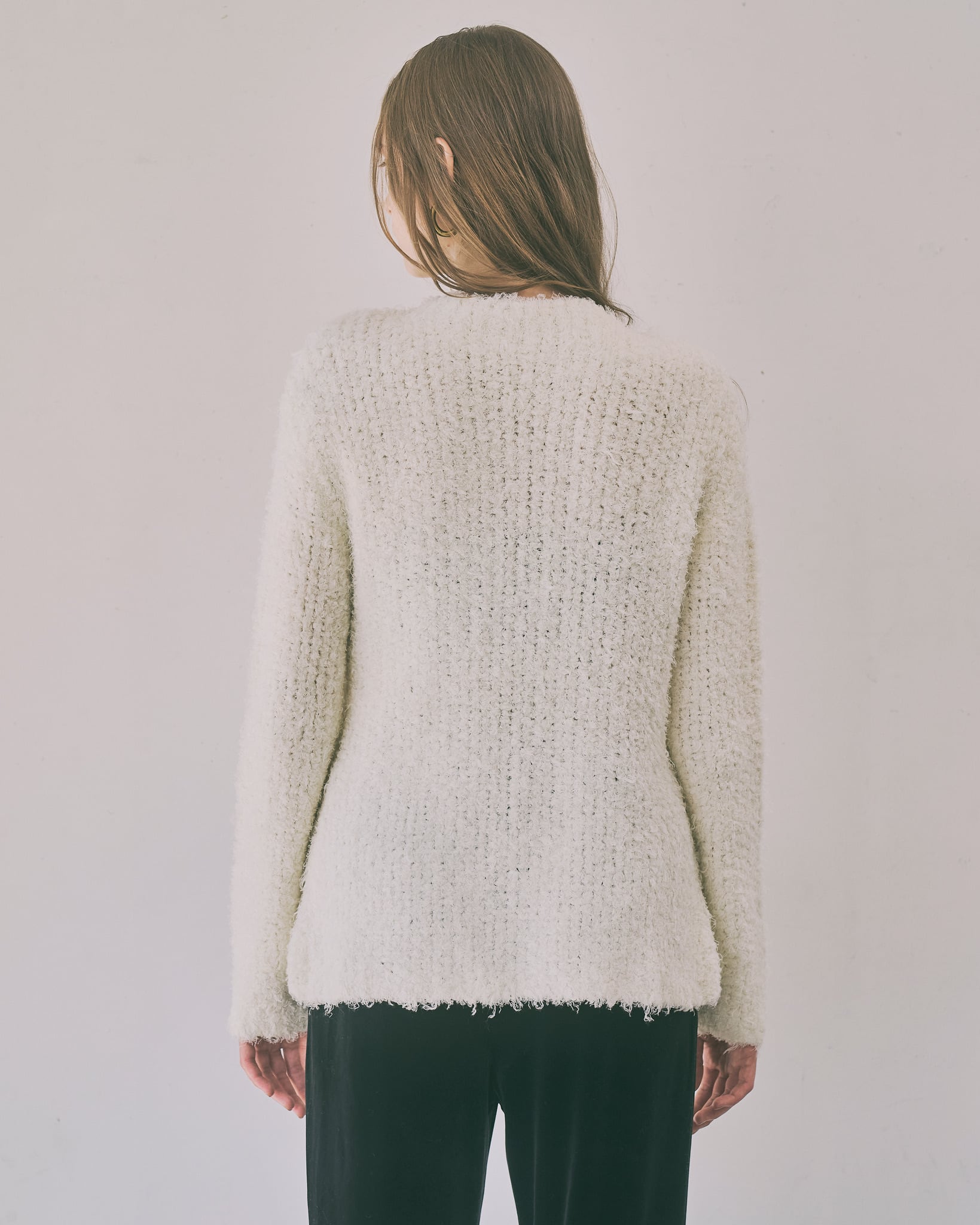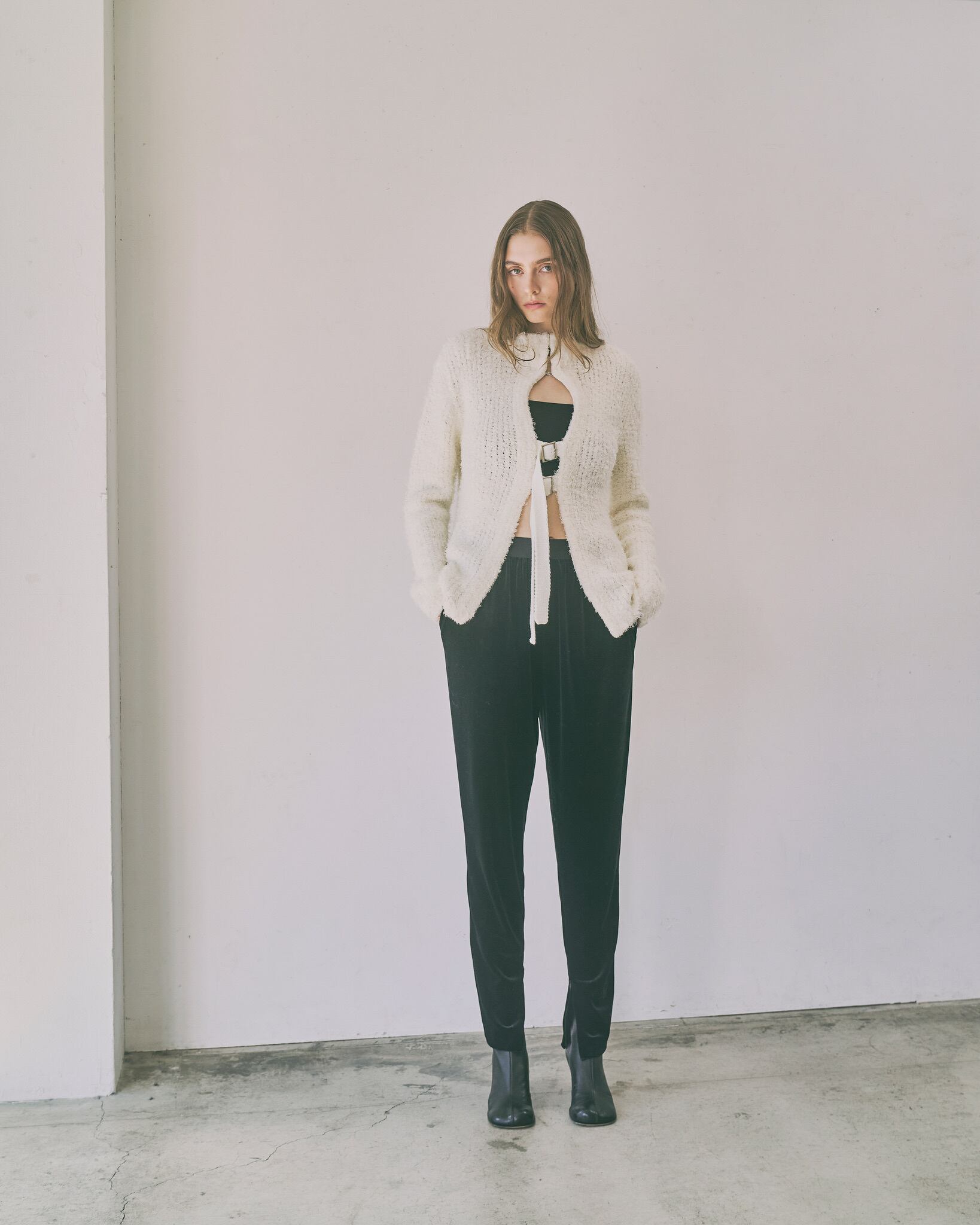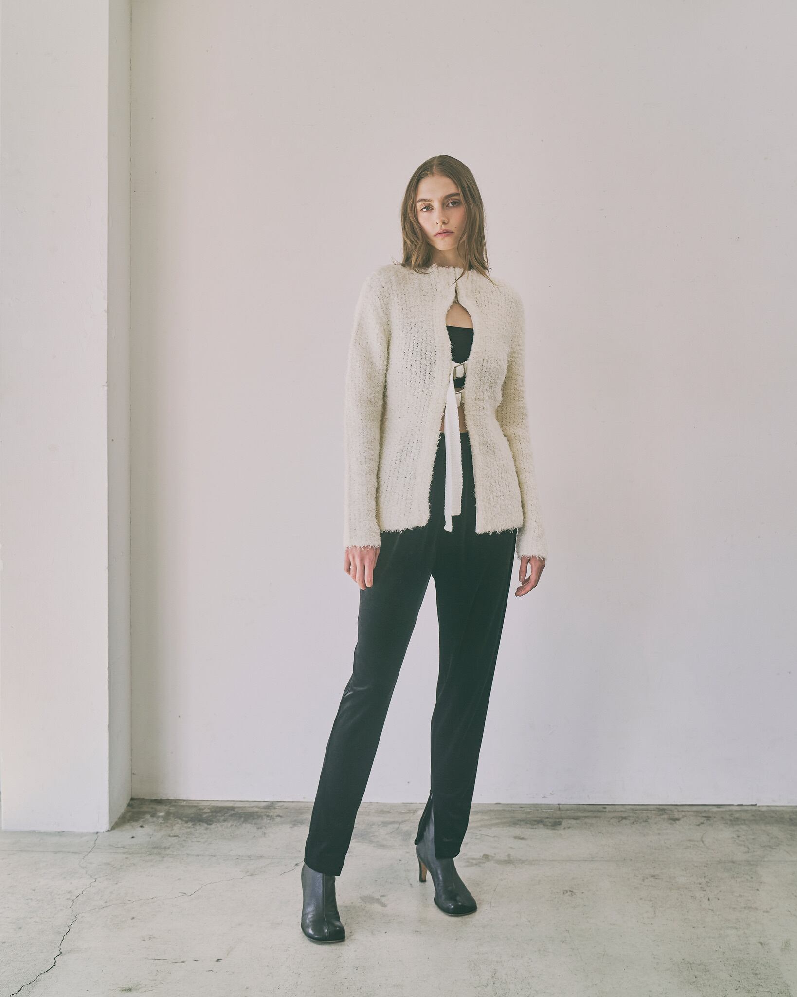 ボタンレスのすっきりとしたシルエットと、素材の表情感が調和し、纏うだけで洗練された印象に仕上がるアイテムです。