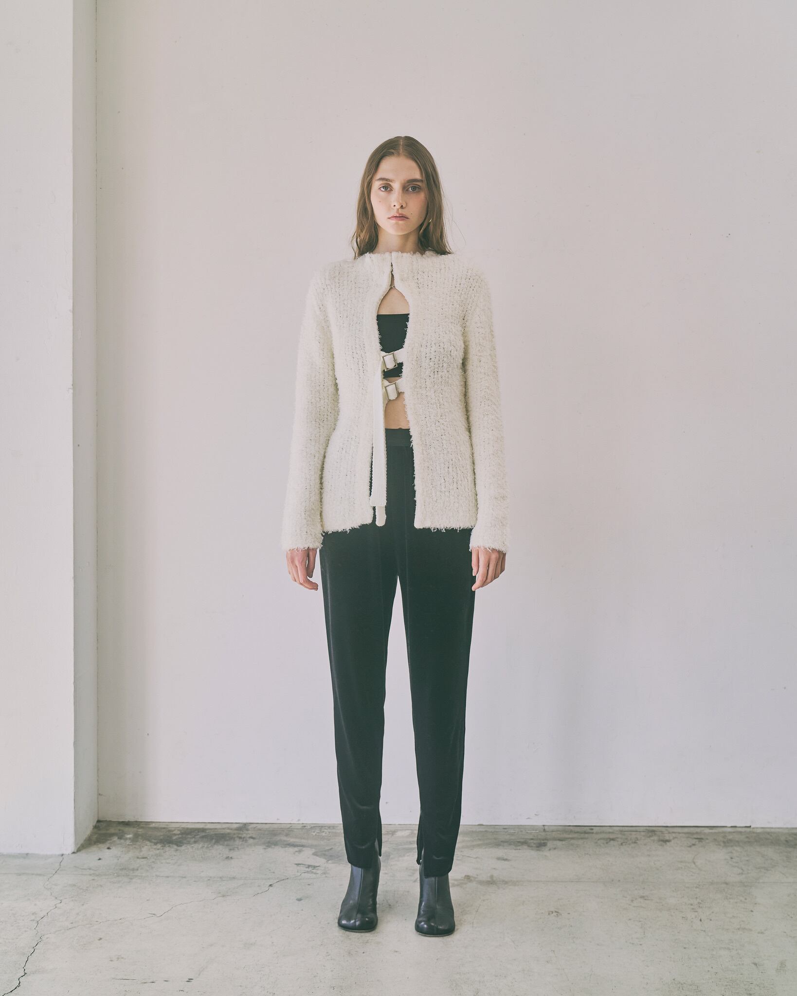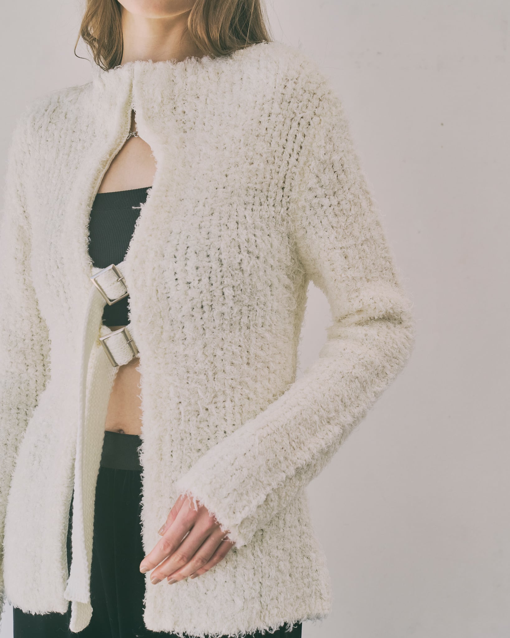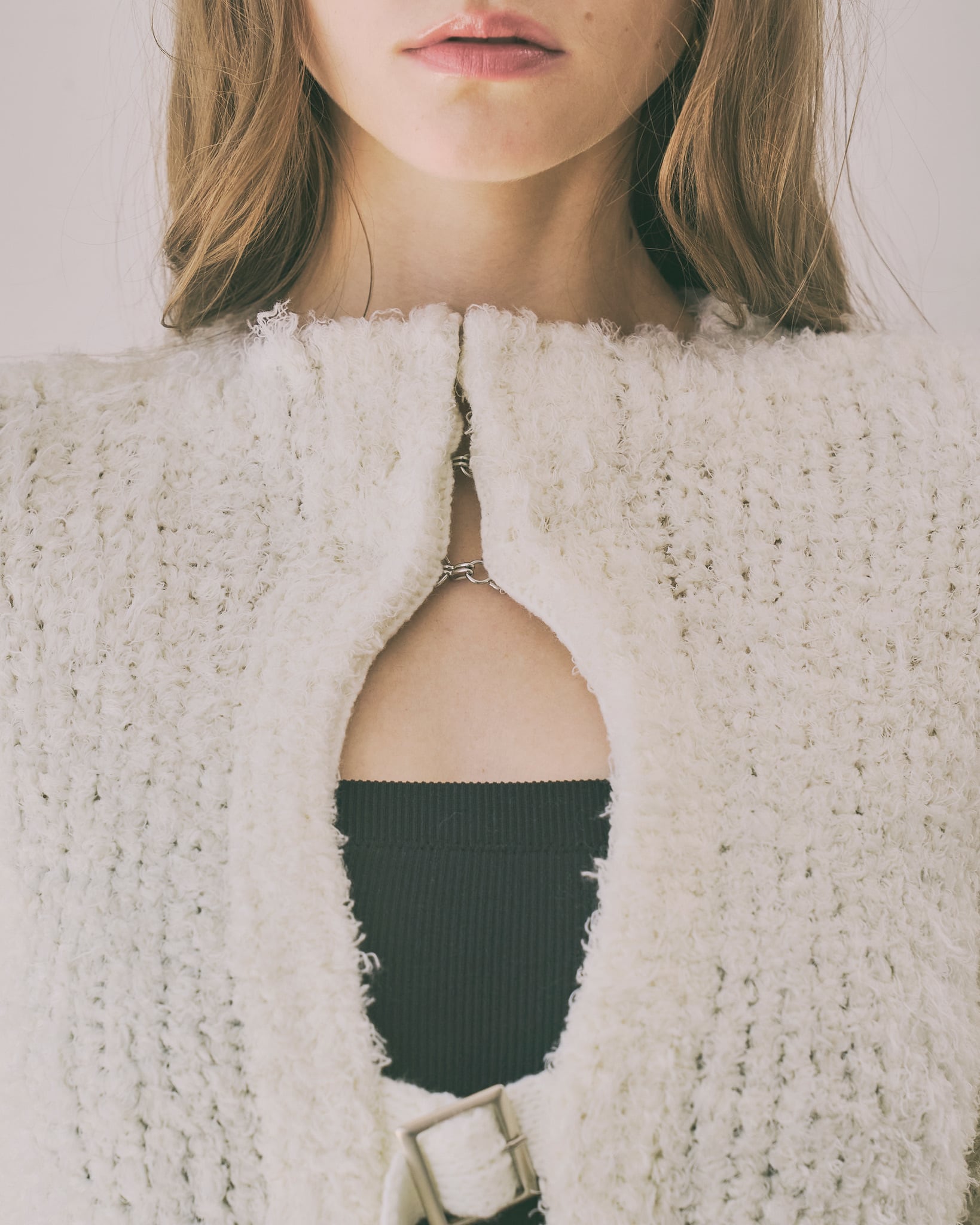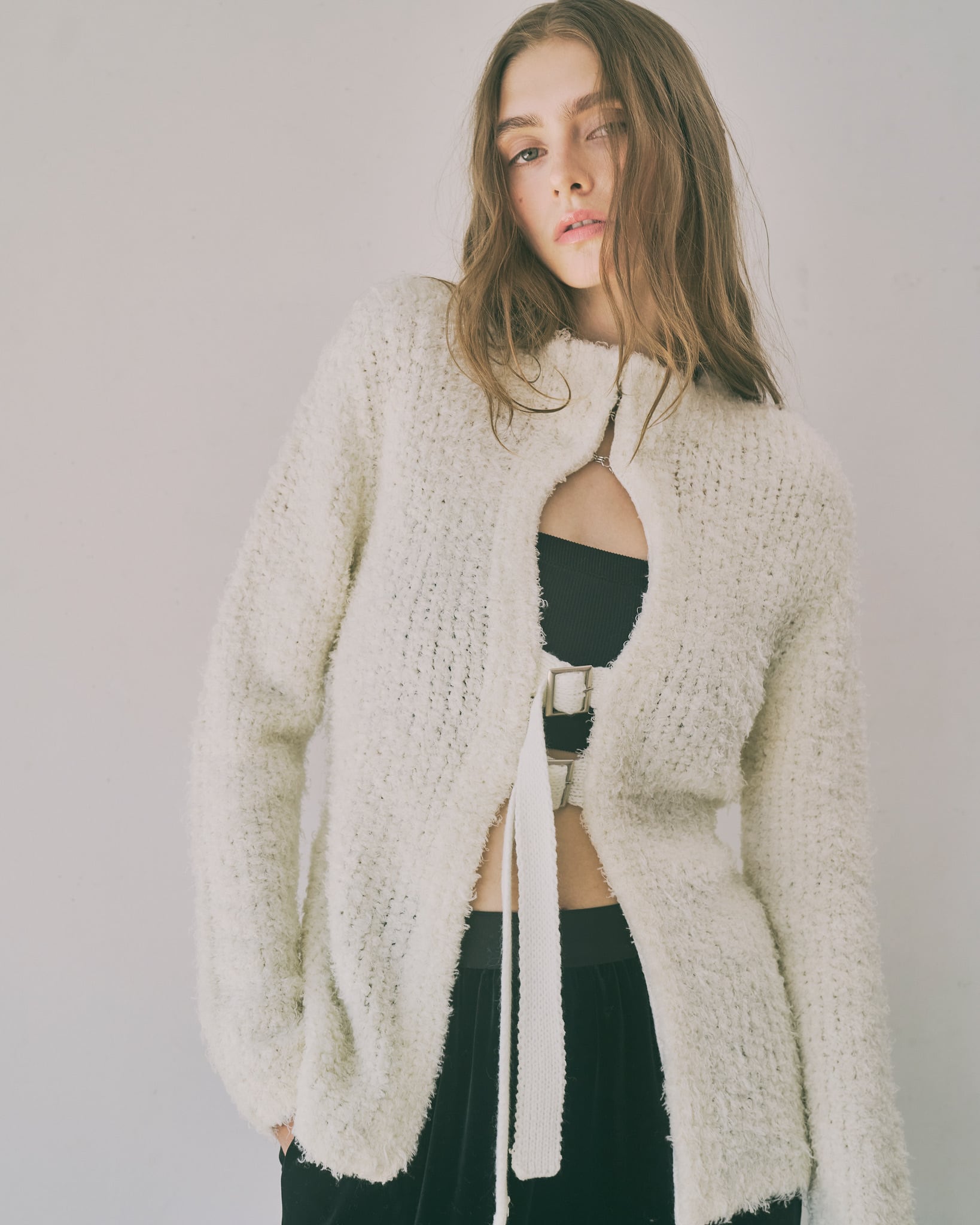 ⾝頃に配したベルトが印象的なニットカーディガン。使用する付属や絶妙なバランスに拘ることでシンプルな中にも構築的な印象を与える一着に。前後どちらを前にしても着用できる2way仕様で、羽織りとしてもトップスとしてもスタイリングや気分に合わせてアレンジが可能。襟部分は3か所ホックで留めていただけます。