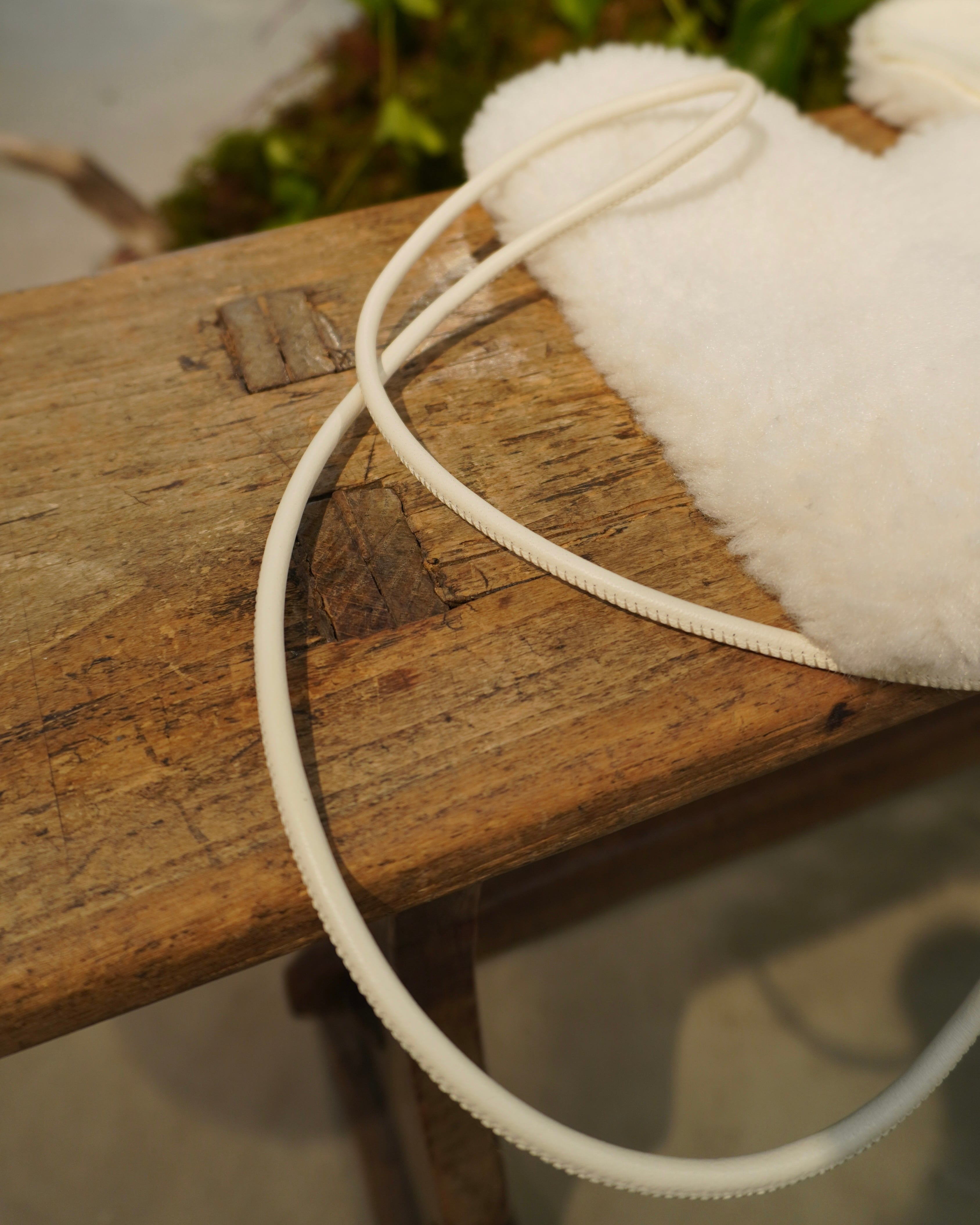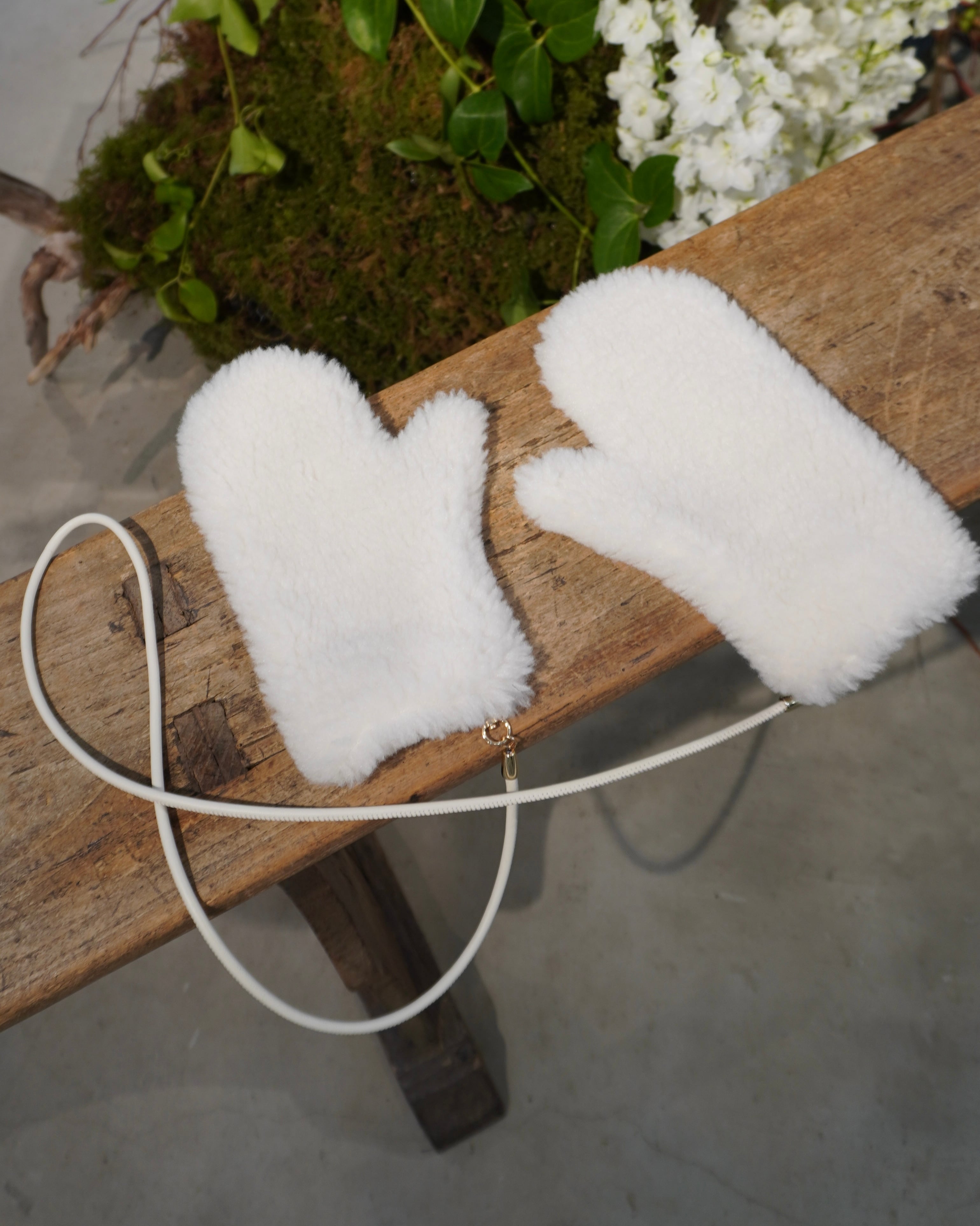 HYEONの大人気アイテム”ted cape”と同素材でお作りした”ted glove”。暖かみのある柔らかな表情感が可愛いボア素材。⾸からぶら下げられる紐付きのグローブです。
