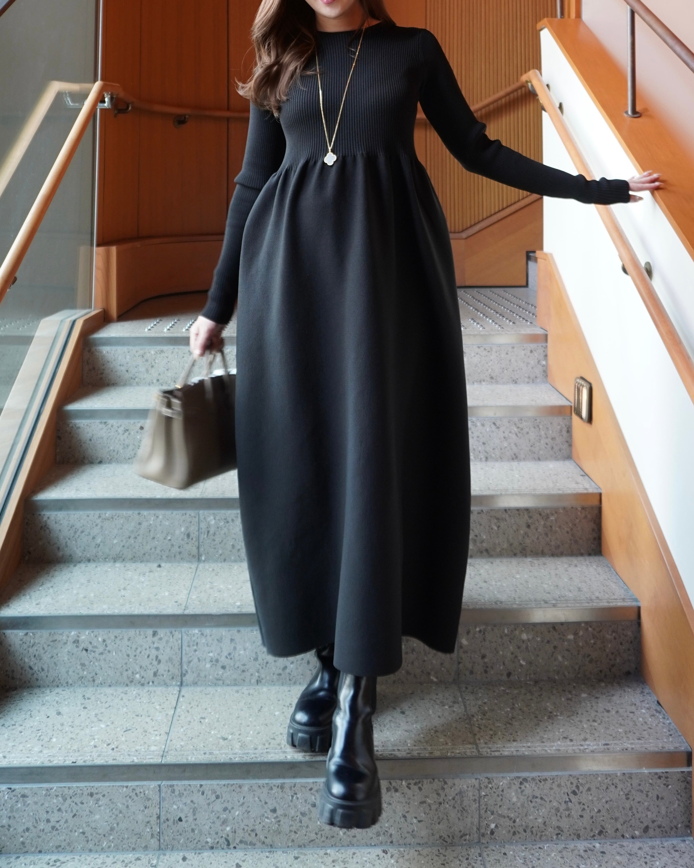 上身頃と袖はすっきりとしたリブ編みにし、ウエスト位置からウェーブタックを入れるこで、編み続きでありながら立体的なシルエットを形成。切替から広がるフレアラインは、歩くたびに美しく揺れ、ボリュームのあるフォルムながらも軽やかな印象に。日常使いはもちろん、長時間の外出や旅行でも大活躍します。
