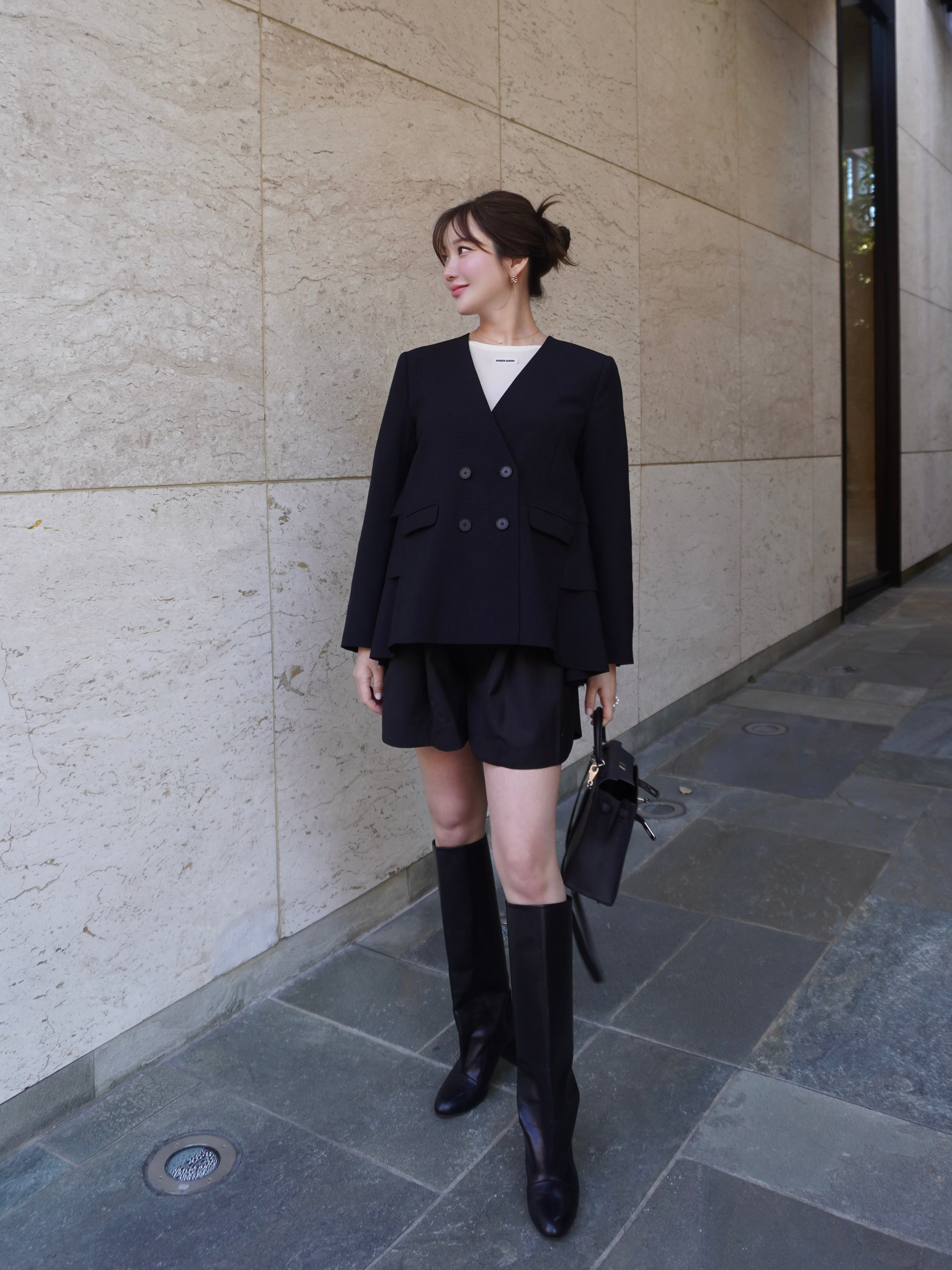 ノーカラーのすっきりとしたフロントに、ダブル前のディテールを採用。水牛調ボタンが控えめなアクセントとなり、上質感を引き立てます。肩パッドを入れることで、肩周りをスッキリと見せてくれます。
