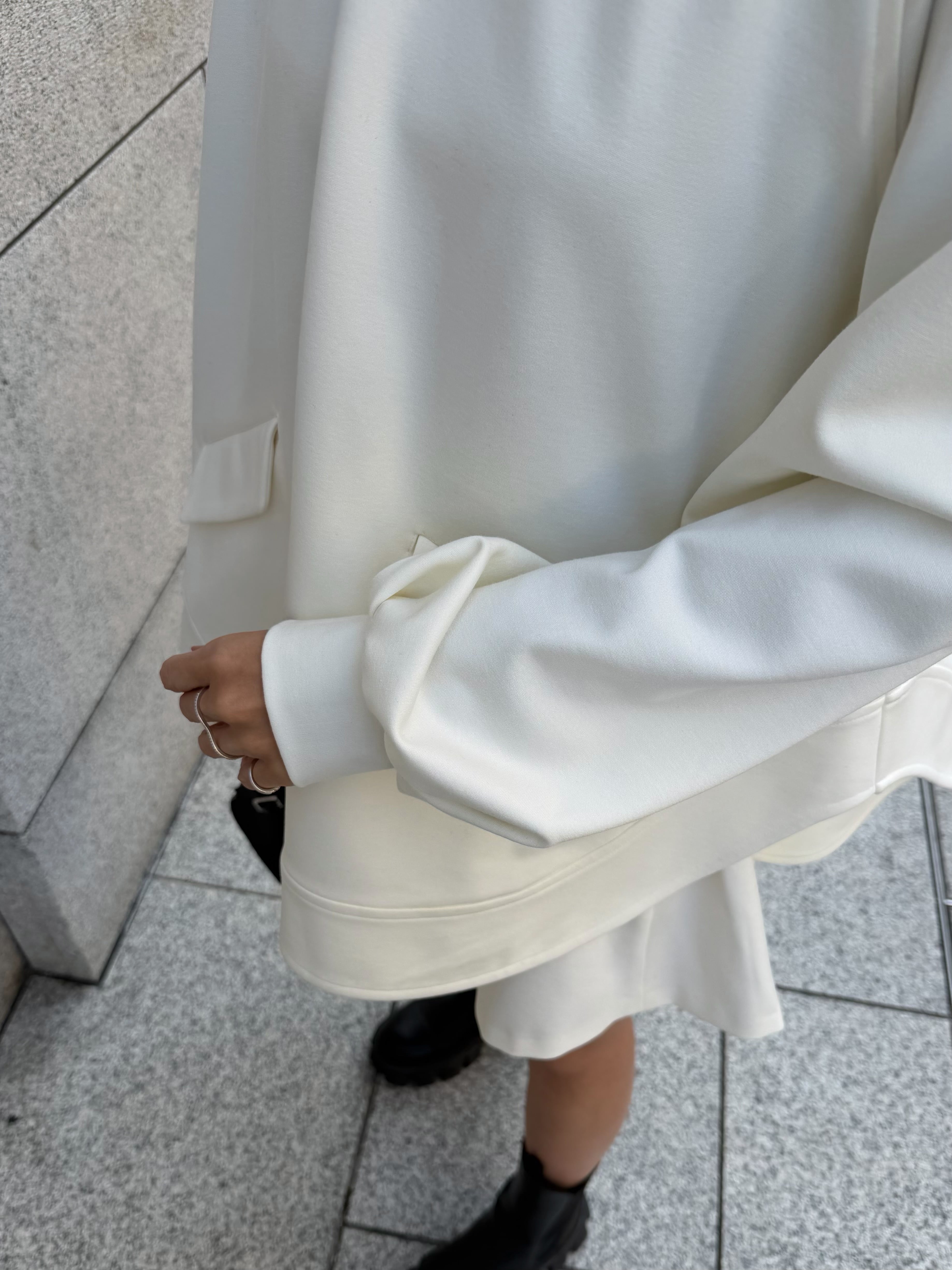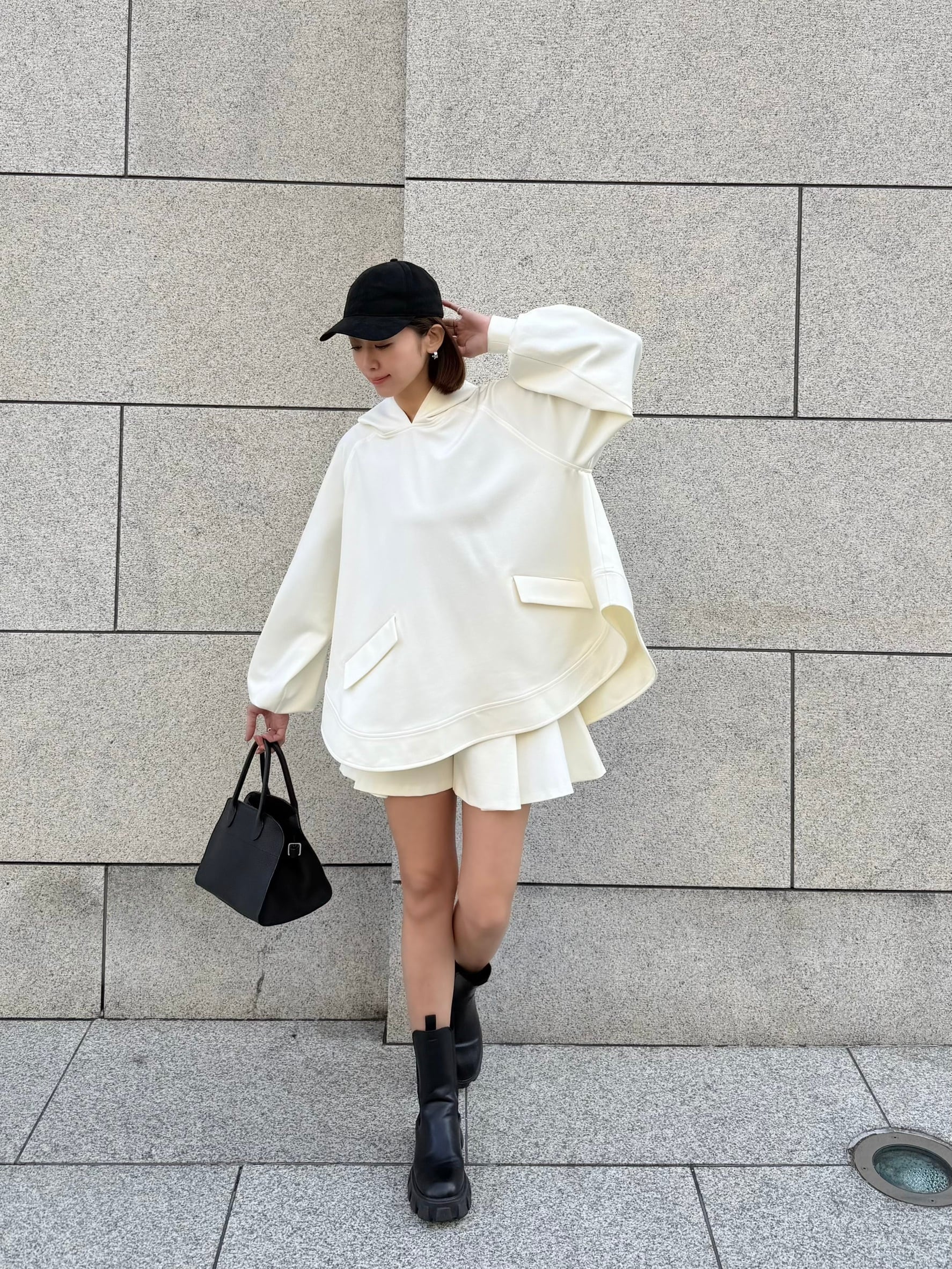 ゆったりとしたシルエットで身体のラインを拾いすぎず、裾のラウンドヘムは、横から見た際にも軽やかで洗練された印象を与えます。