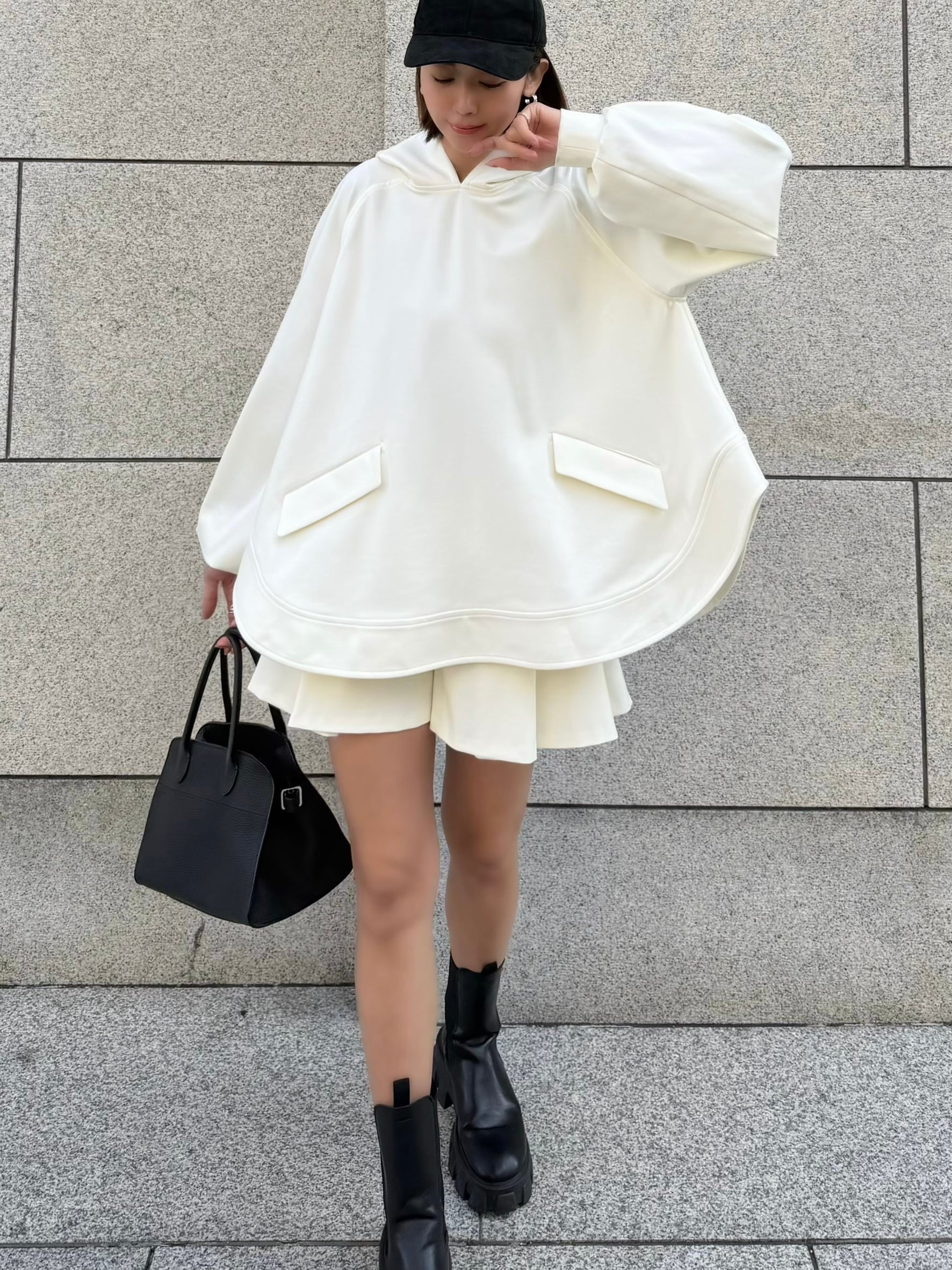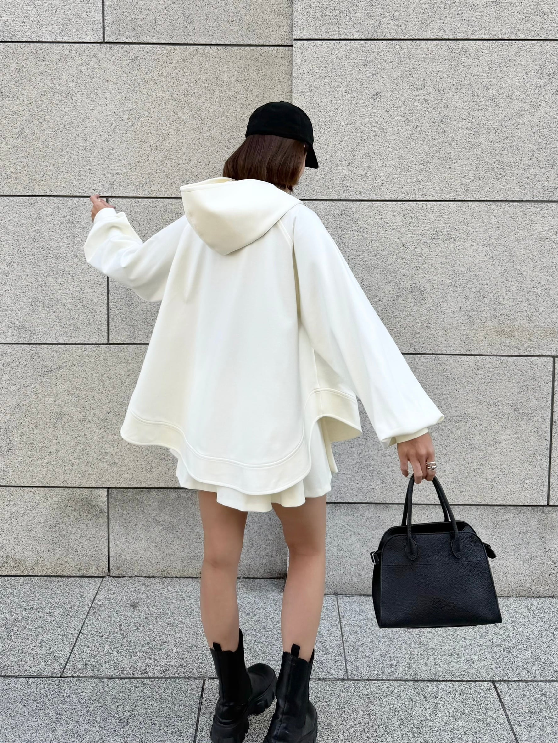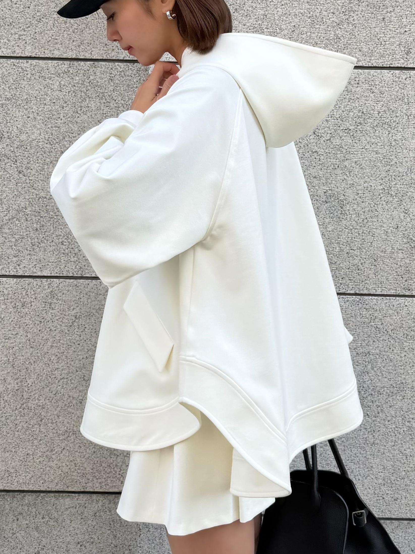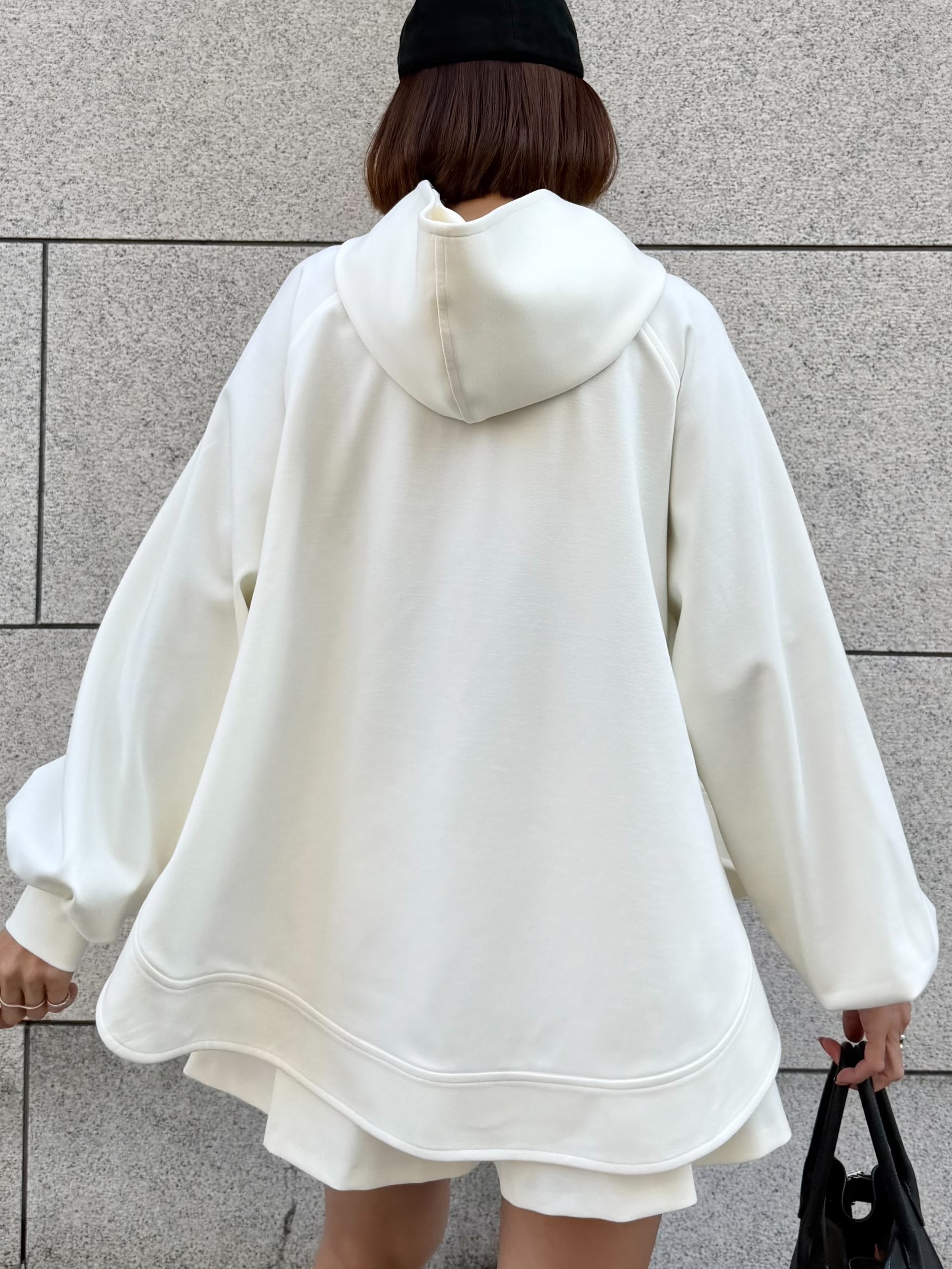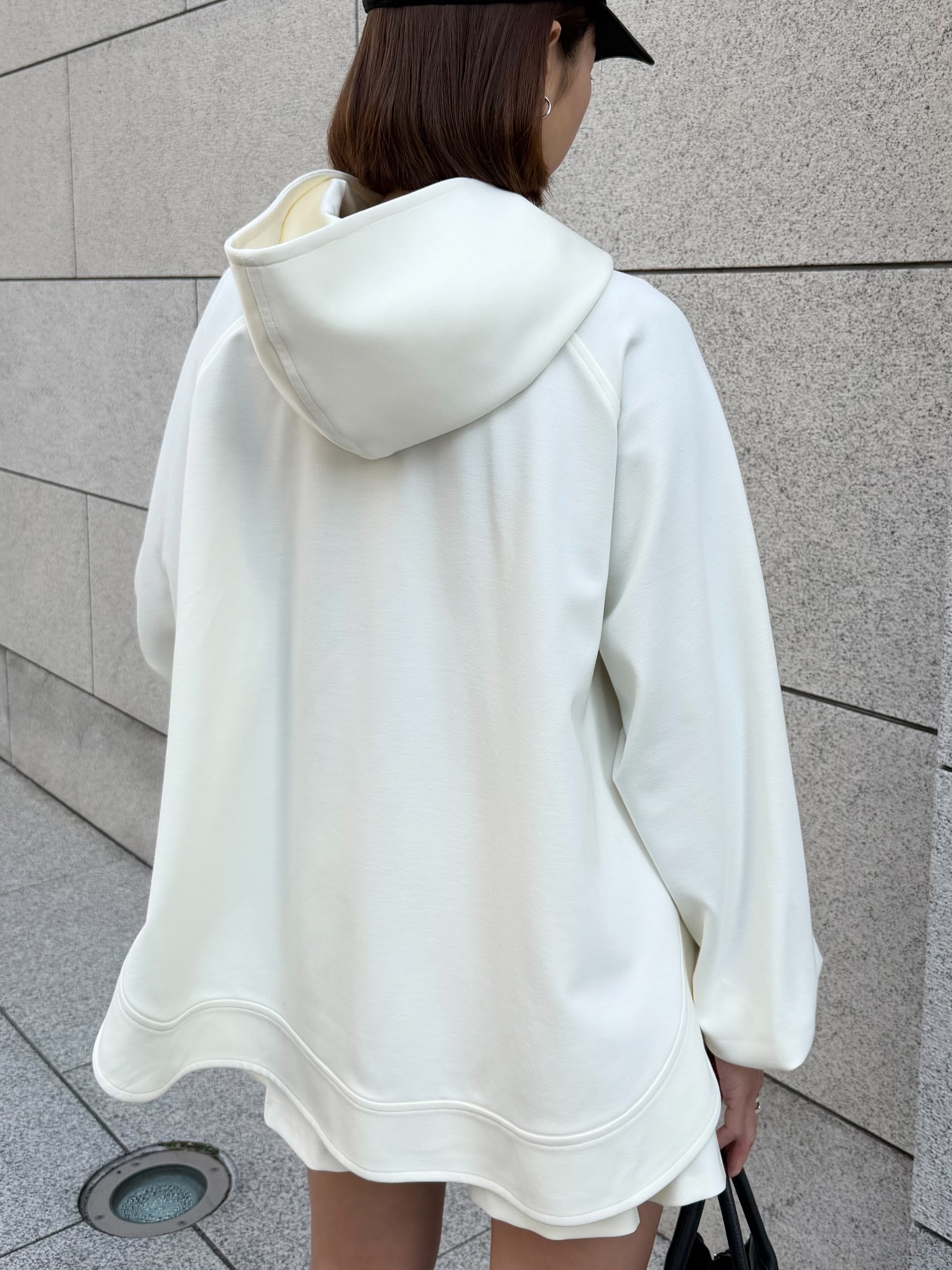 立ち上がる大きめのフードと、Aラインシルエットが印象的なフーディー。
