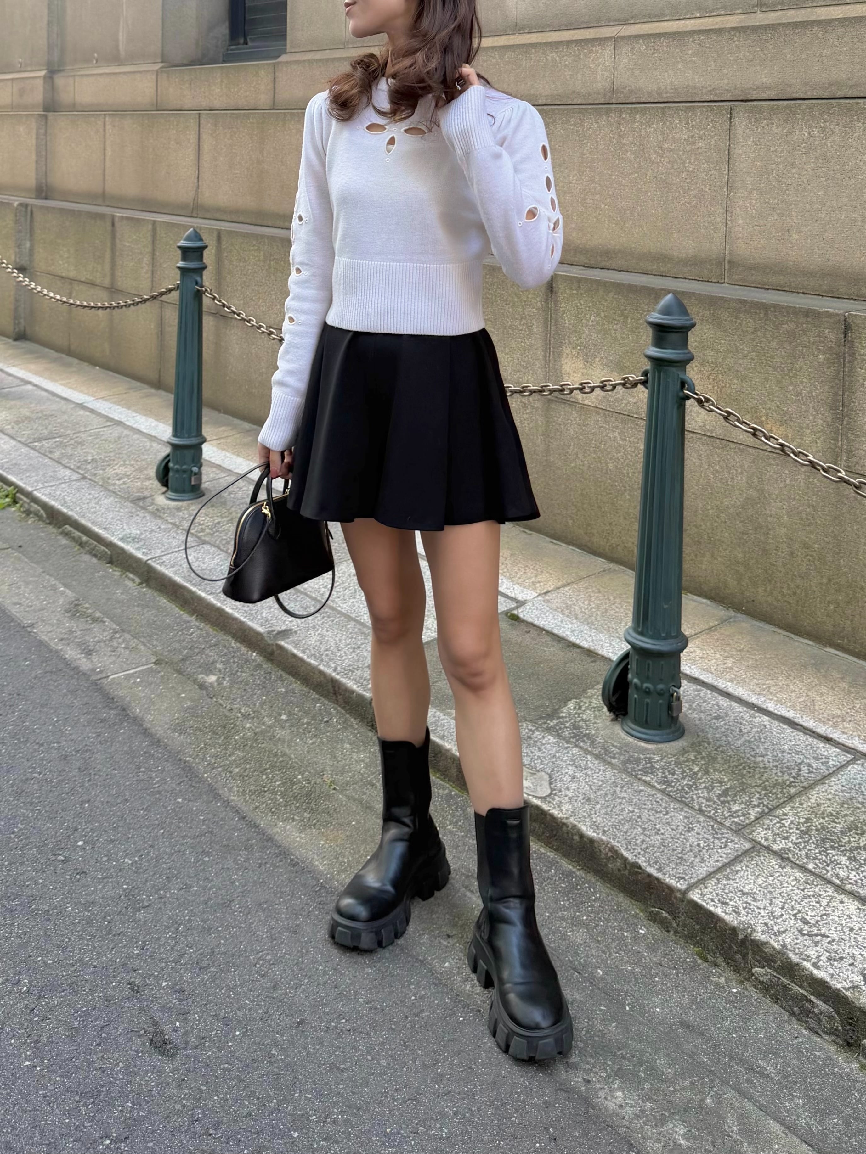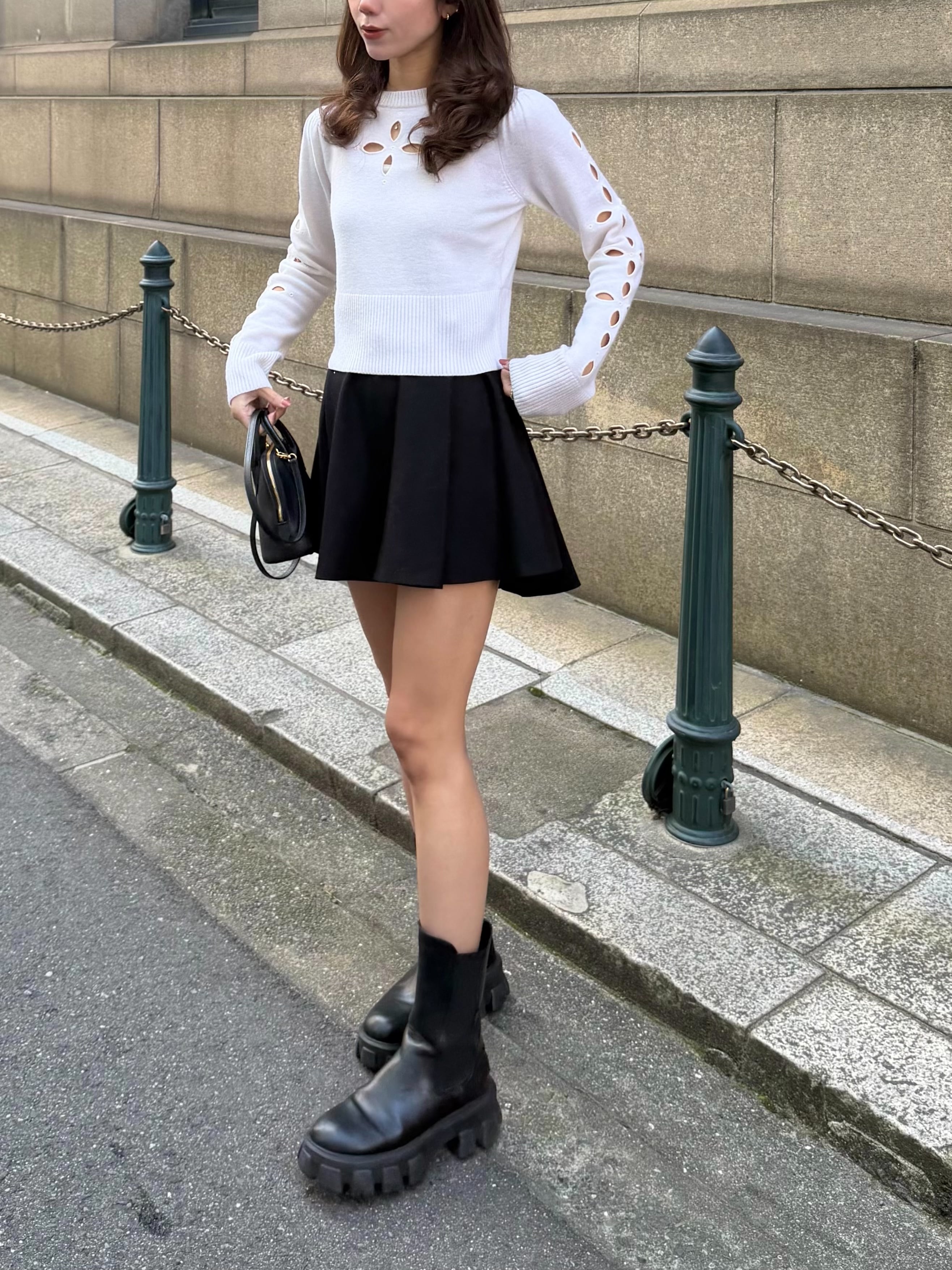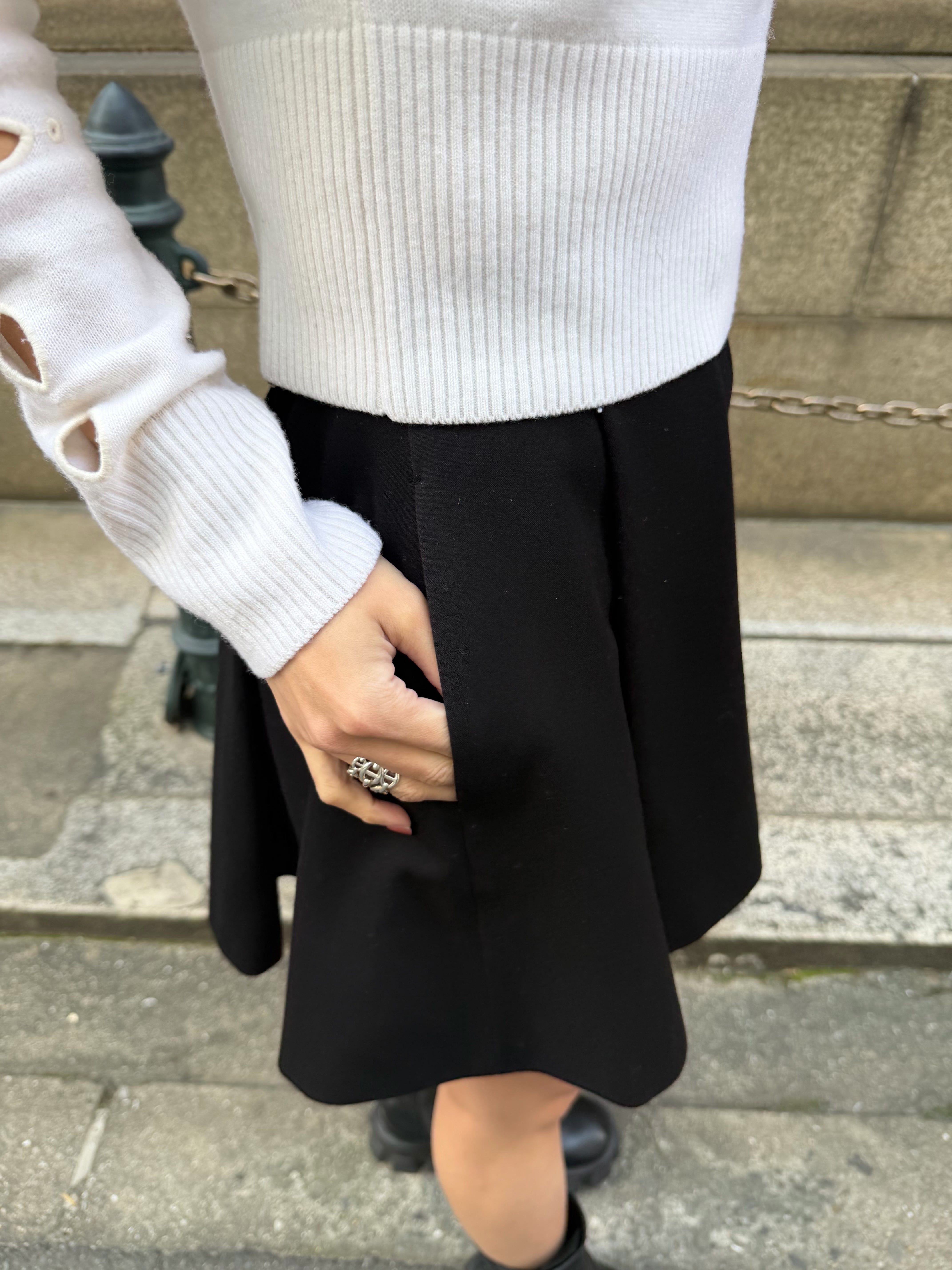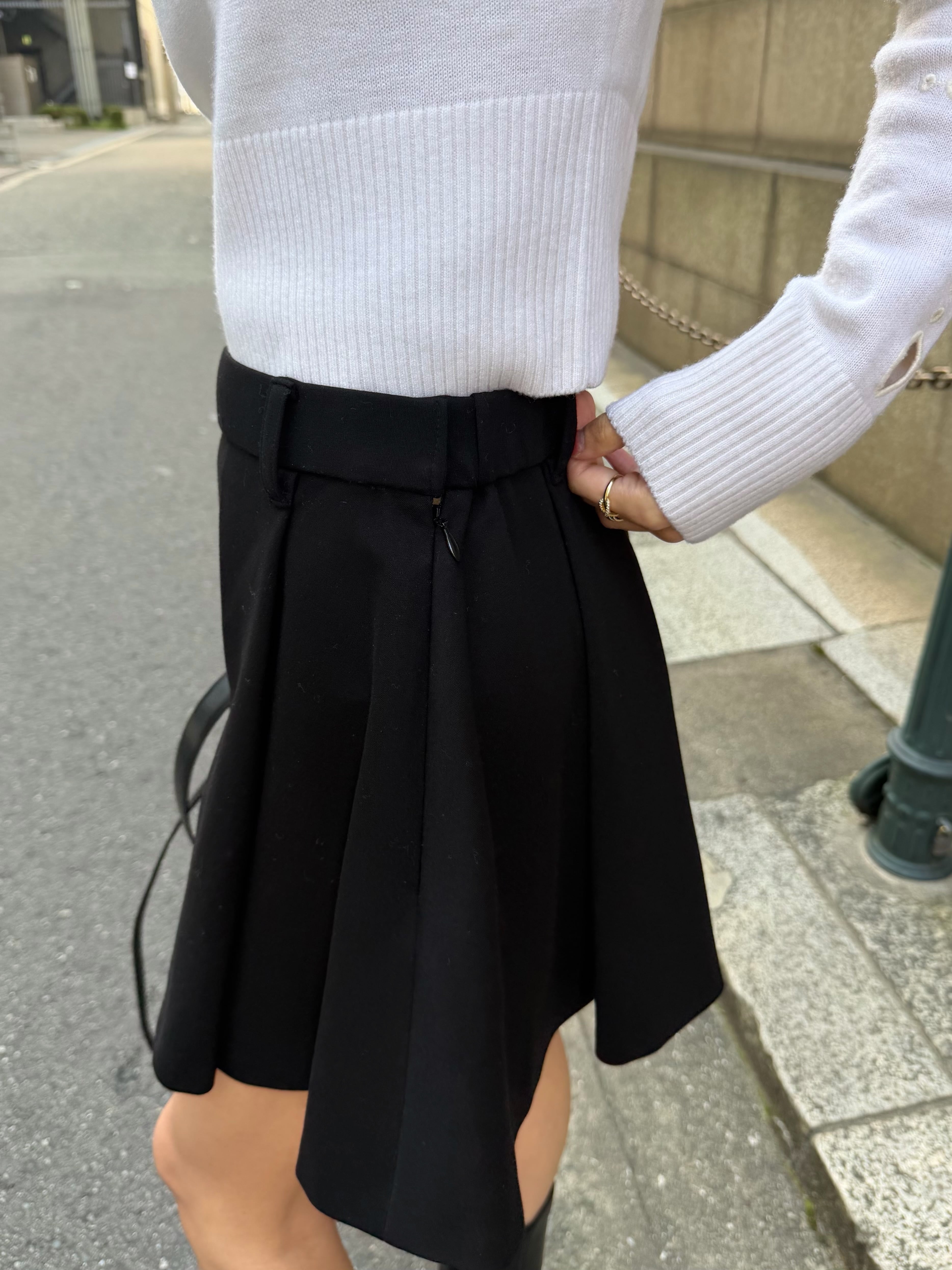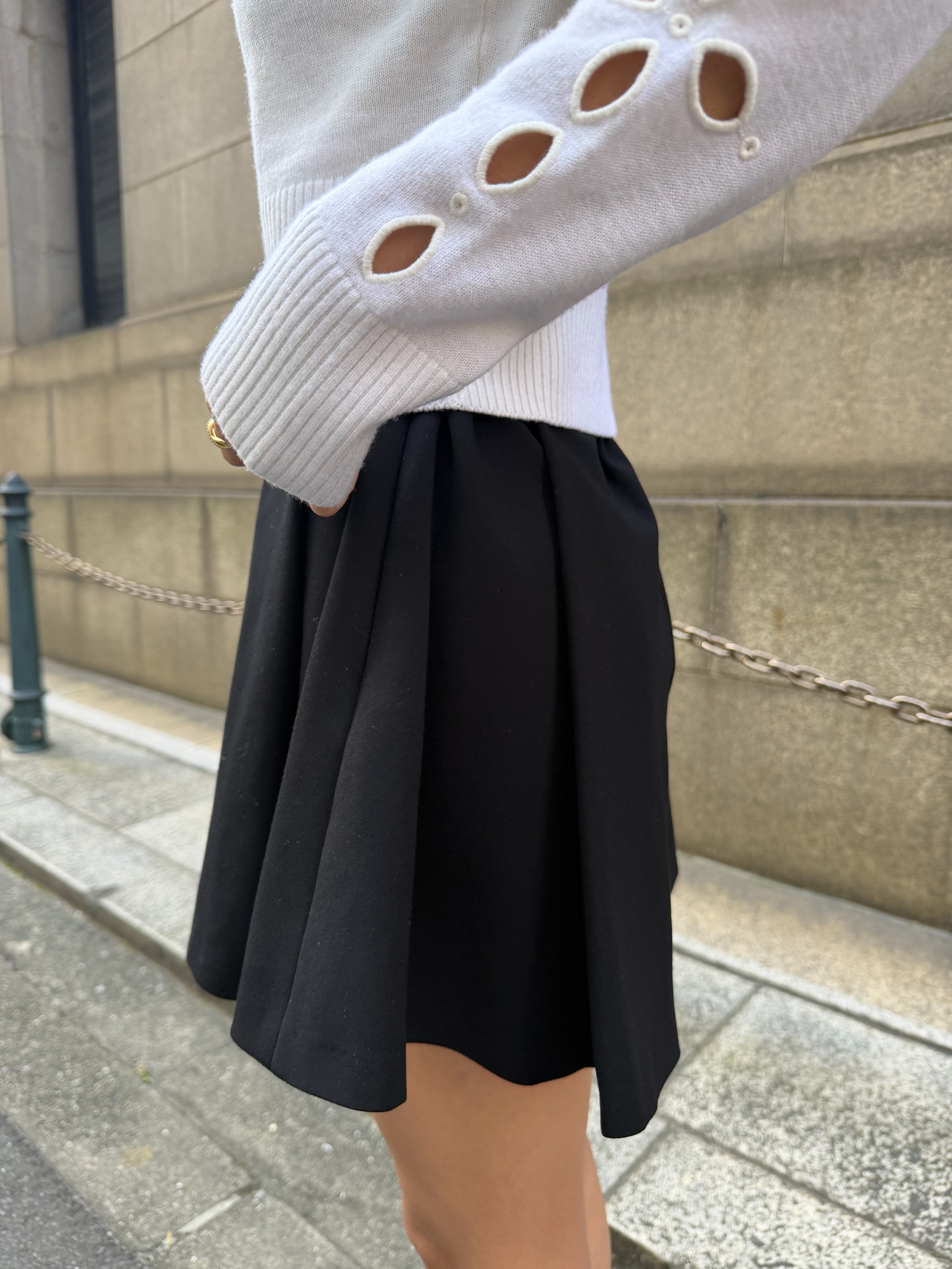 アウトタックのプリーツ仕様が立体的で女性らしい印象を演出し、フレア感とプリーツの左右バランスにも拘ることで、美しいシルエットに仕上げました。