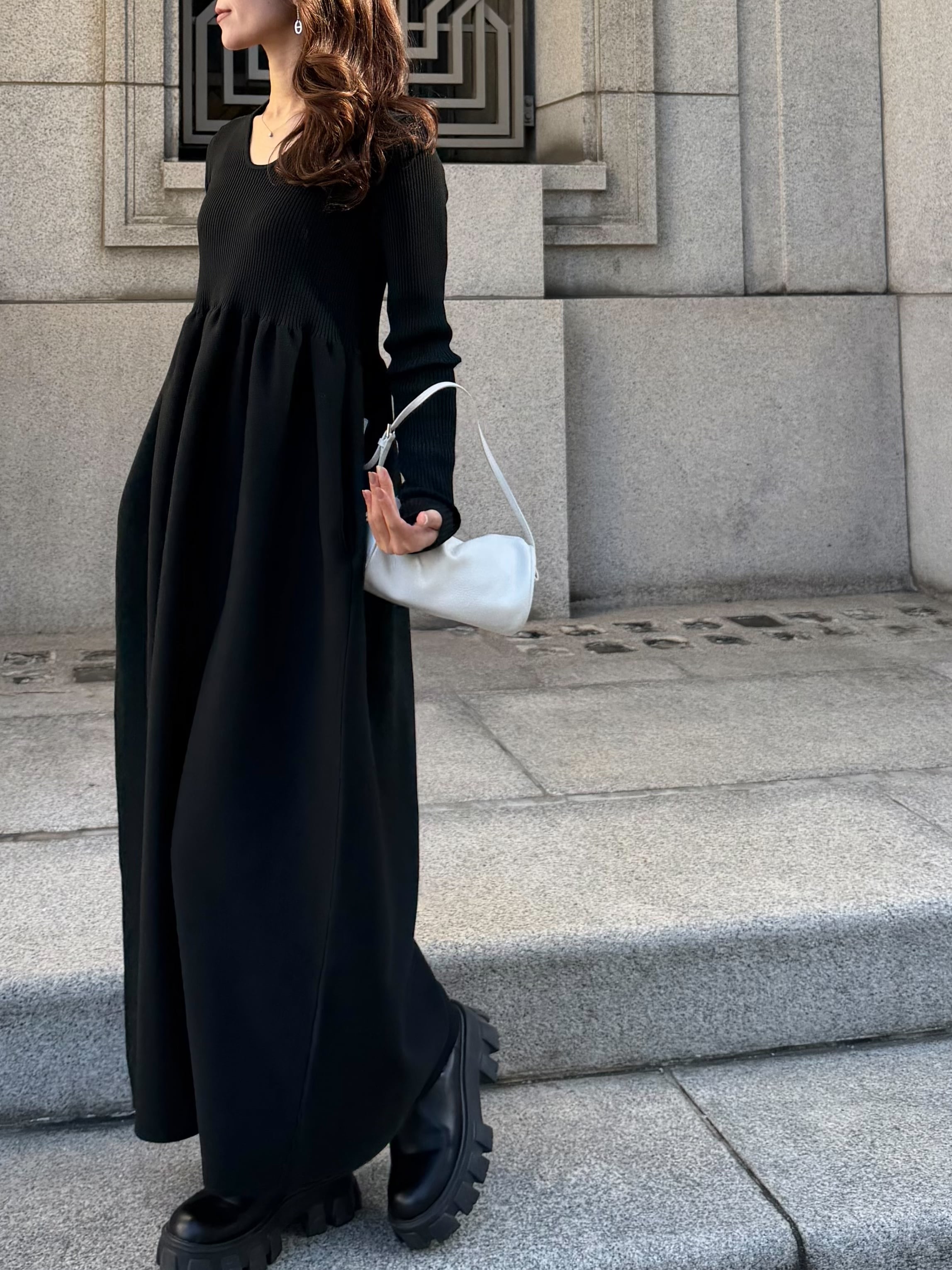 上身頃と袖はすっきりとしたリブ編みにし、ウエスト位置からウェーブタックを入れるこで、編み続きでありながら立体的なシルエットを形成。切替から広がるフレアラインは、歩くたびに美しく揺れ、ボリュームのあるフォルムながらも軽やかな印象に。日常使いはもちろん、長時間の外出や旅行でも大活躍します。