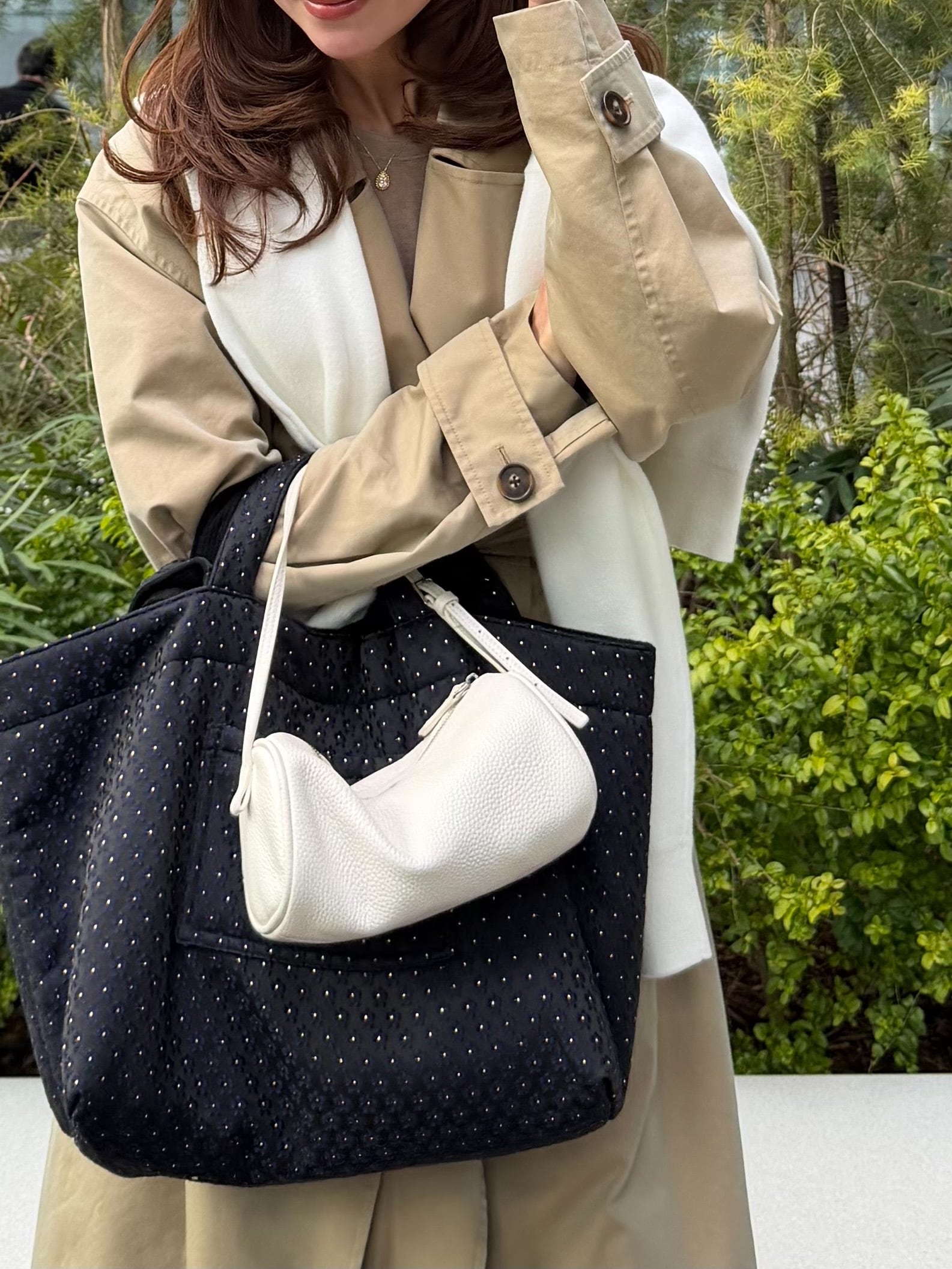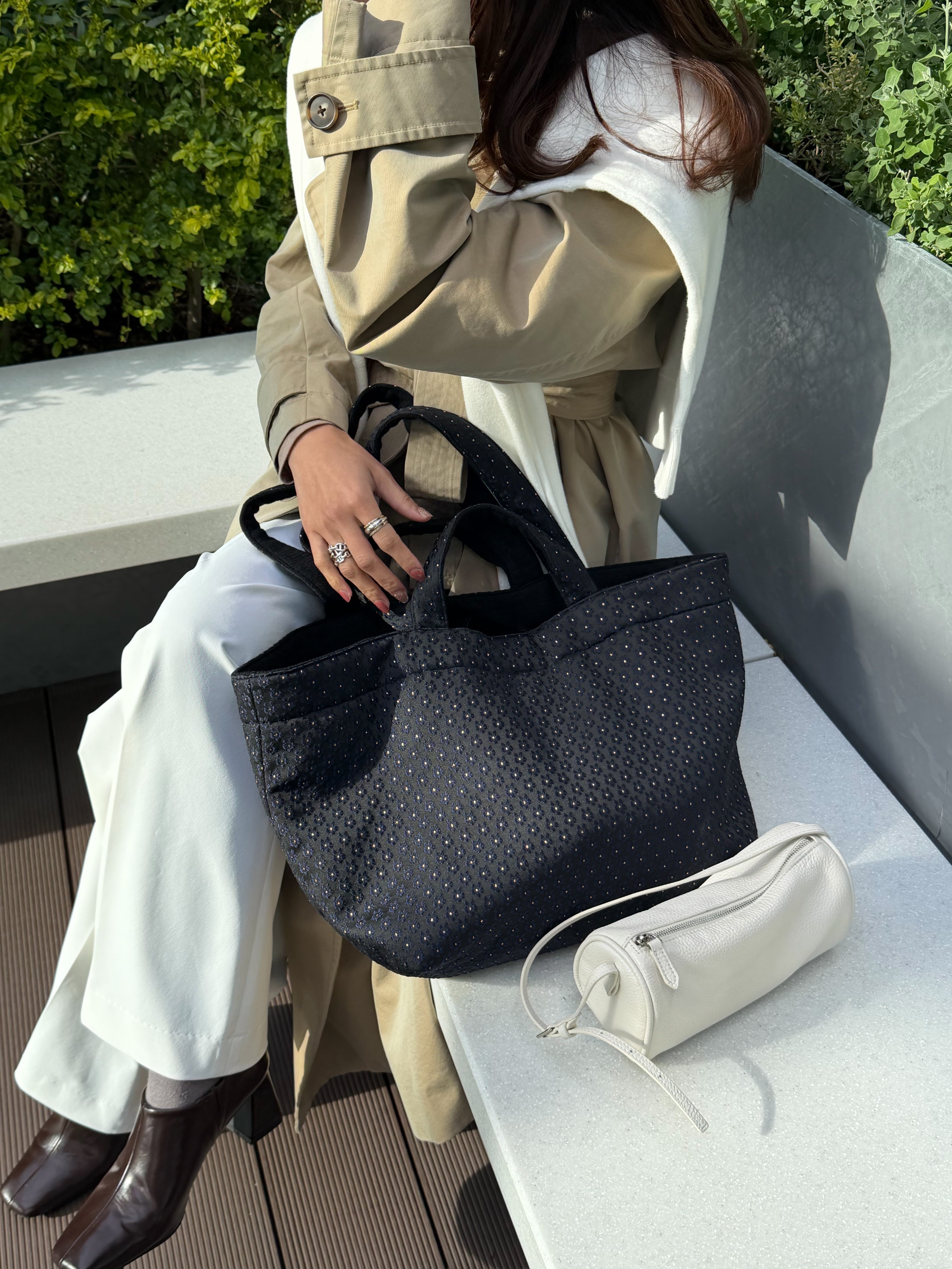 表情豊かなジャガード素材で仕立てたトートバッグ。繊細なフラワージャガードが、落ち着いた上品さを添え、大人のスタイリングにも馴染むデザインに仕上げました。