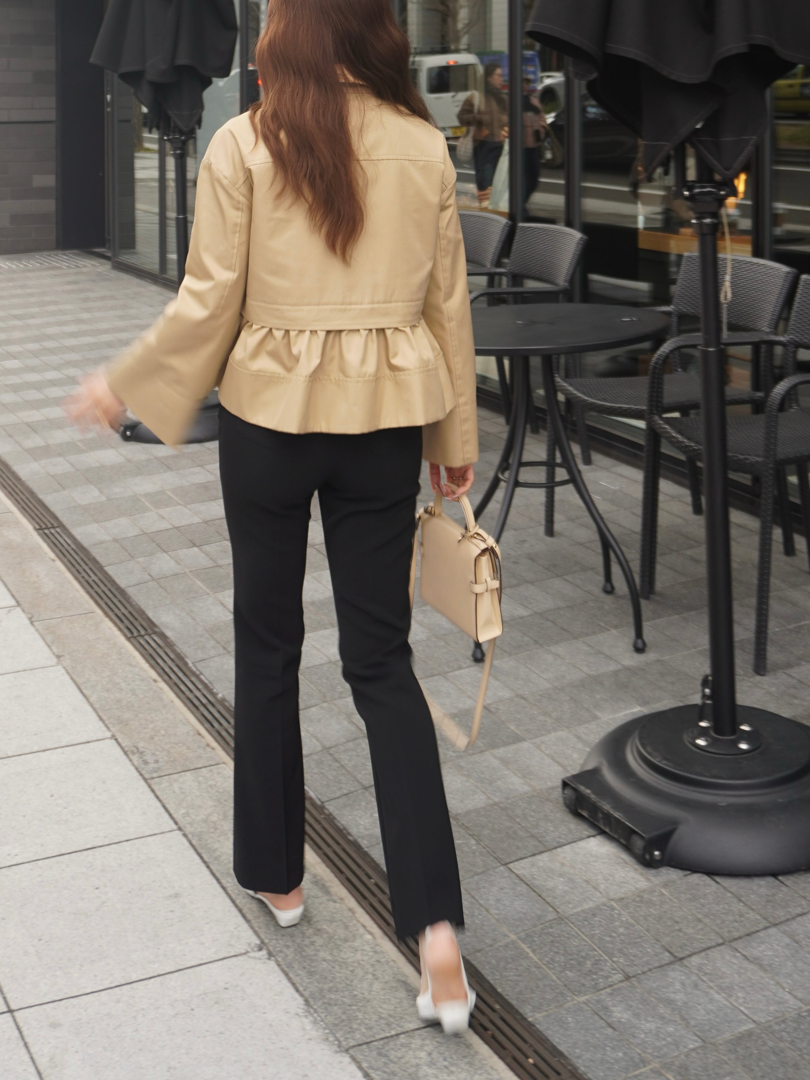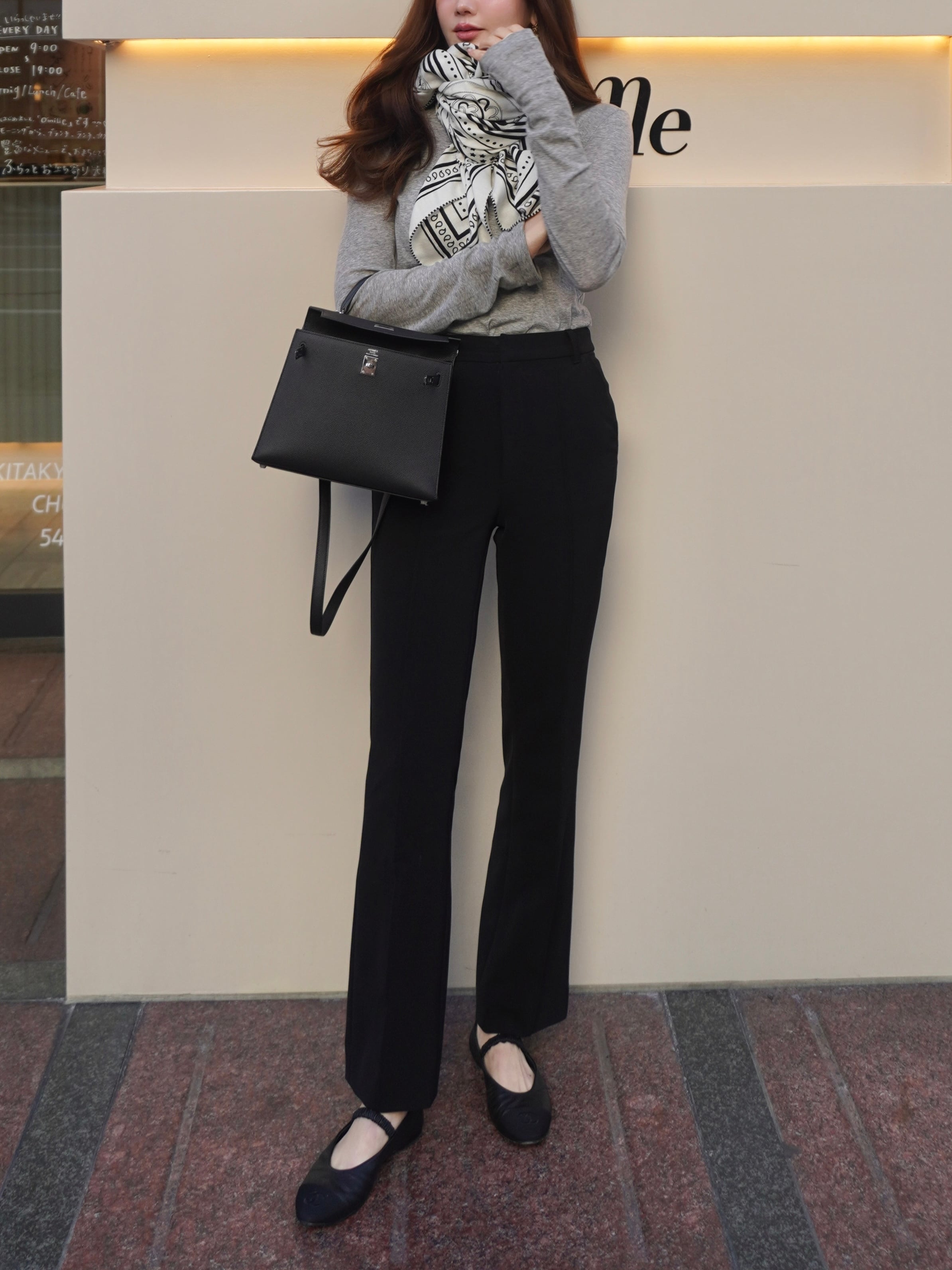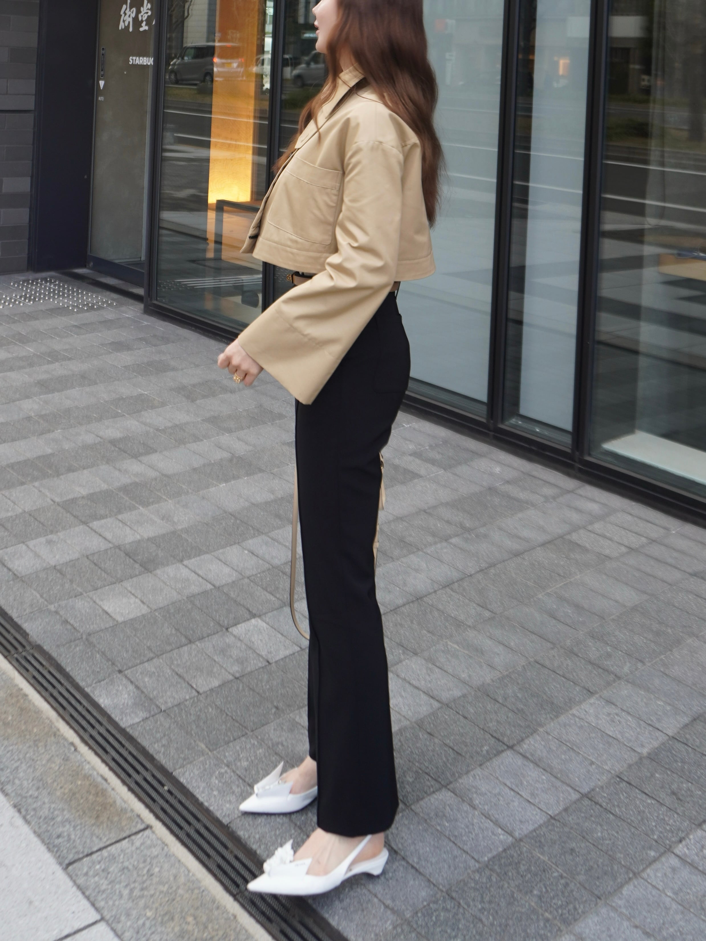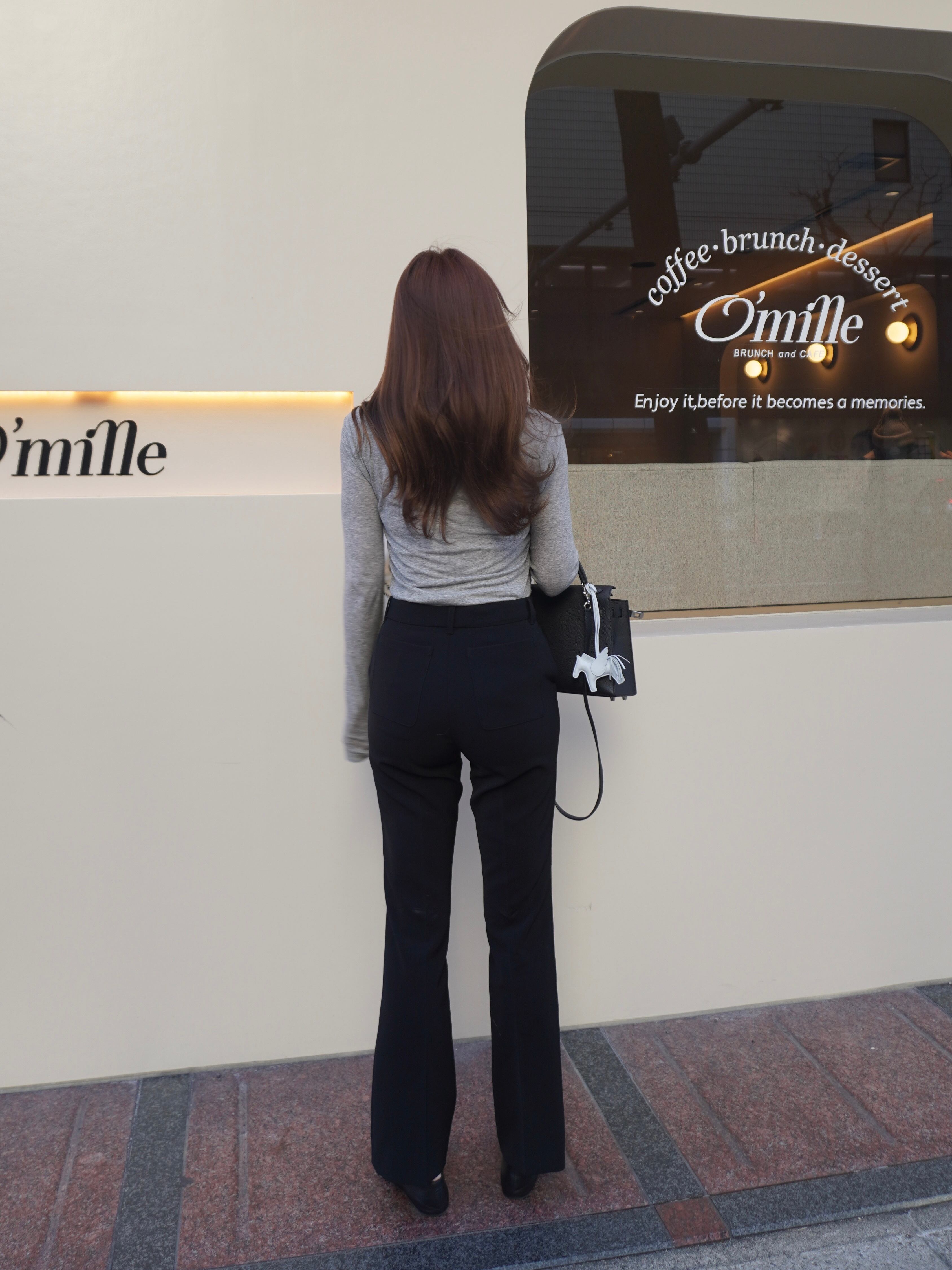 膨らみのある糸を使用したダブルクロス素材の超美脚シルエットパンツ。ピンタックを施したセンタープレスの仕様に、膝から裾にかけてのフレアなシルエットが足のラインをすっきり綺麗にみせてくれます。足が長く、細く見えることを追求して、ウエストやヒップ、モモ周りの細部にわたりパターンを設計しています。