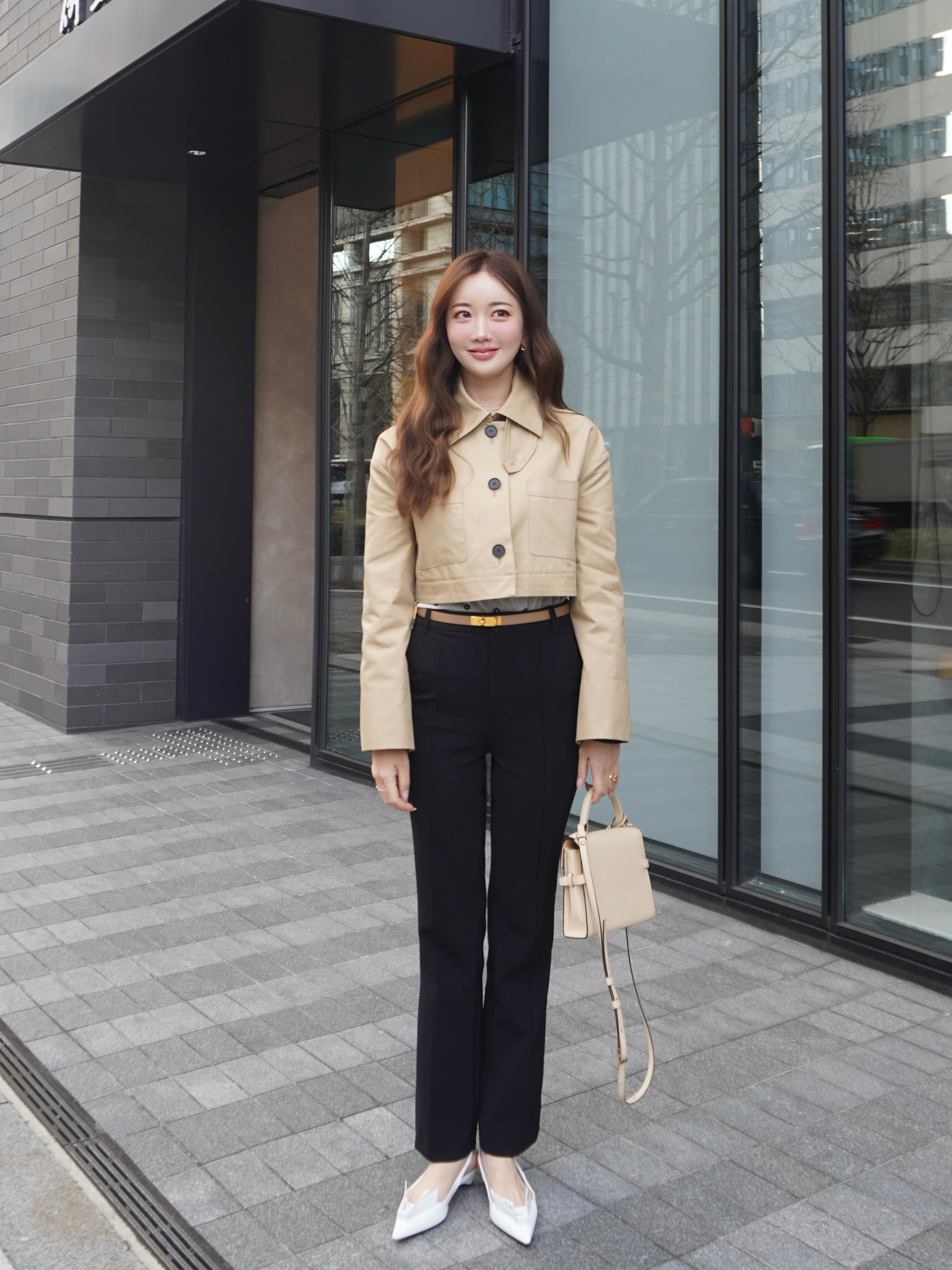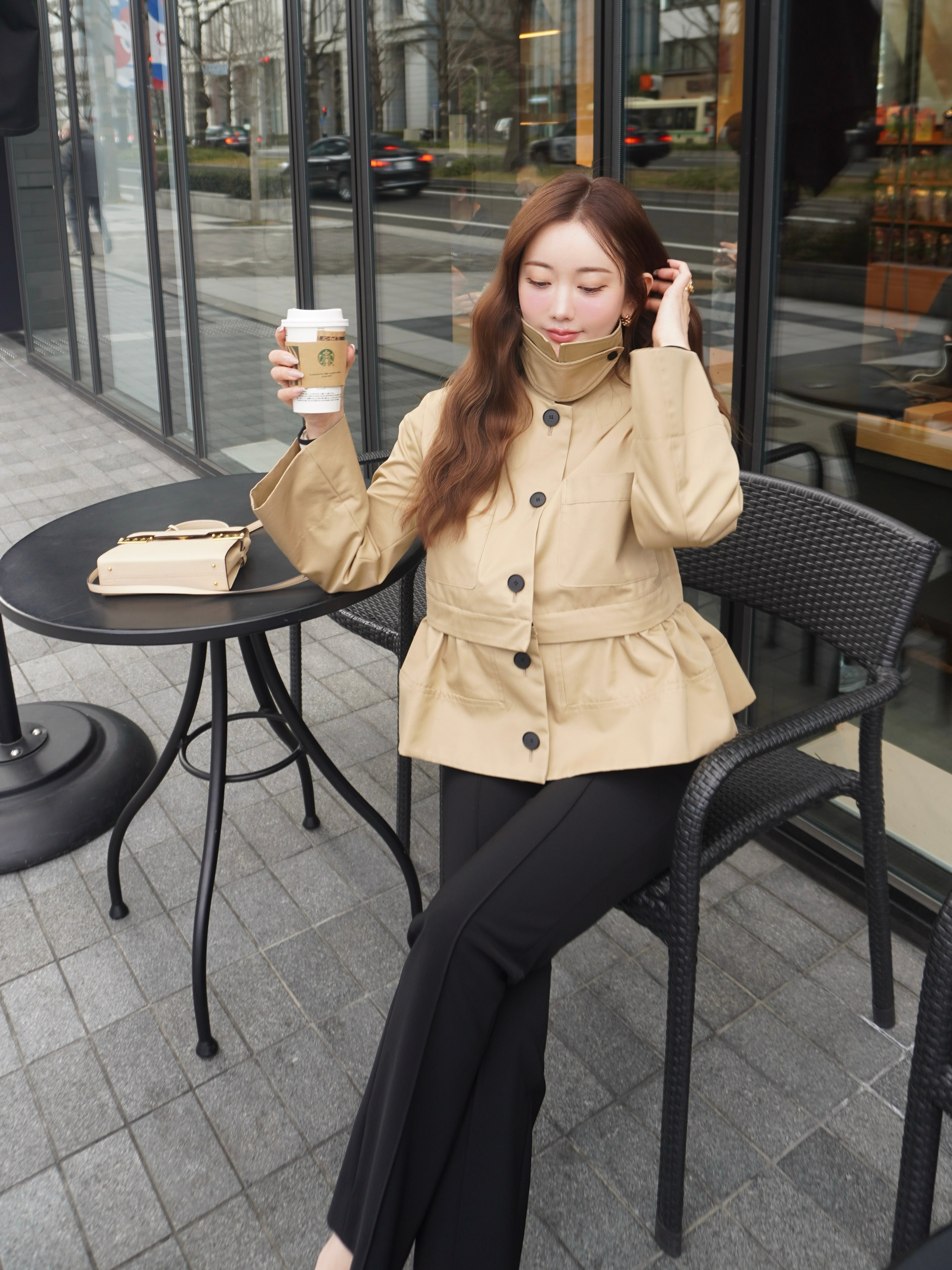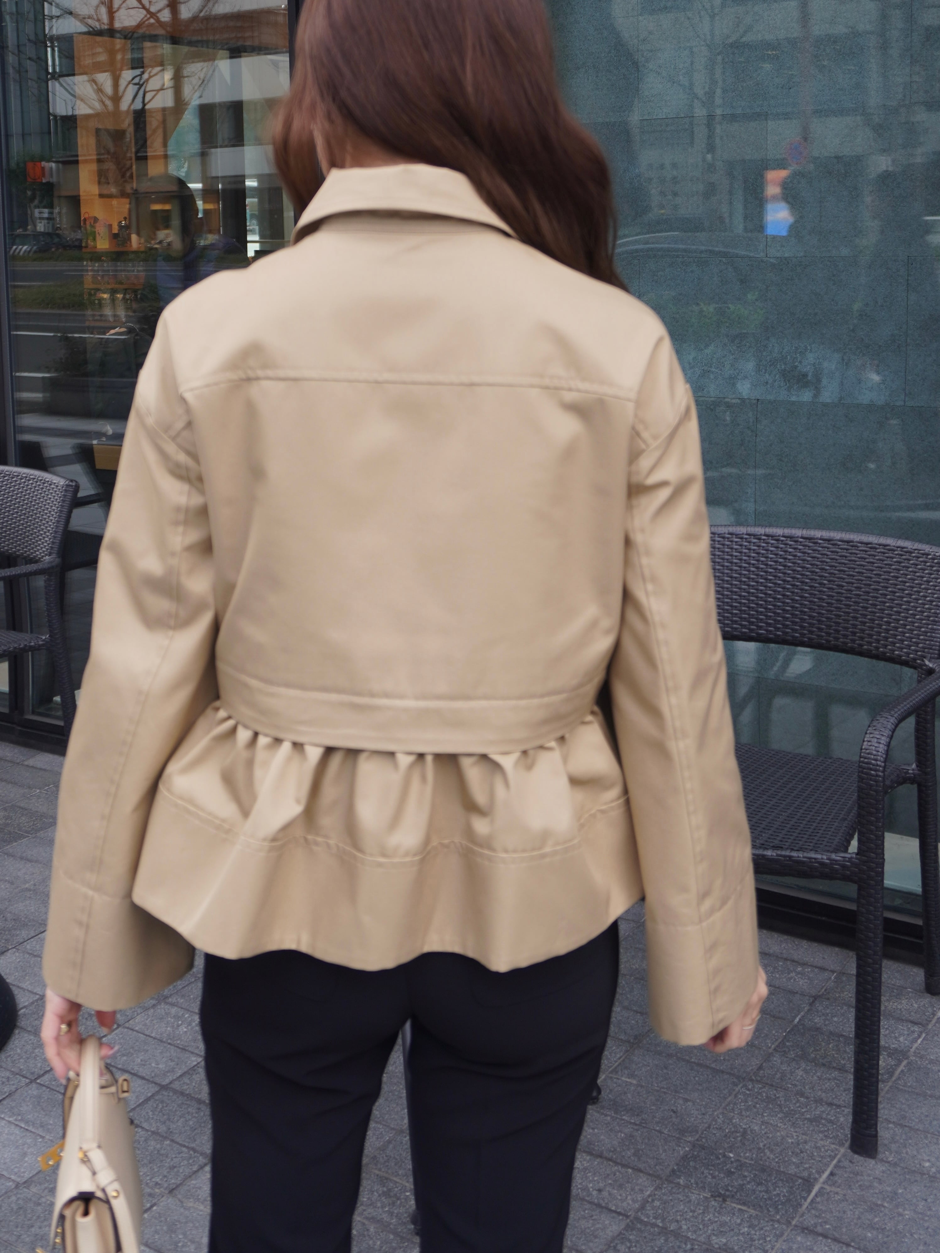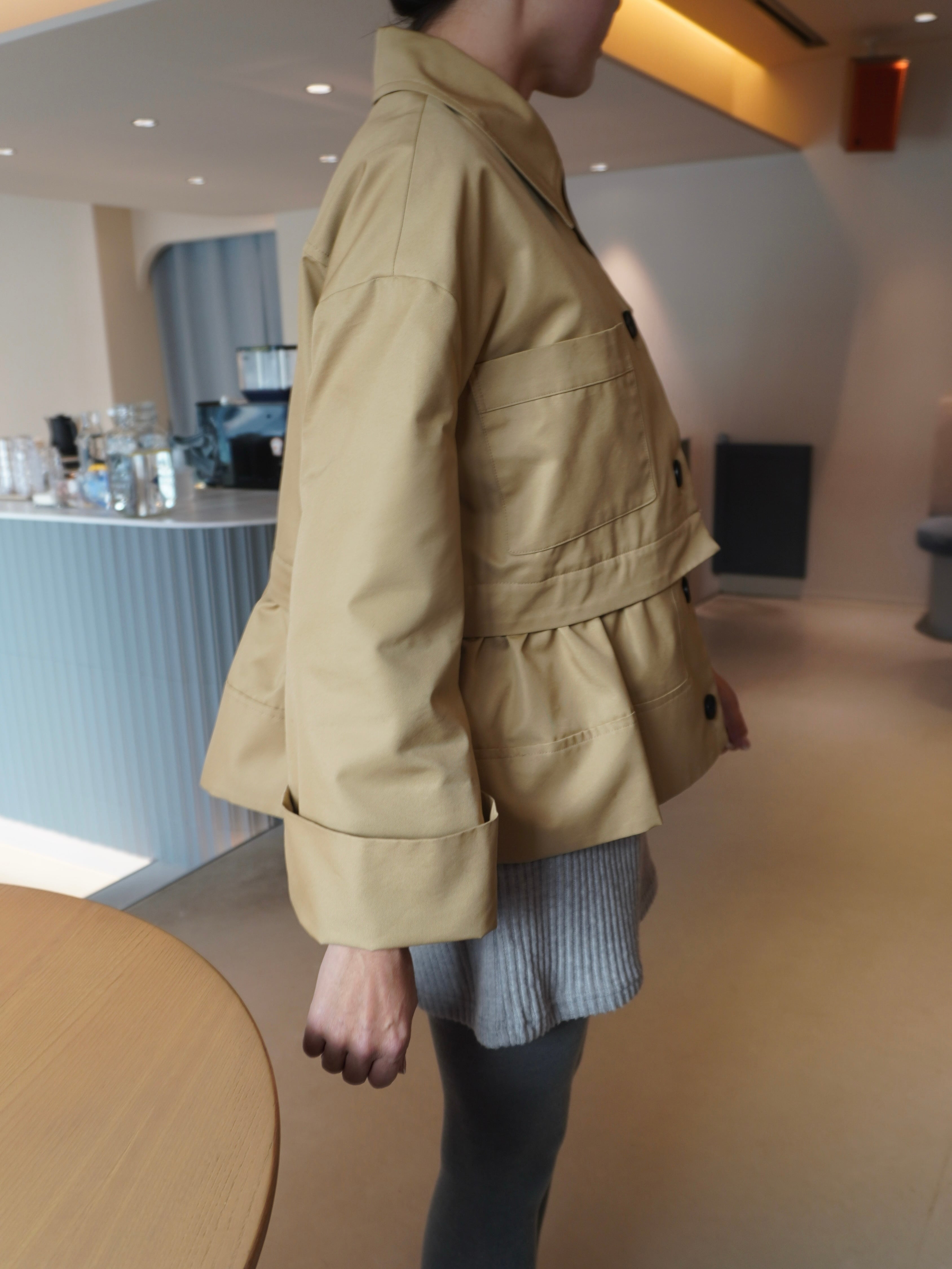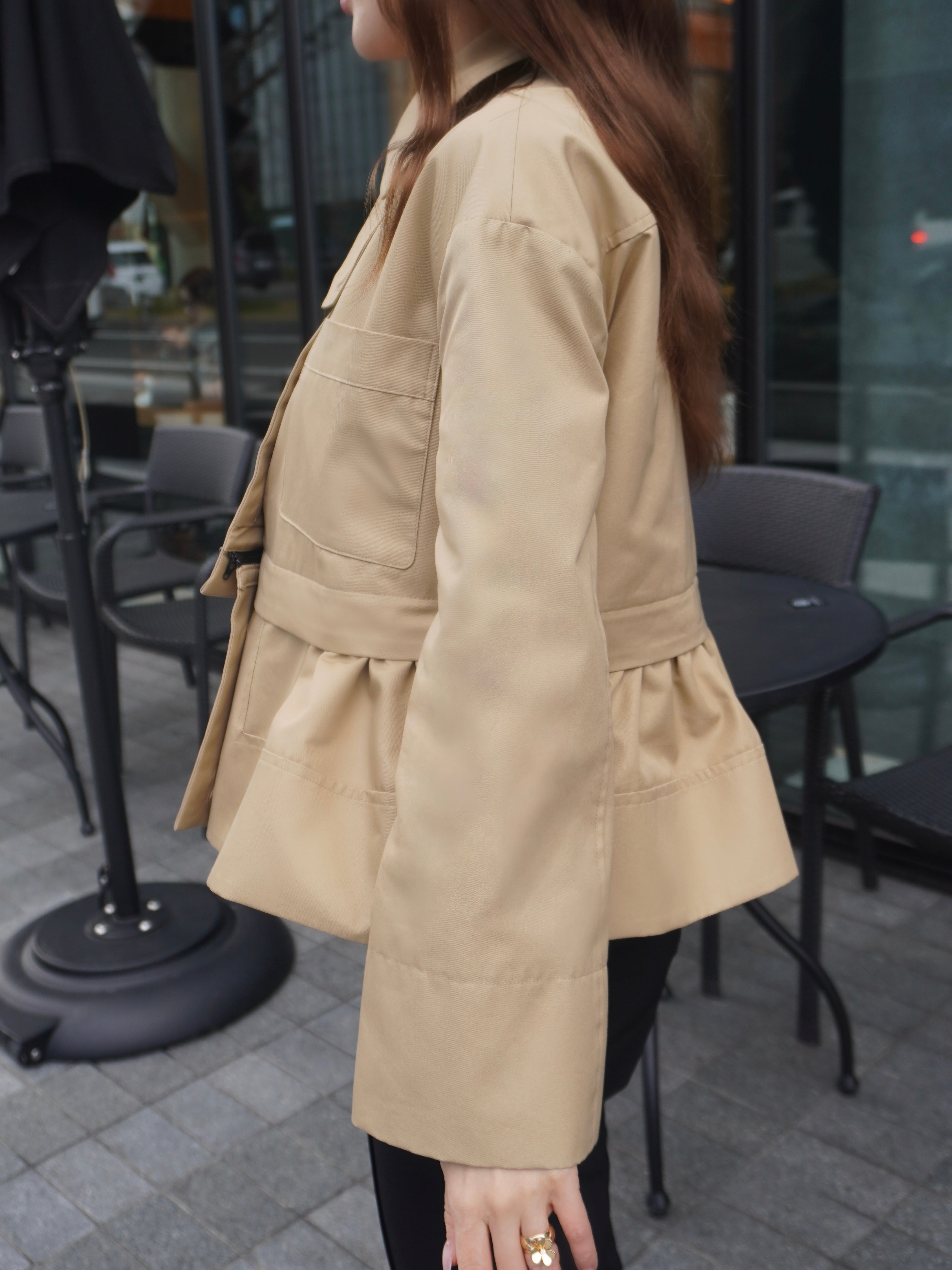 適度なハリ感と滑らかな表面感が特徴のギャバ素材を使用したミドル丈のトレンチコート。裾にギャザーを施し、立体感をプラスして女性らしさとモード感のある1枚に。裾部分はファスナーで取り外せる仕様にし、ショート丈としても着用可能です。フレアデザインの袖は、太めに折り上げていただく事で、低身長の方にもフィットしてくれます。サイドはスラッシュポケット仕様にすることで、すっきり見えるように仕上げています。また、取り外し可能なチンタブをつけ、襟を立てても着ていただけます。他にはないHYEONらしさが詰まった1枚です。