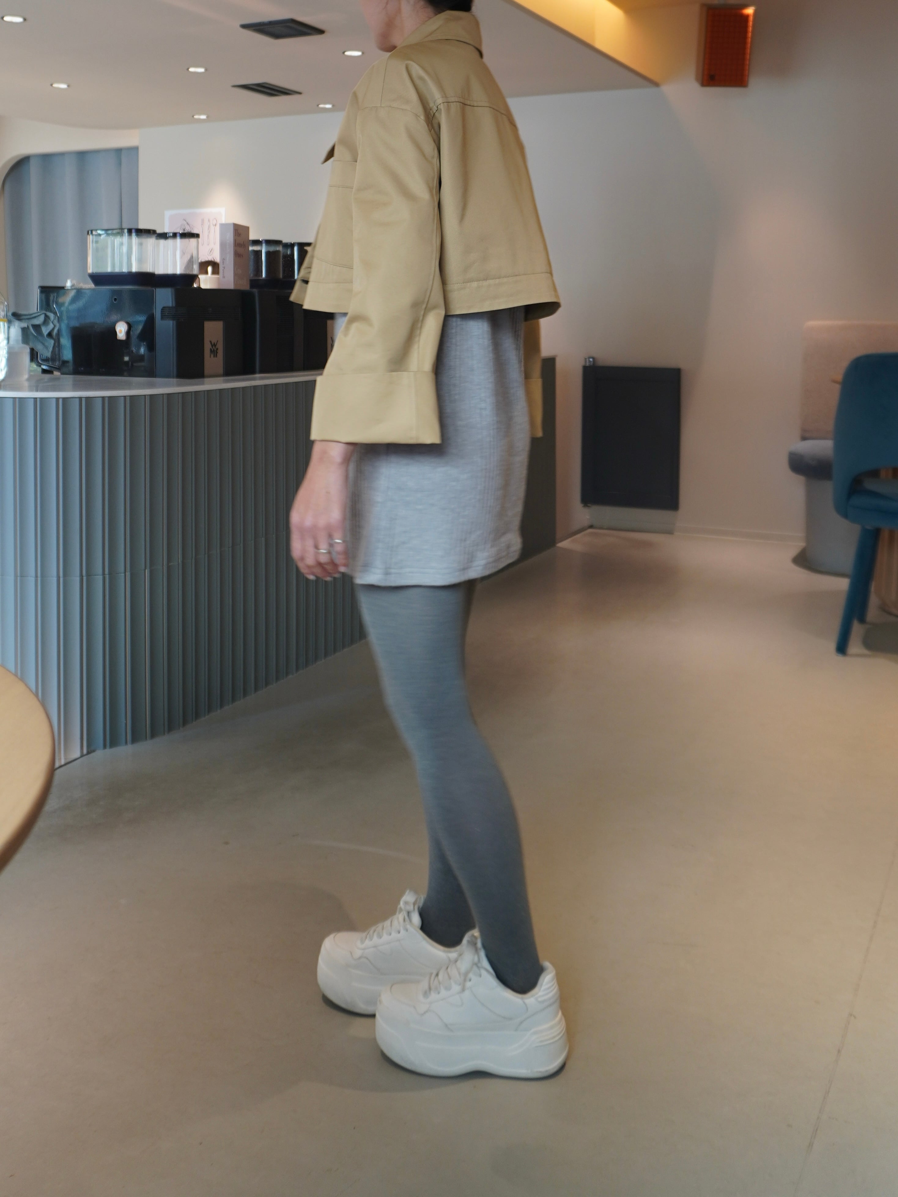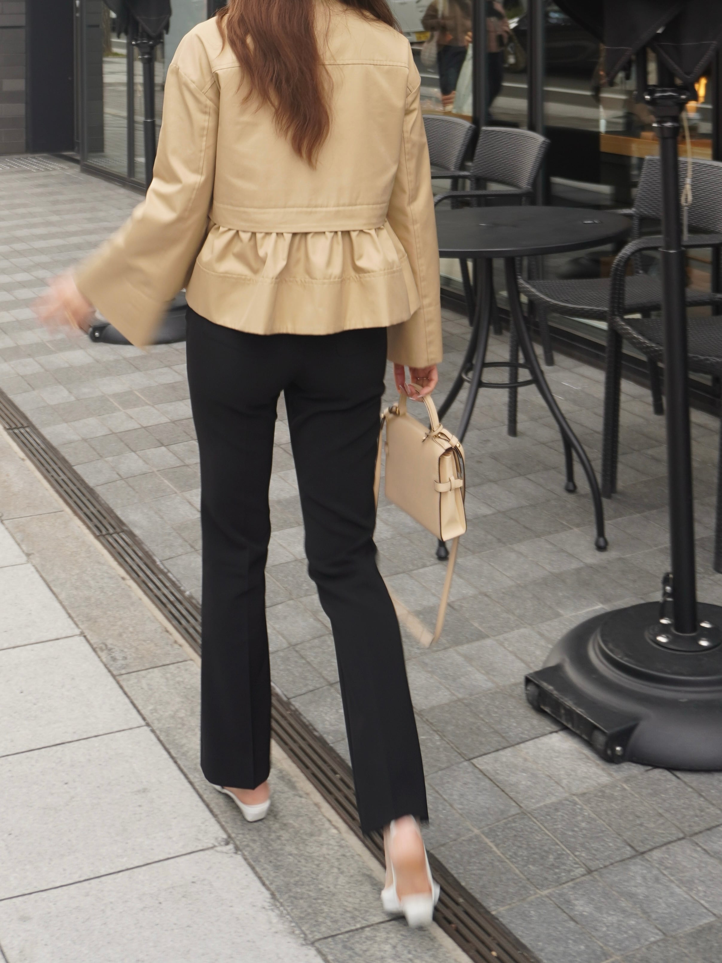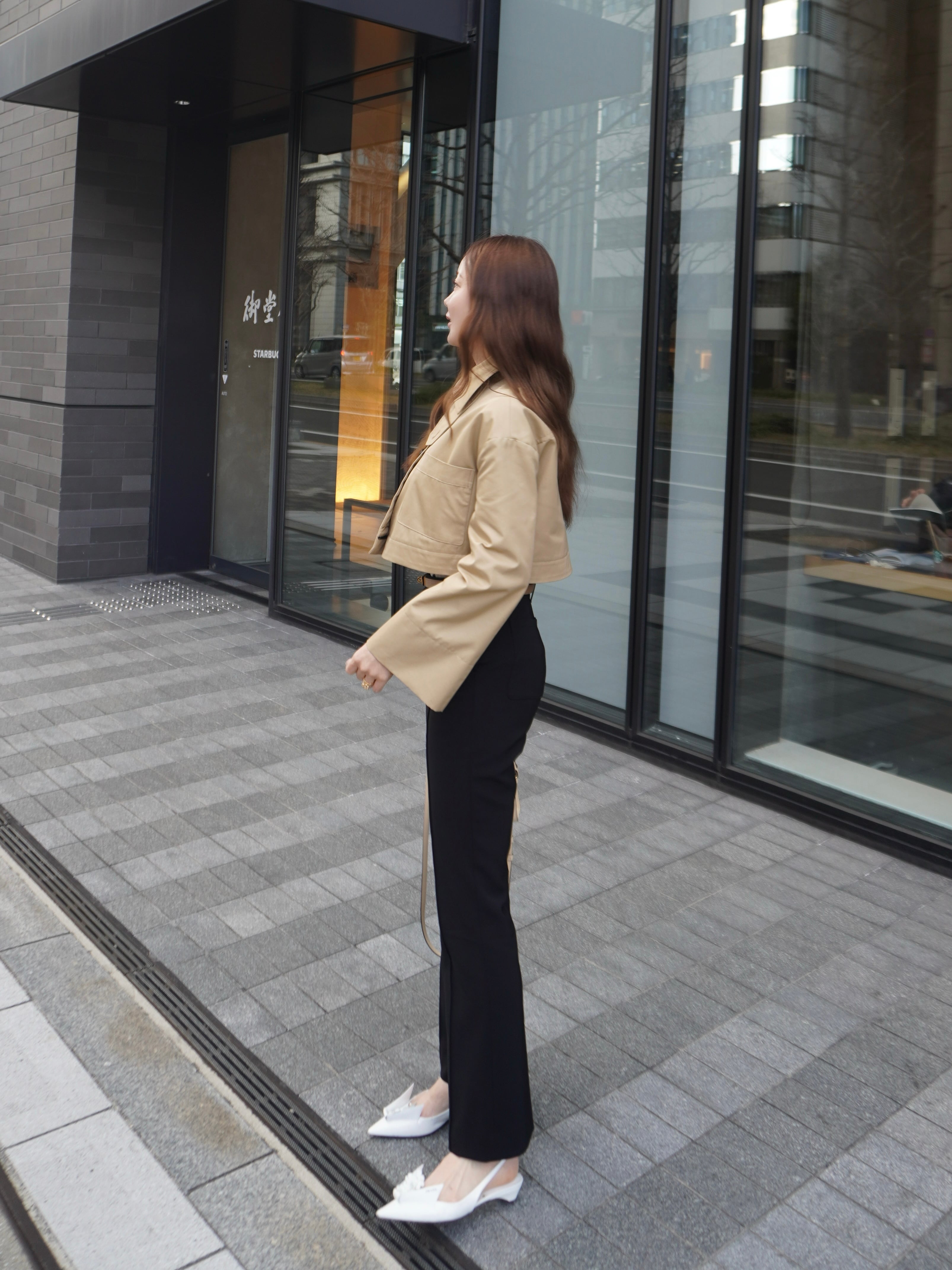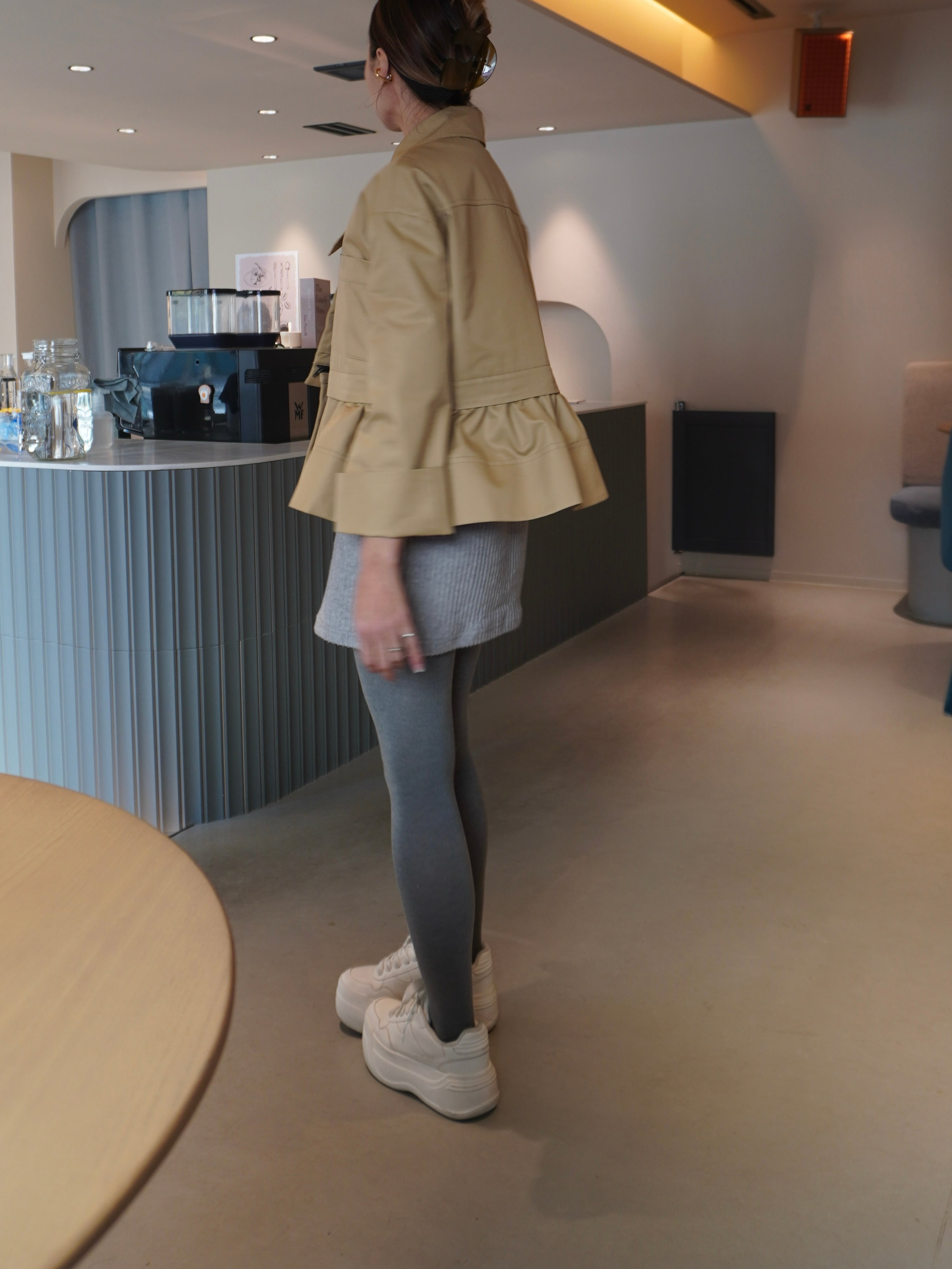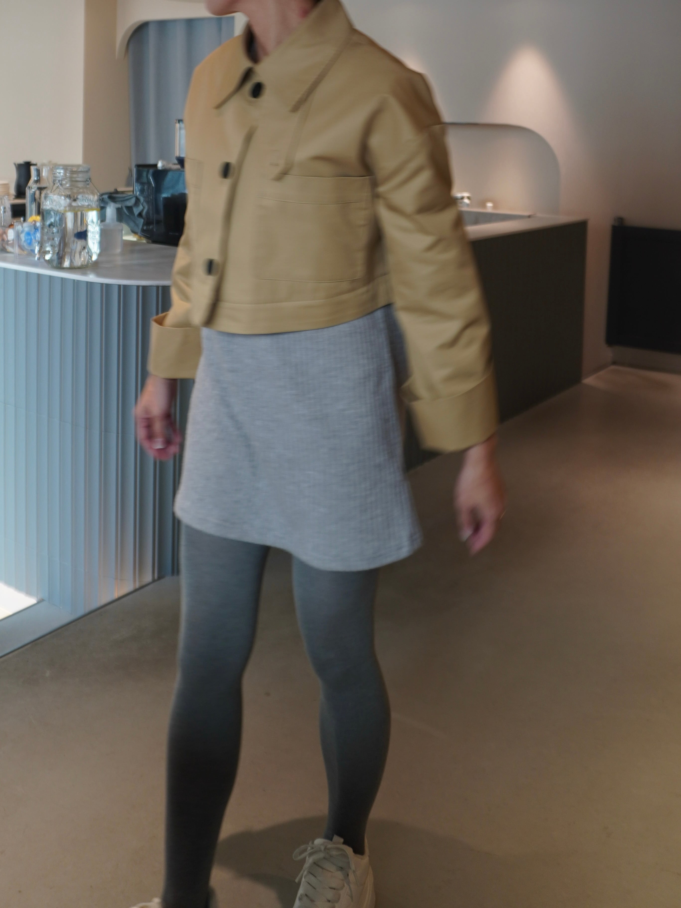 適度なハリ感と滑らかな表面感が特徴のギャバ素材を使用したミドル丈のトレンチコート。裾にギャザーを施し、立体感をプラスして女性らしさとモード感のある1枚に。裾部分はファスナーで取り外せる仕様にし、ショート丈としても着用可能です。フレアデザインの袖は、太めに折り上げていただく事で、低身長の方にもフィットしてくれます。サイドはスラッシュポケット仕様にすることで、すっきり見えるように仕上げています。また、取り外し可能なチンタブをつけ、襟を立てても着ていただけます。他にはないHYEONらしさが詰まった1枚です。