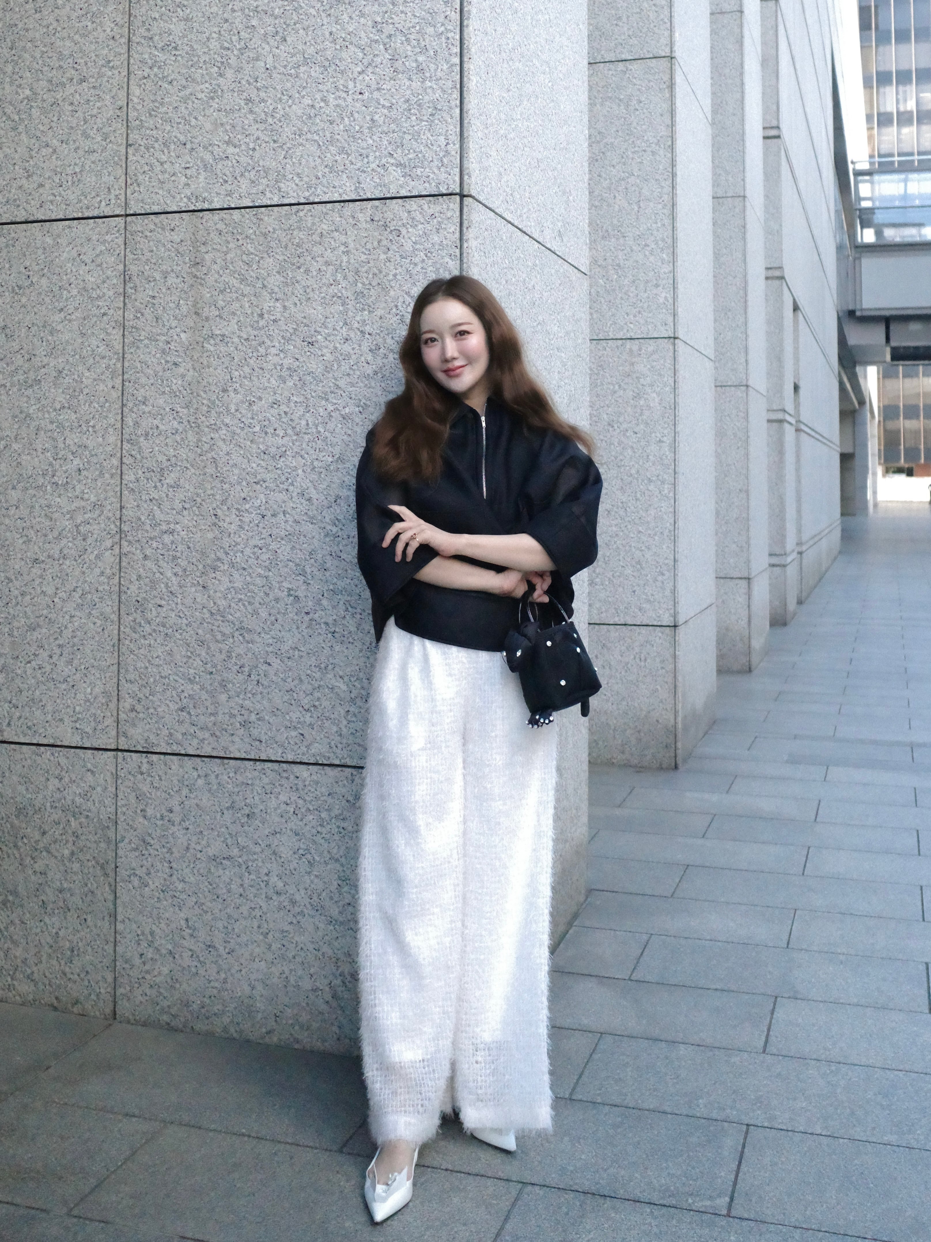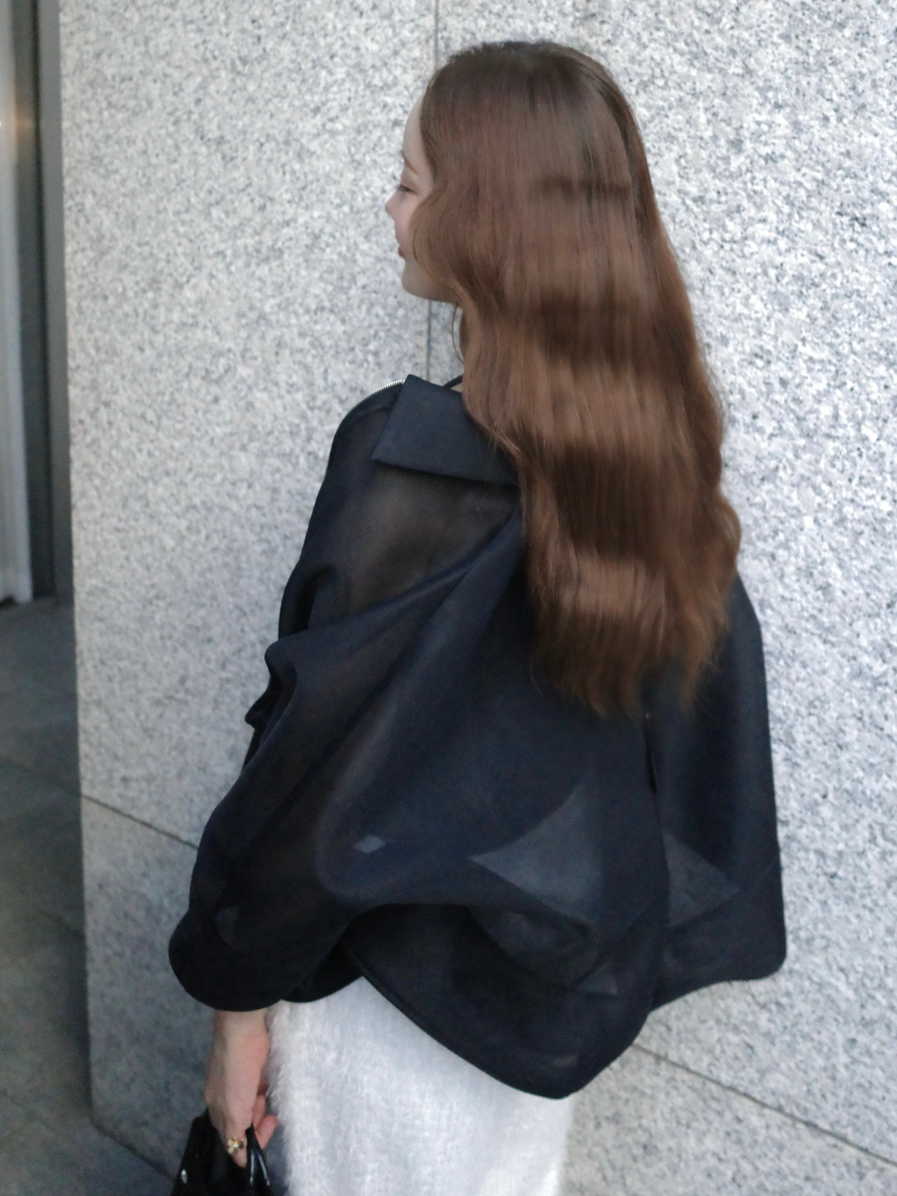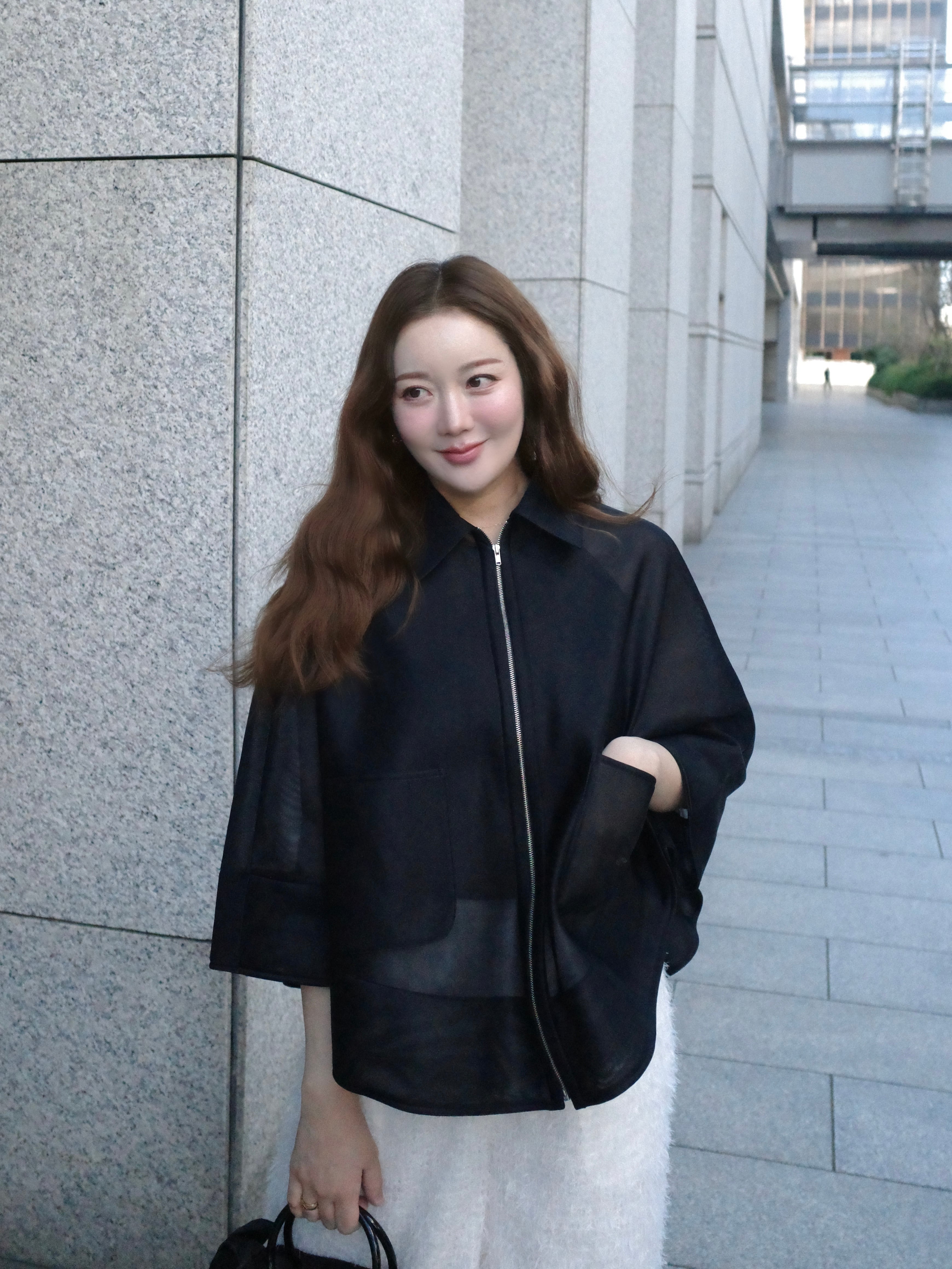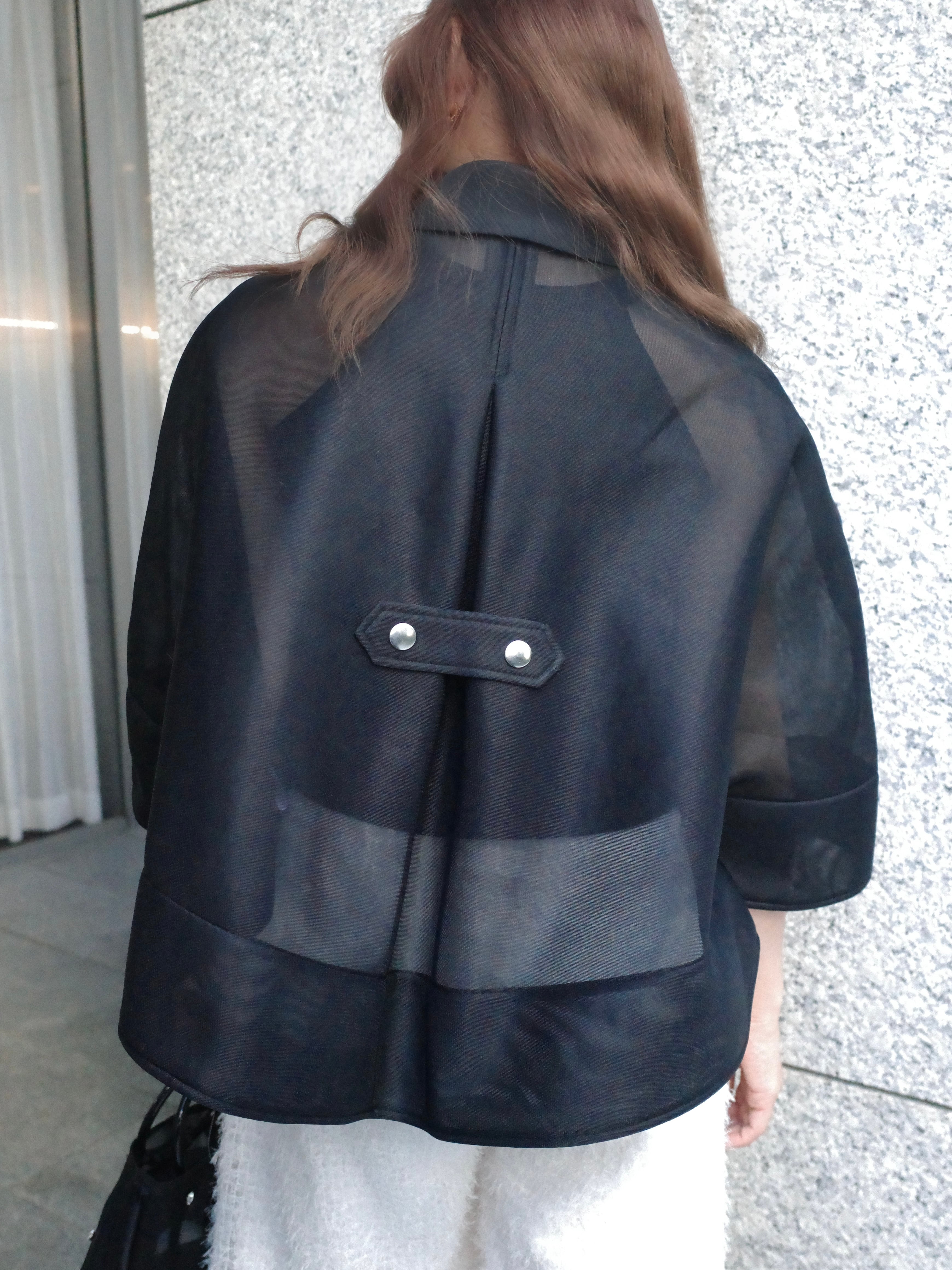 軽やかに纏える、Aラインシルエットのケープデザイン。動くたびに空気を含み、柔らかく広がる立体的なフォルムが、上品で洗練された印象を演出します。