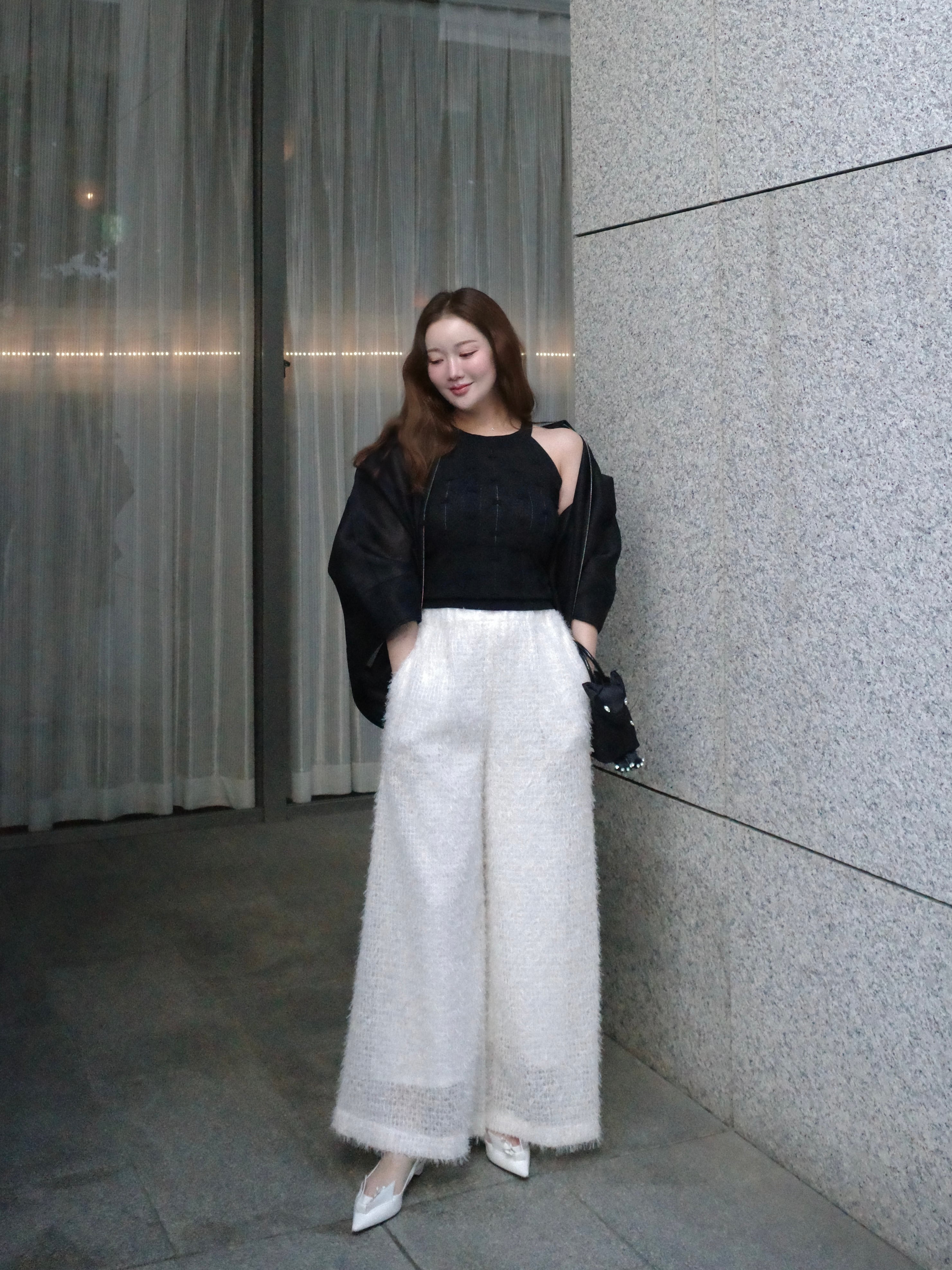素材は、20デニールのポリエステル糸を使用した、ダブルラッセル素材を採用。分織ならではのハリ感と、程よい透け感を兼ね備え、軽やかさと構築的なフォルムを両立しています。とても軽く、長時間の着用でもストレスフリーな着心地が特徴です。ご自宅でのお洗濯も可能です。(手洗い推奨)