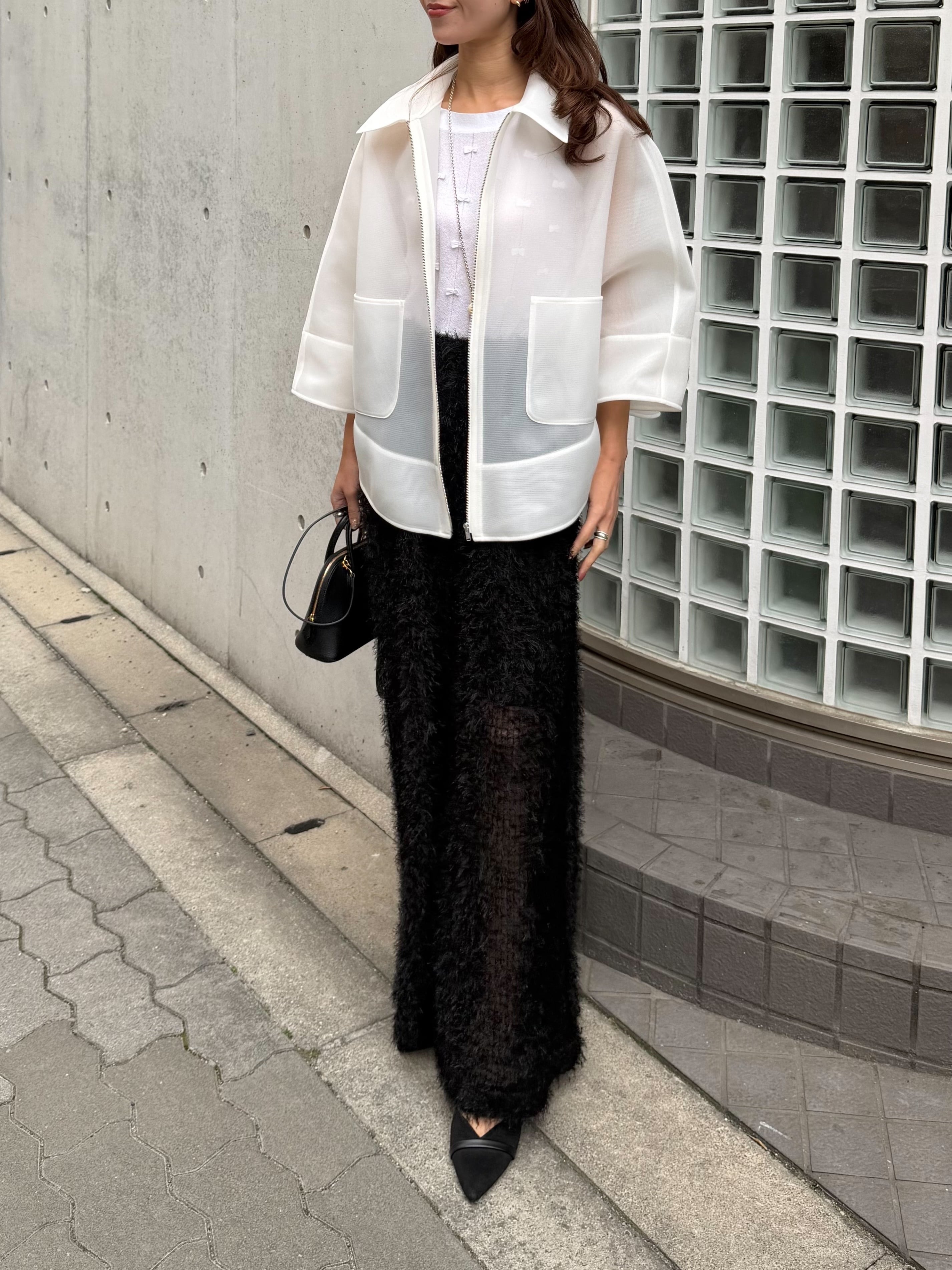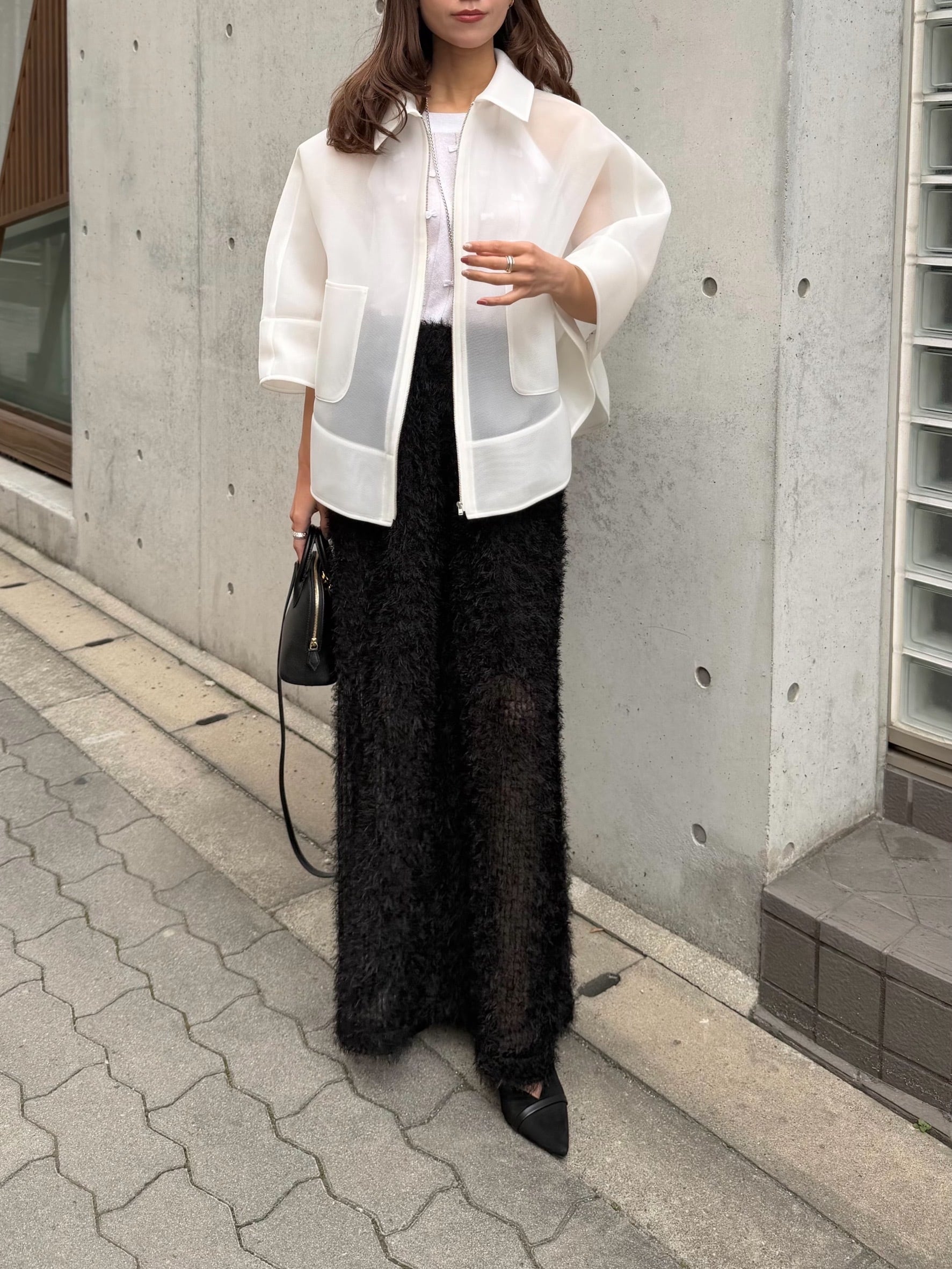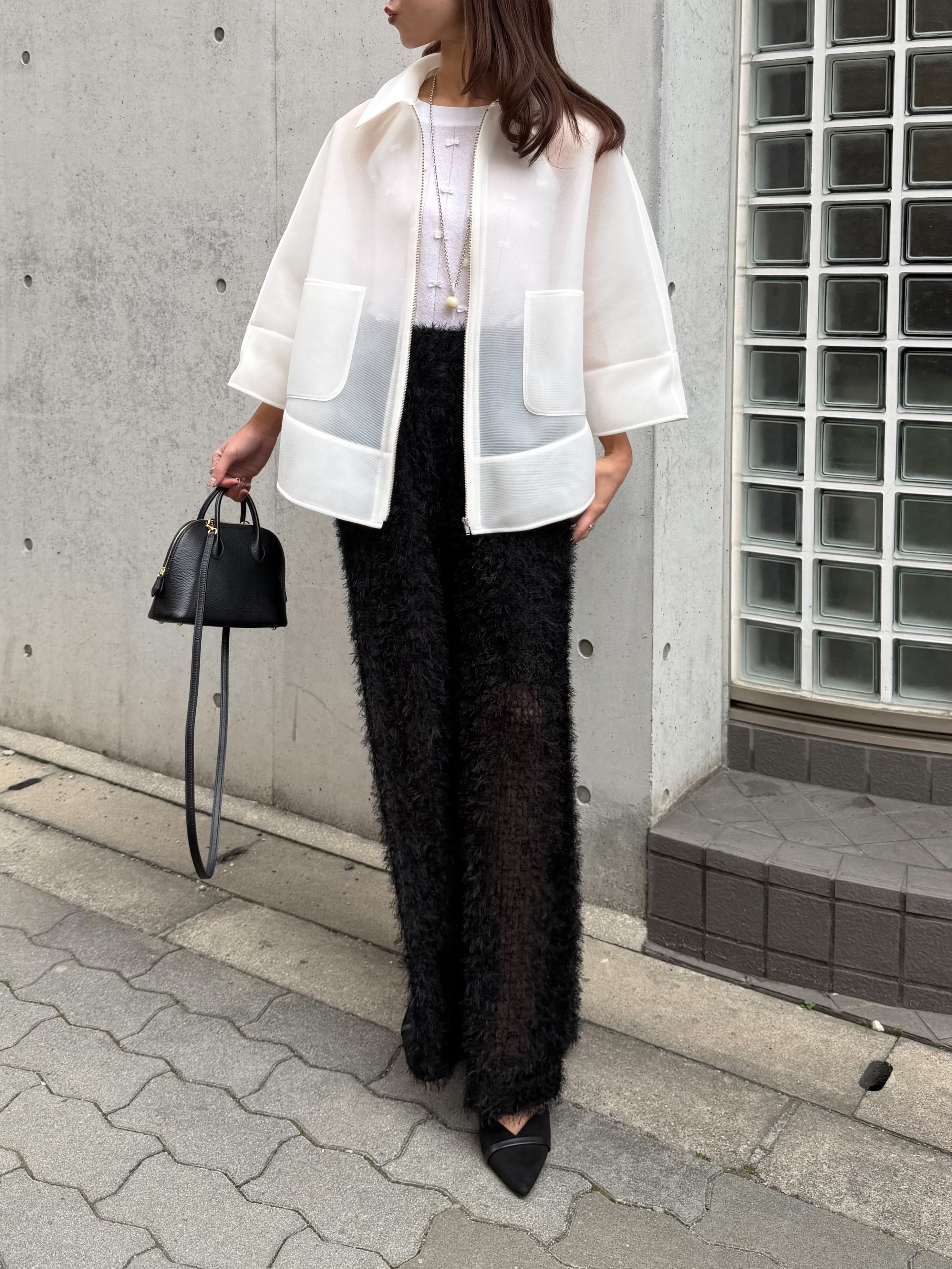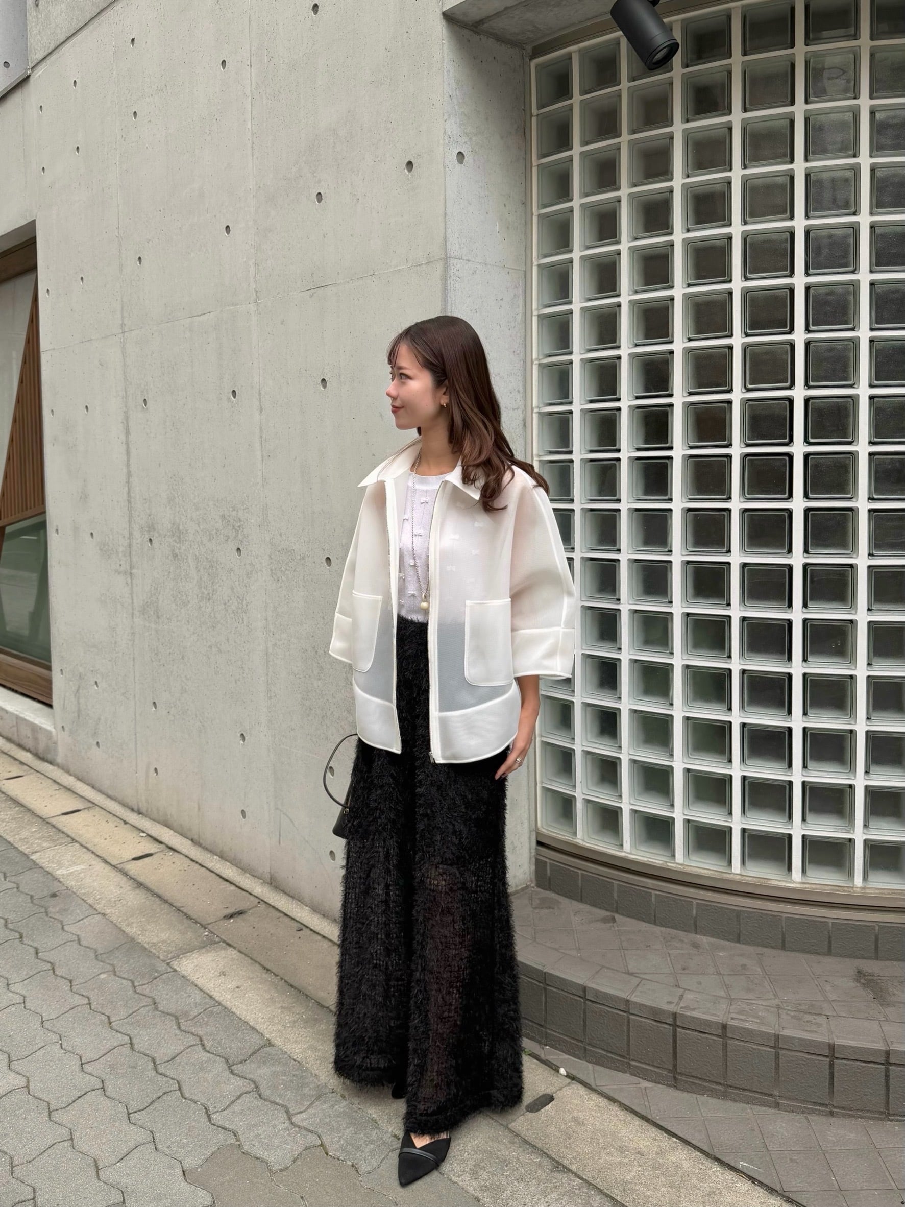 素材は、20デニールのポリエステル糸を使用した、ダブルラッセル素材を採用。分織ならではのハリ感と、程よい透け感を兼ね備え、軽やかさと構築的なフォルムを両立しています。とても軽く、長時間の着用でもストレスフリーな着心地が特徴です。ご自宅でのお洗濯も可能です。(手洗い推奨)