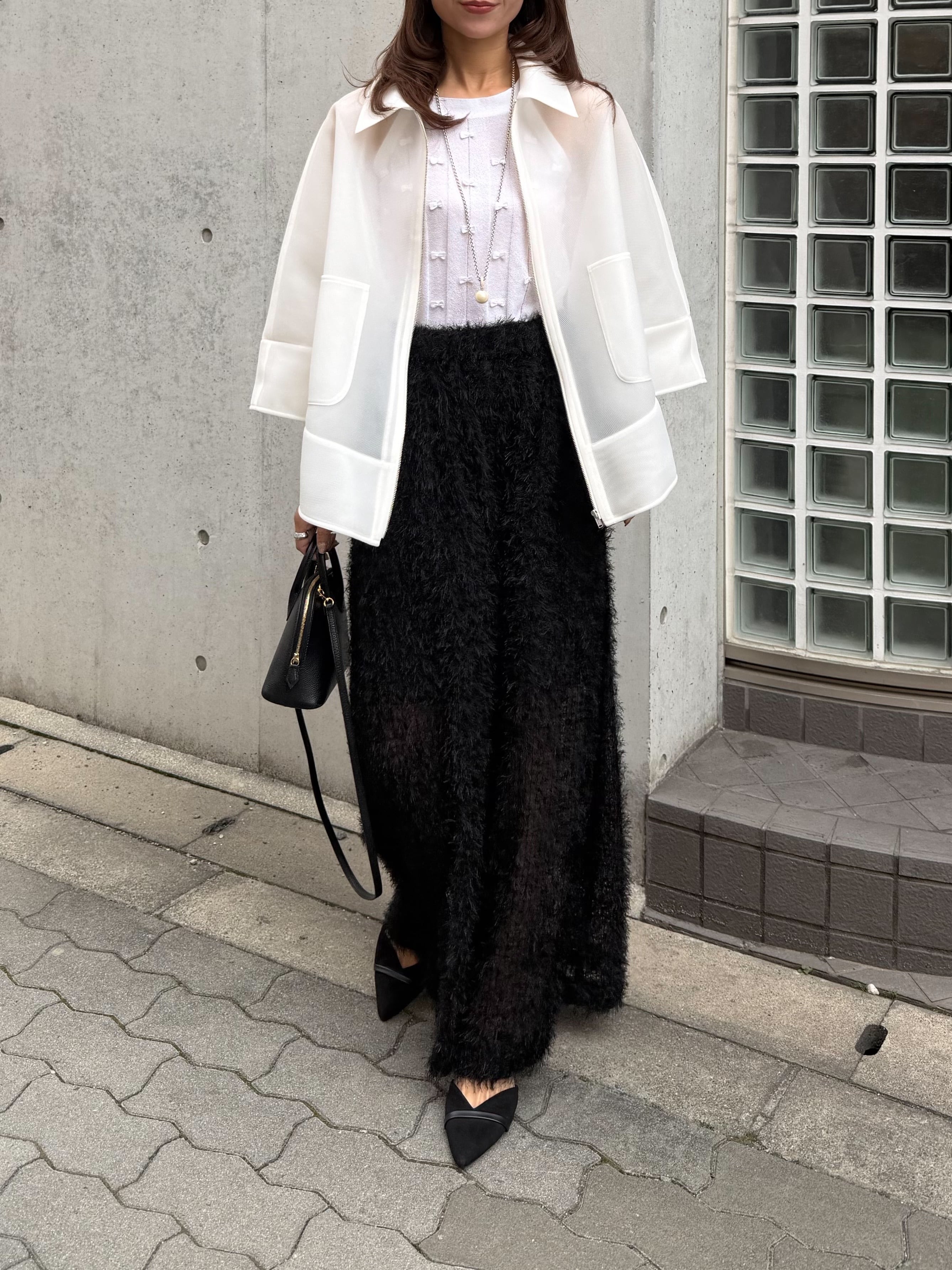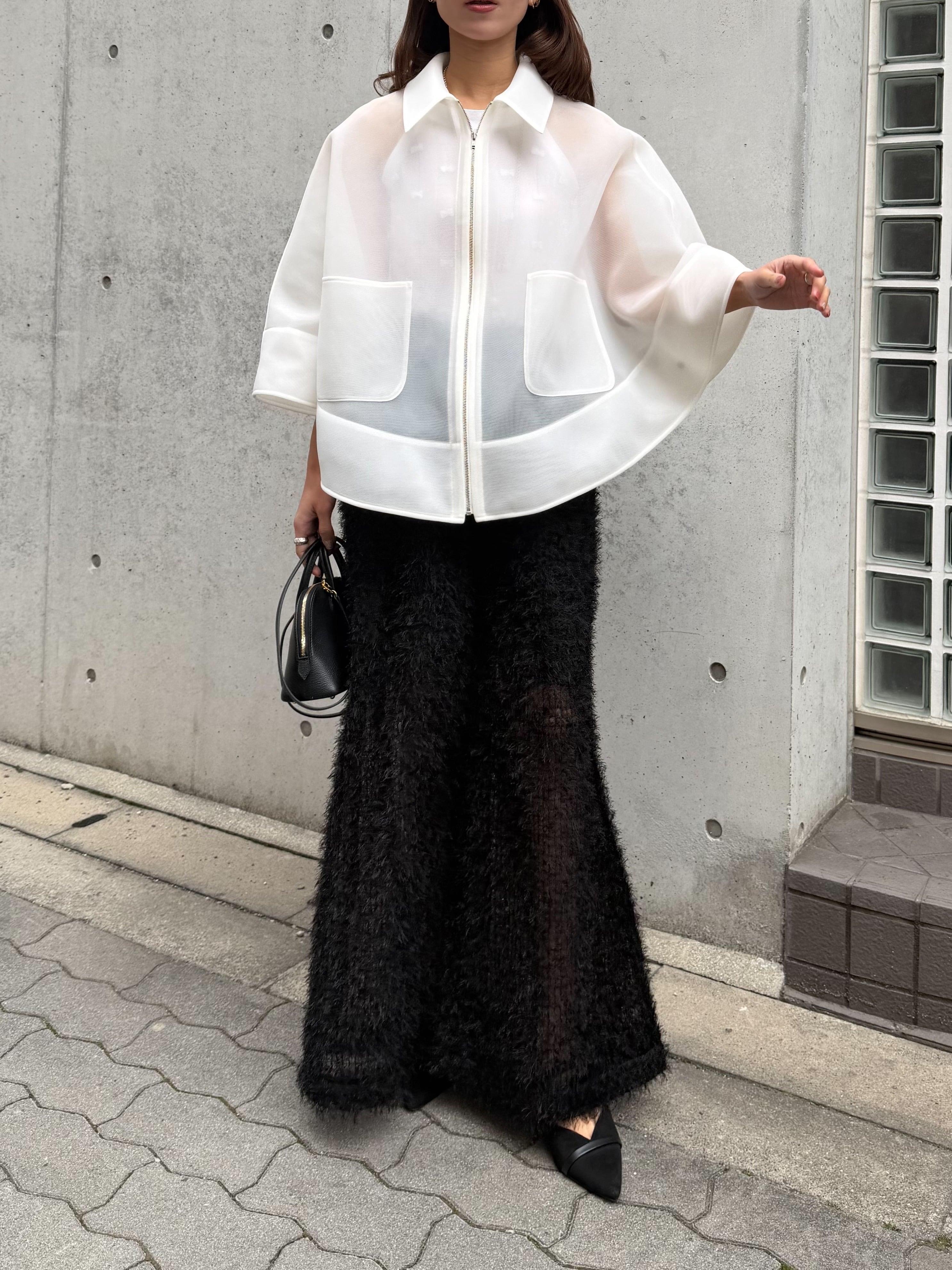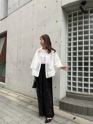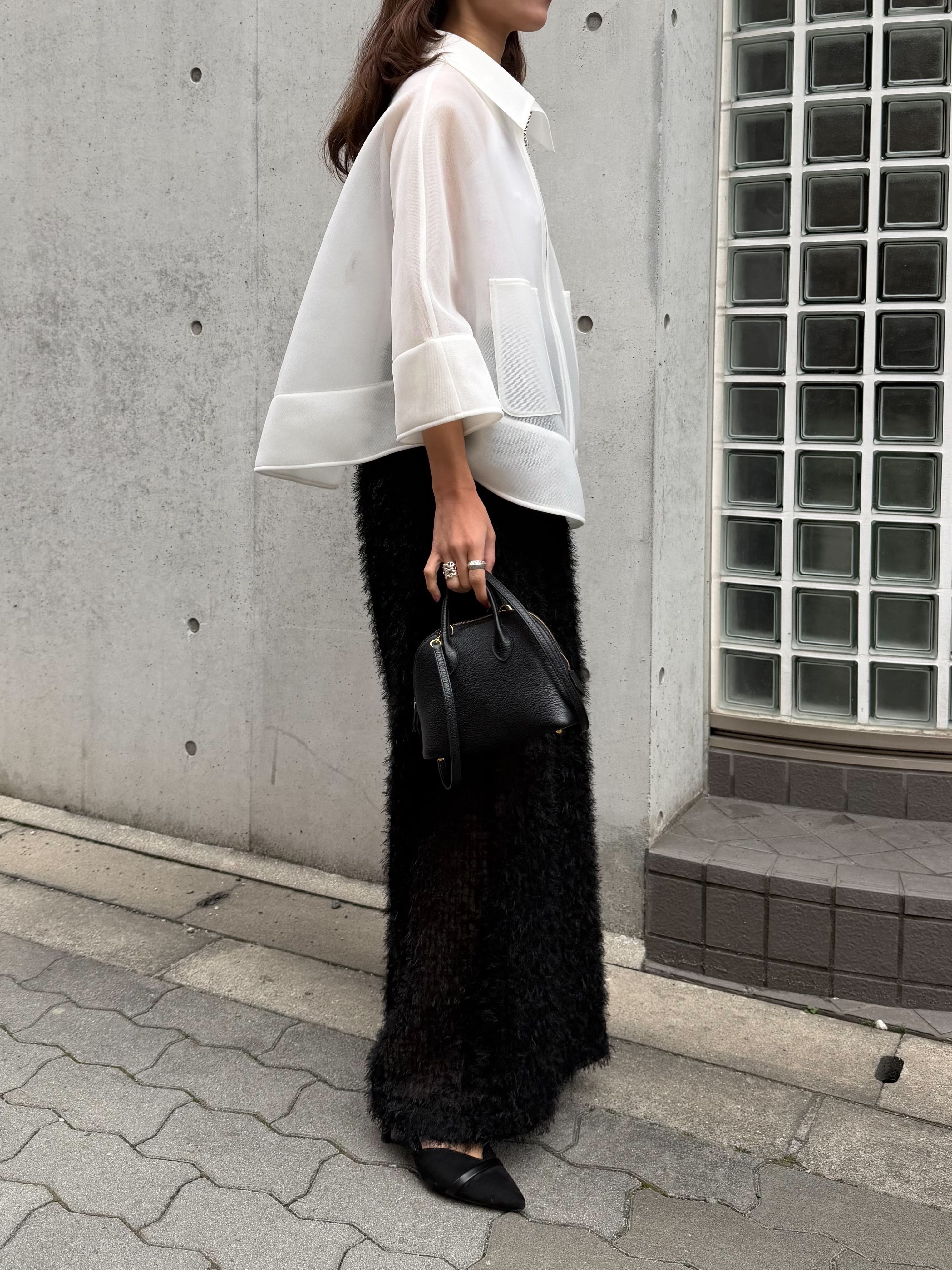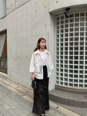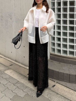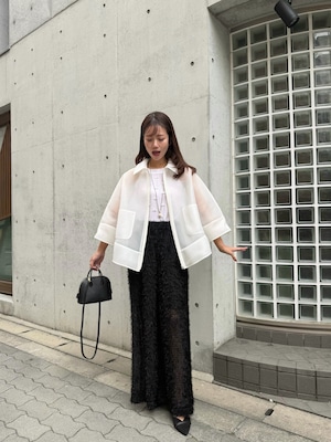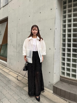 素材は、20デニールのポリエステル糸を使用した、ダブルラッセル素材を採用。分織ならではのハリ感と、程よい透け感を兼ね備え、軽やかさと構築的なフォルムを両立しています。とても軽く、長時間の着用でもストレスフリーな着心地が特徴です。ご自宅でのお洗濯も可能です。(手洗い推奨)