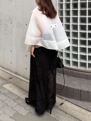 軽やかに纏える、Aラインシルエットのケープデザイン。動くたびに空気を含み、柔らかく広がる立体的なフォルムが、上品で洗練された印象を演出します。