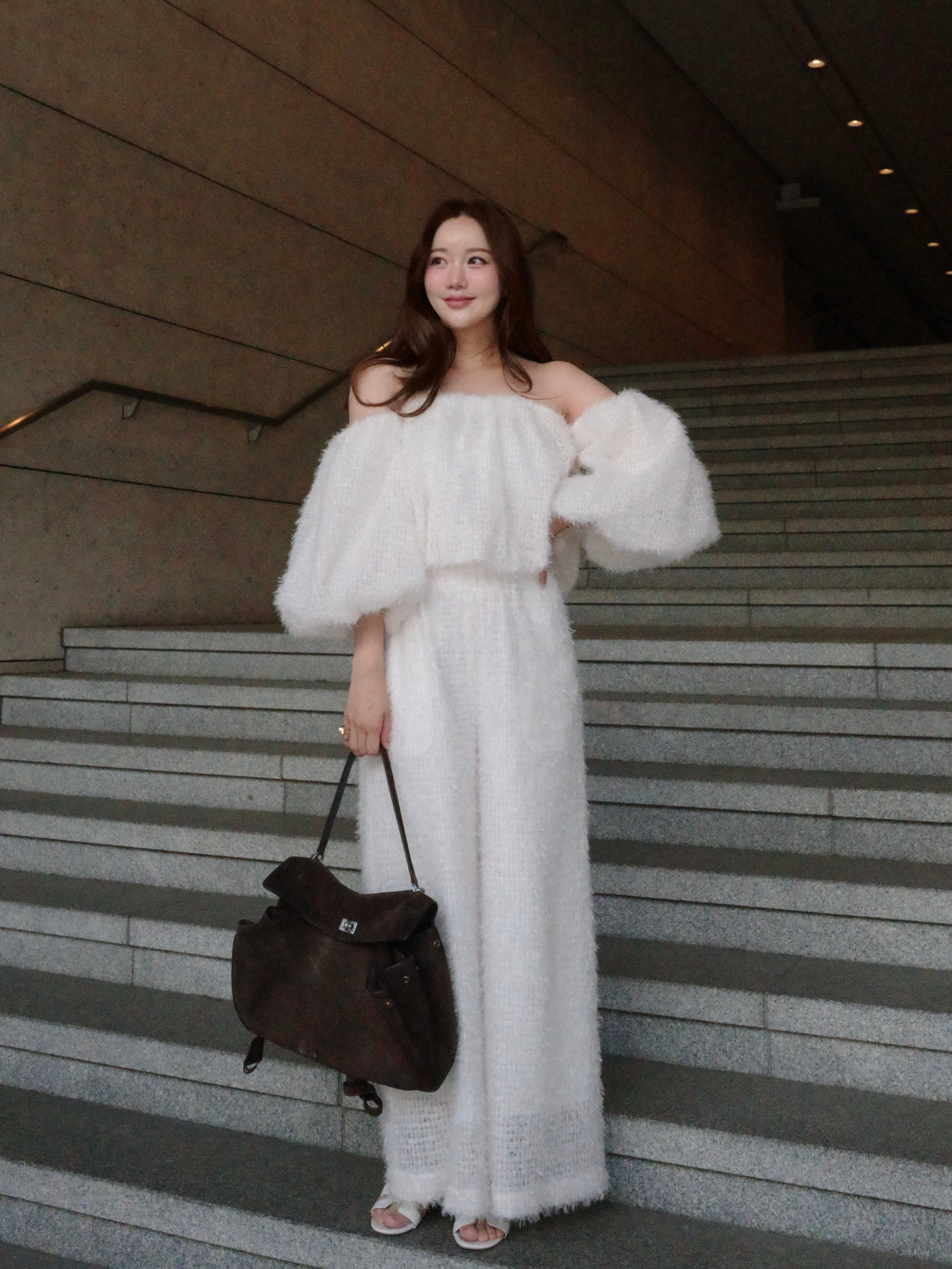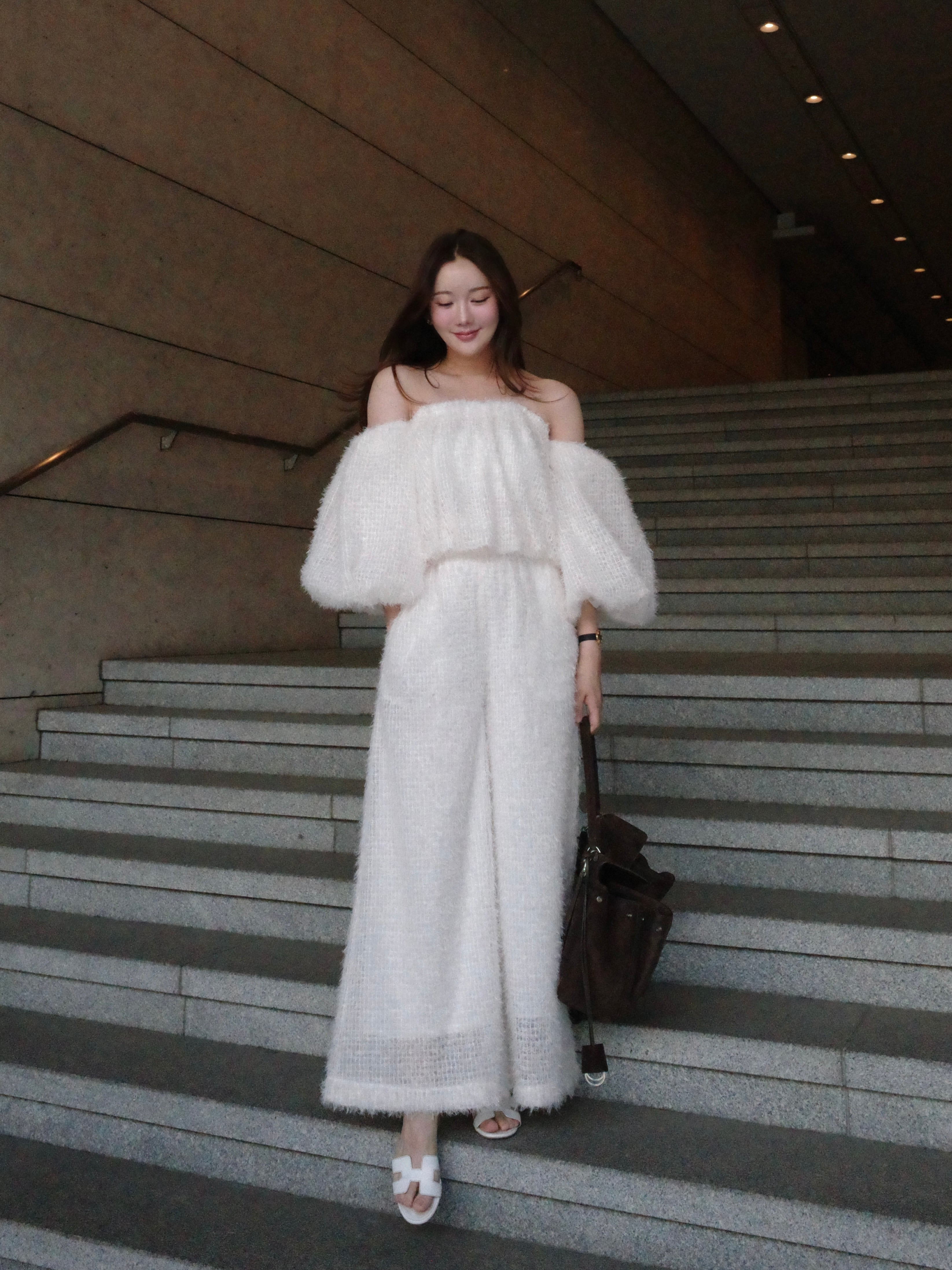 軽やかさと華やかさを兼ね備えた、チュールシャギーパンツ。ウエストはゴム仕様で、リラックス感のある履き心地。身体のラインを拾いにくいストレートシルエットで、ラフに履けるのに上品な印象に仕上げています。ブラックは腿あたりまで、ホワイトは裾まで裏地を付けることで、透け感のバランスにも配慮。軽やかな見た目はそのままに、安心して着用いただける仕様にしています。