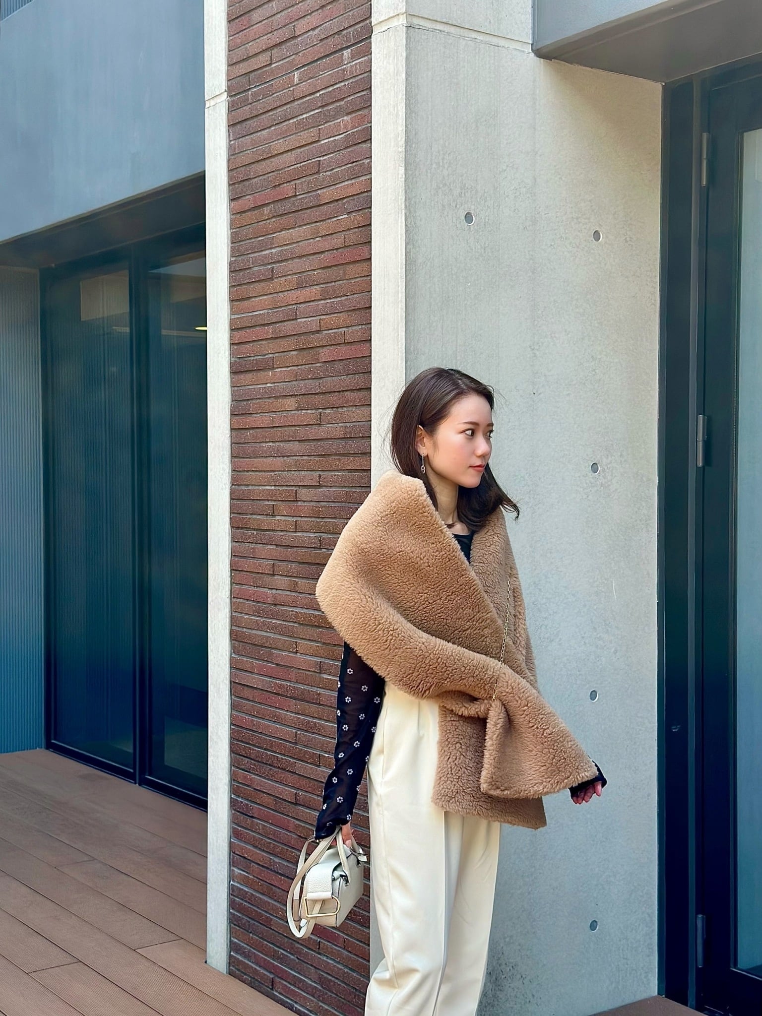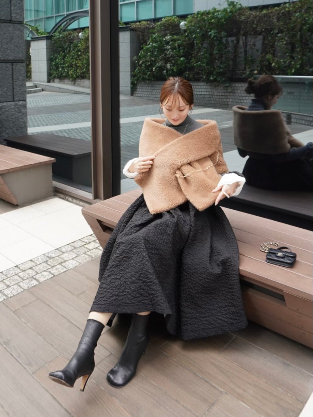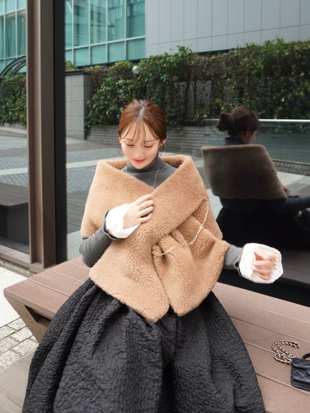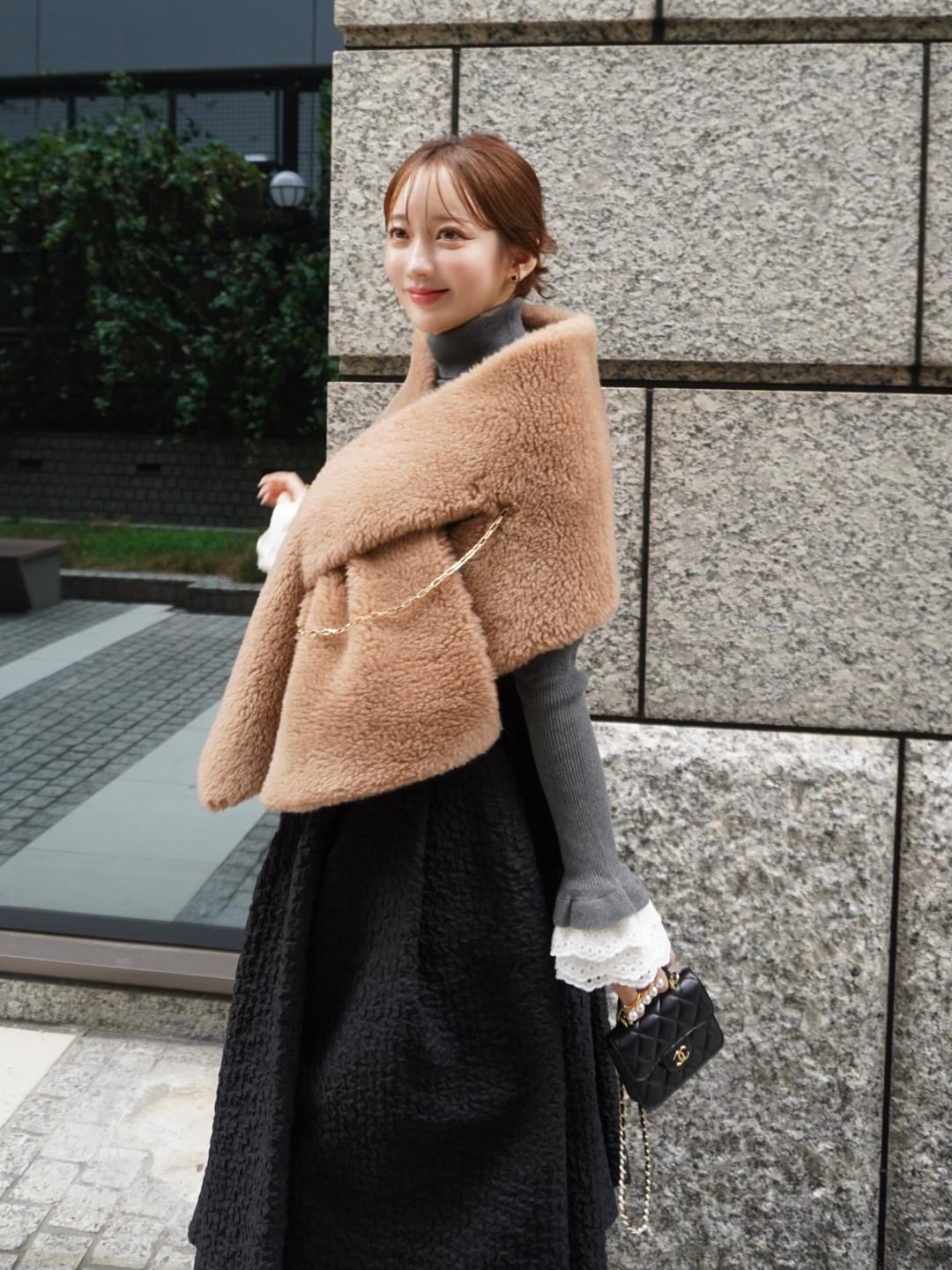 モコモコの素材感が女性らしいボア素材を使⽤したストールは、サラりと⽻織るだけでスタイリングのポイントになるアイテムです。ボアにゴールドチェーンを施すことで⼤⼈っぽく仕上げました。(チェーンは取り外し可能です)⾸元に軽くひと結びするだけで、スタイリングが完成します。素材はウール⾼混率の為、とても暖かく保温性に優れています。